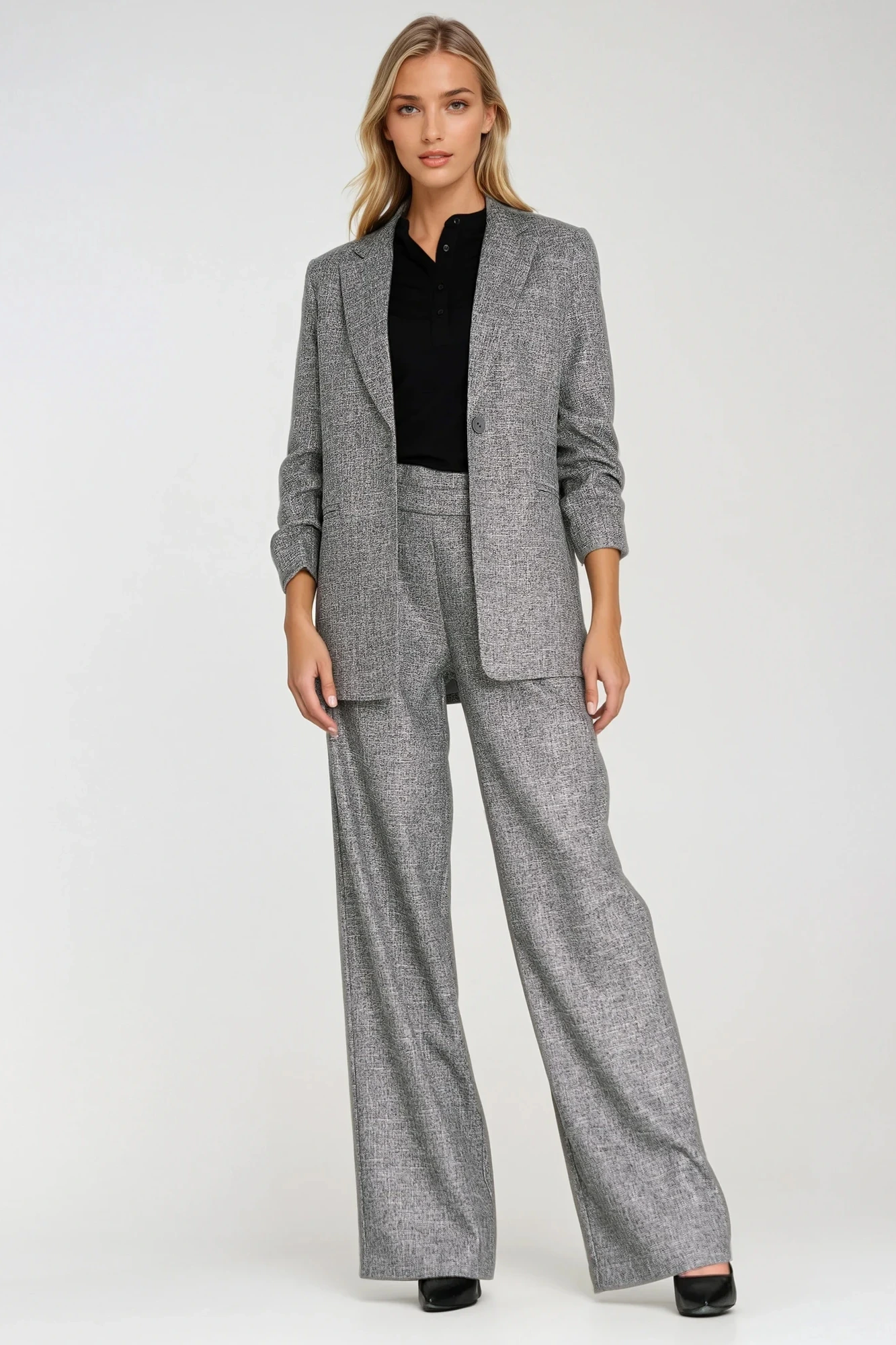• Jednorzędowe zapięcie na guzik — podkreśla minimalistyczny design