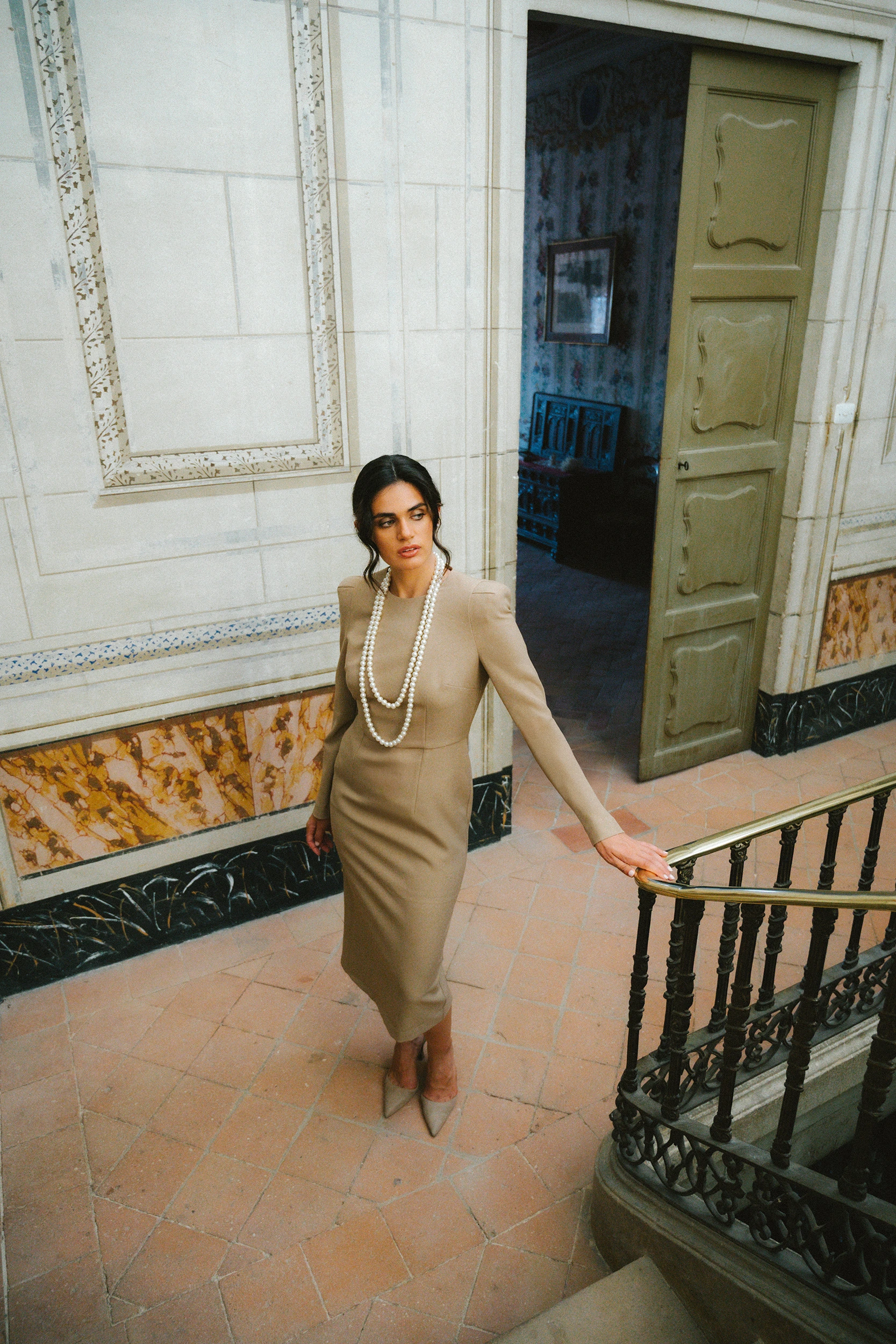Beżowa elegancka sukienka midi na komunię to doskonały wybór dla kobiet, które szukają klasycznej i dopracowanej stylizacji na wyjątkową uroczystość. Stonowany, jasny odcień pięknie wpisuje się w charakter przyjęcia komunijnego, podkreślając subtelność i ponadczasową elegancję. Prosty, kobiecy fason delikatnie modeluje sylwetkę, a długość midi dodaje całości szyku i uniwersalności. Długie rękawy oraz zabudowany dekolt sprawiają, że model prezentuje się wyjątkowo schludnie i stylowo. To sukienka na komunię, która świetnie sprawdzi się zarówno podczas ceremonii, jak i na rodzinnym przyjęciu.