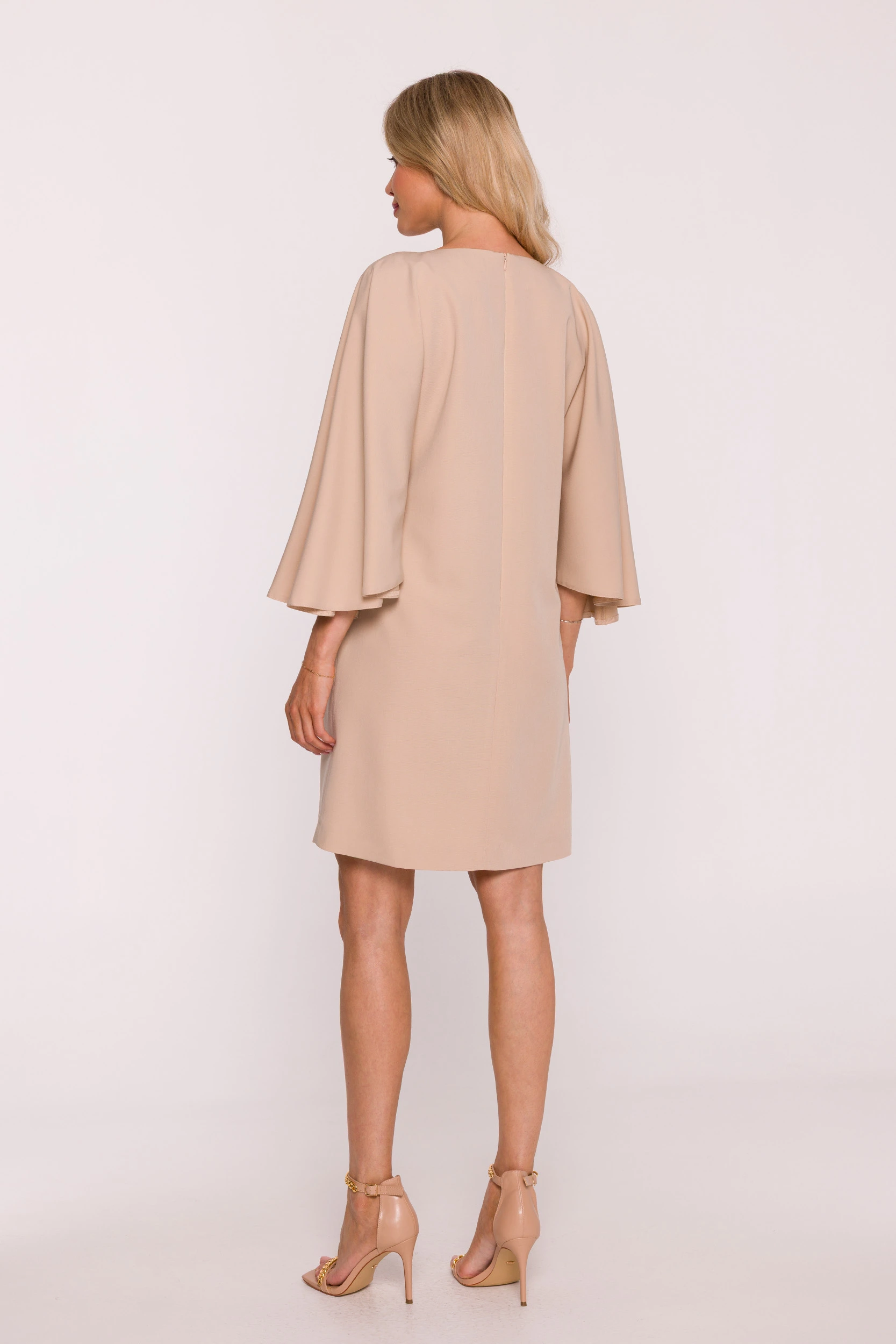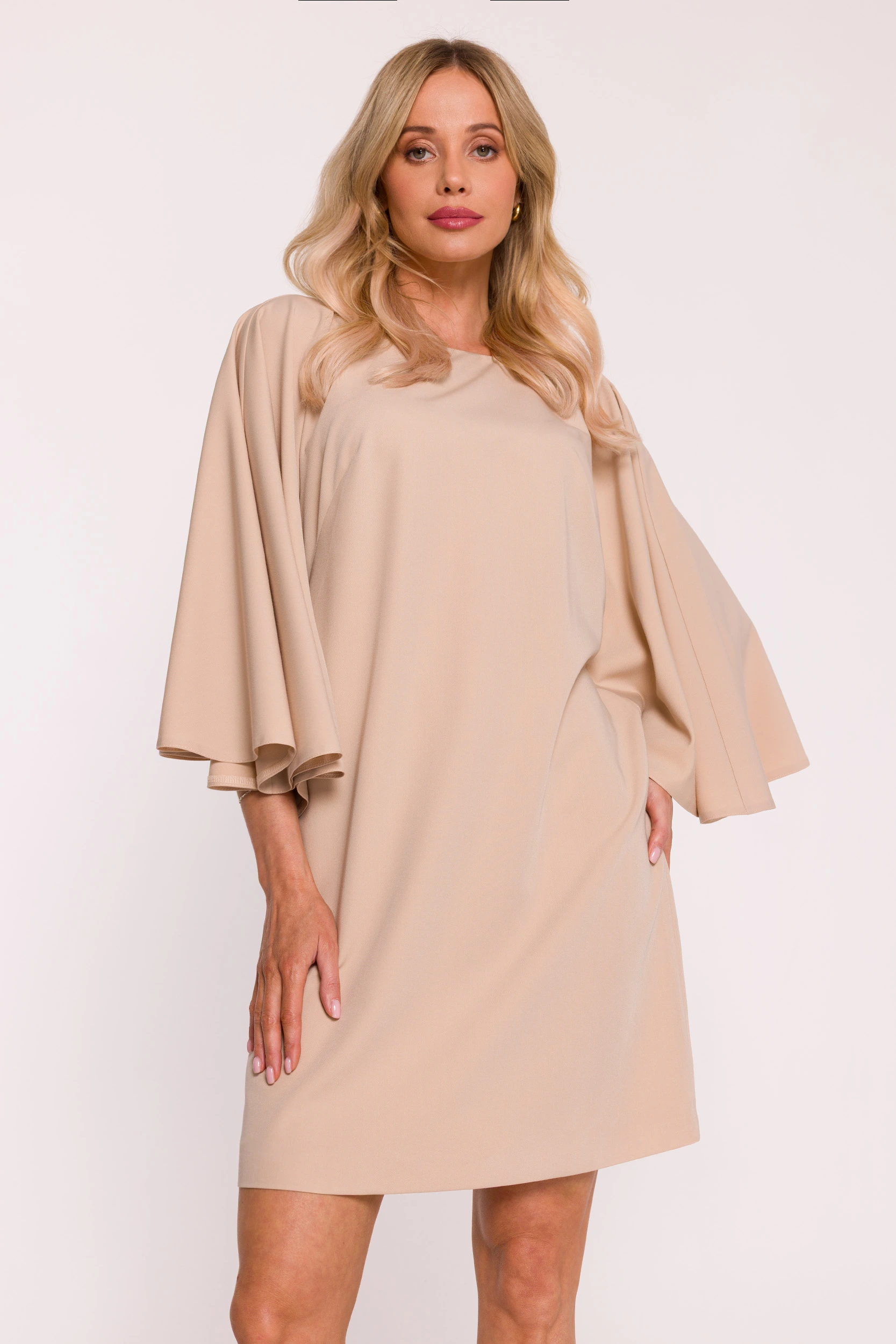 Beżowa sukienka na komunię z luźnym fasonem i szerokim rękawem to elegancka propozycja dla kobiet, które szukają stylowej i komfortowej kreacji na uroczystość Pierwszej Komunii Świętej. Subtelny beżowy kolor podkreśla ponadczasowy charakter modelu i świetnie wpisuje się w klimat rodzinnych, wiosennych uroczystości. Prosty, swobodny krój pięknie układa się na sylwetce, zapewniając wygodę noszenia oraz szykowny wygląd przez cały dzień. To idealna sukienka na komunię dla mamy, chrzestnej lub gościa, która ceni minimalistyczną elegancję i nowoczesną formę.
