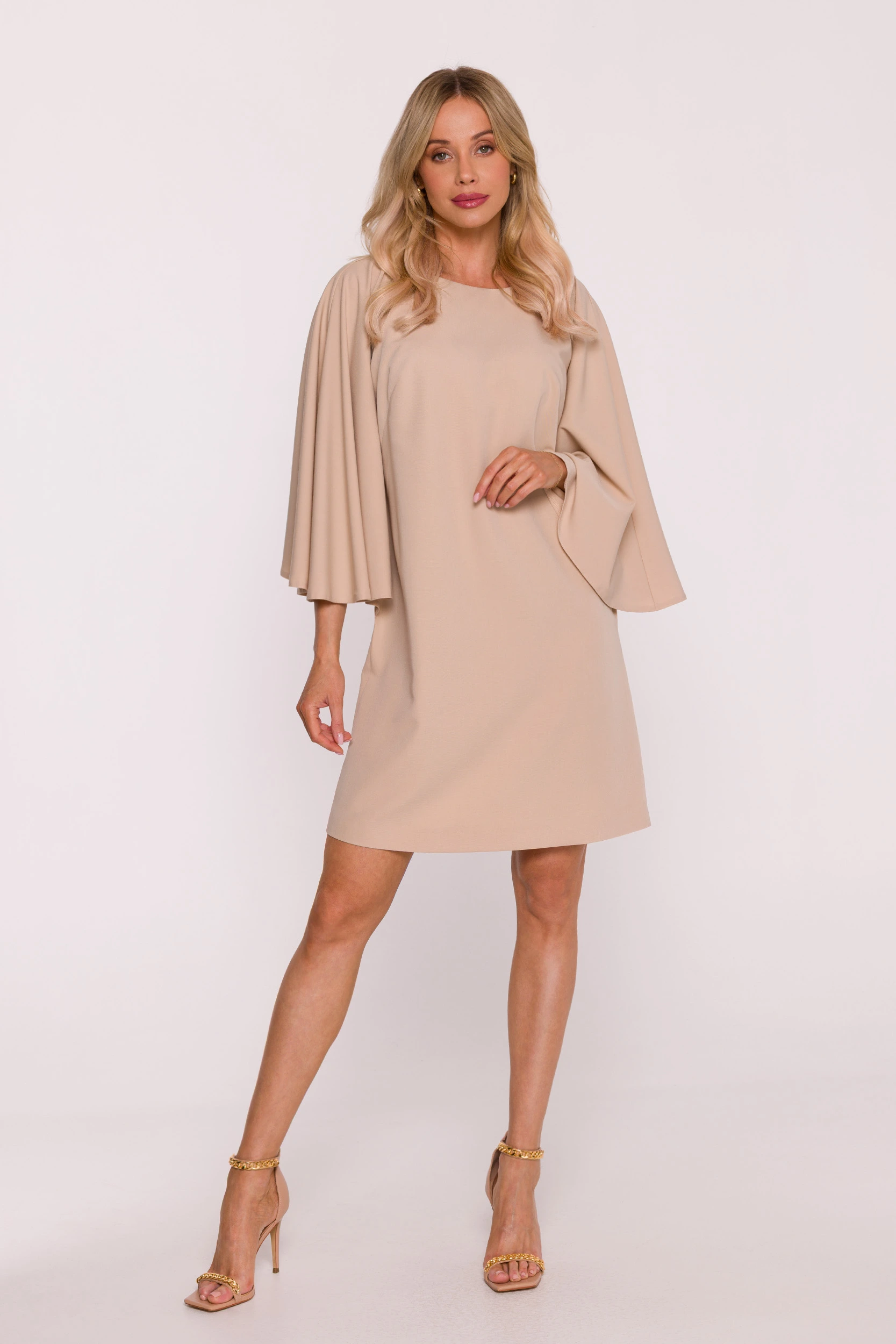 Beżowa sukienka na komunię z luźnym fasonem i szerokim rękawem