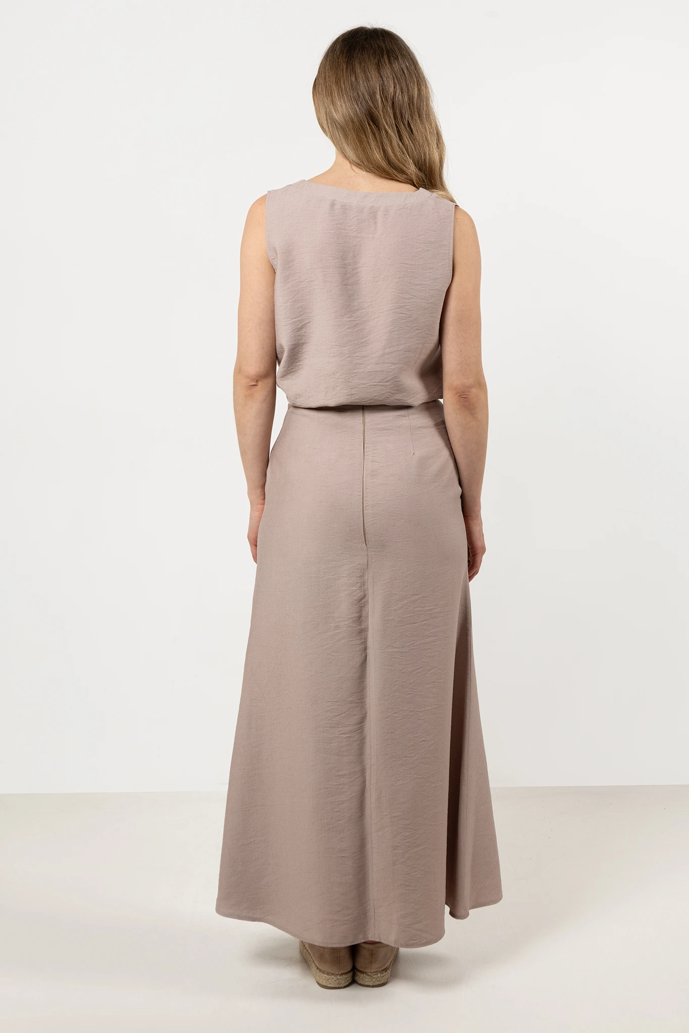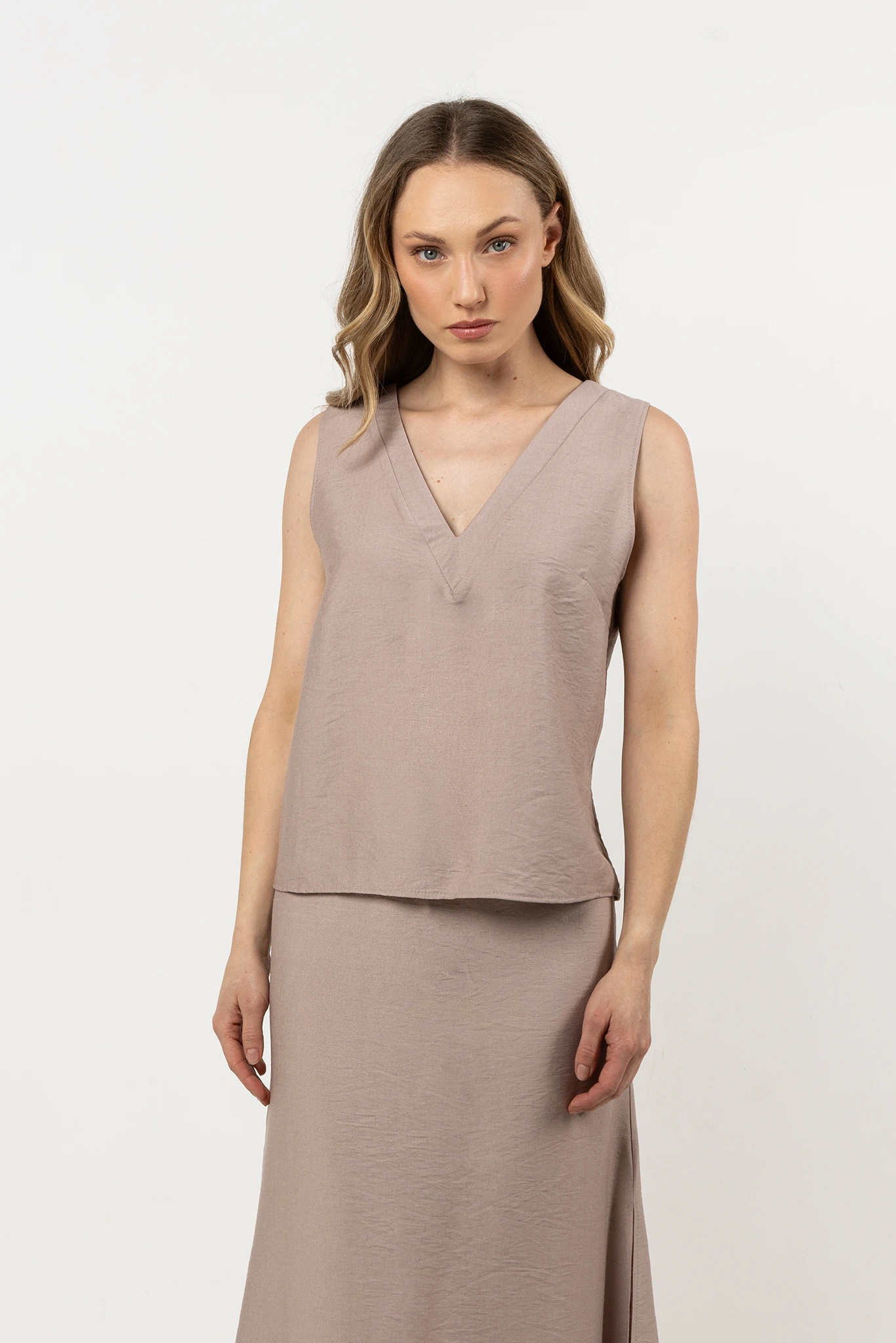 Bluzka bez rękawów z dekoltem w serek, łącząca elegancję z wygodą. Wykonana z lekkiego, przewiewnego materiału, który zapewnia komfort noszenia przez cały dzień. Dekolt w kształcie litery V subtelnie wysmukla szyję i dodaje całości delikatnego, kobiecego wyrazu.