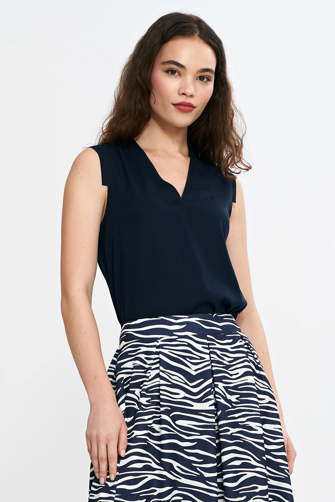 Wykonana z lekkiej, przyjemnej w dotyku tkaniny, świetnie układa się na sylwetce, tworząc gładką i estetyczną linię. Wycięcia przy ramionach zostały zaprojektowane z dbałością o detale – delikatnie zaokrąglone i starannie wykończone. Model ten świetnie komponuje się zarówno ze spodniami, jak i ze spódnicą, dając wiele możliwości stylizacyjnych.