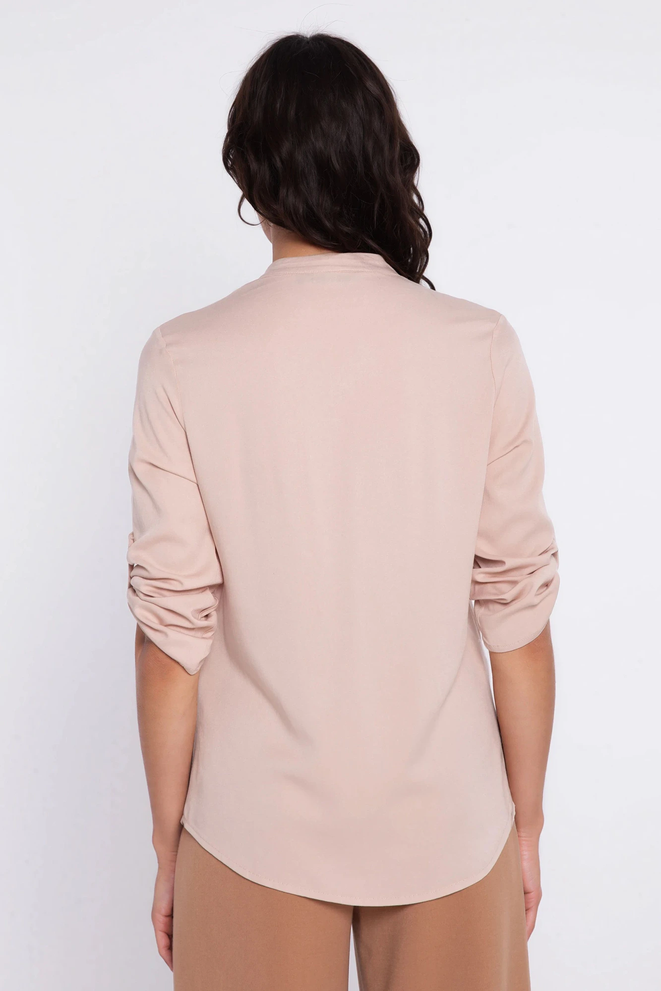 Bluzka damska o eleganckim, swobodnym fasonie to doskonały wybór do stylizacji biurowych, codziennych i smart casual. Lekko lejący materiał pięknie układa się na sylwetce, zapewniając komfort noszenia przez cały dzień. Dekolt w kształcie litery V z subtelną stójką nadaje całości nowoczesny i kobiecy charakter. Dodatkowym atutem są rękawy z możliwością podpięcia, dzięki którym model zyskuje praktyczny i uniwersalny wymiar.