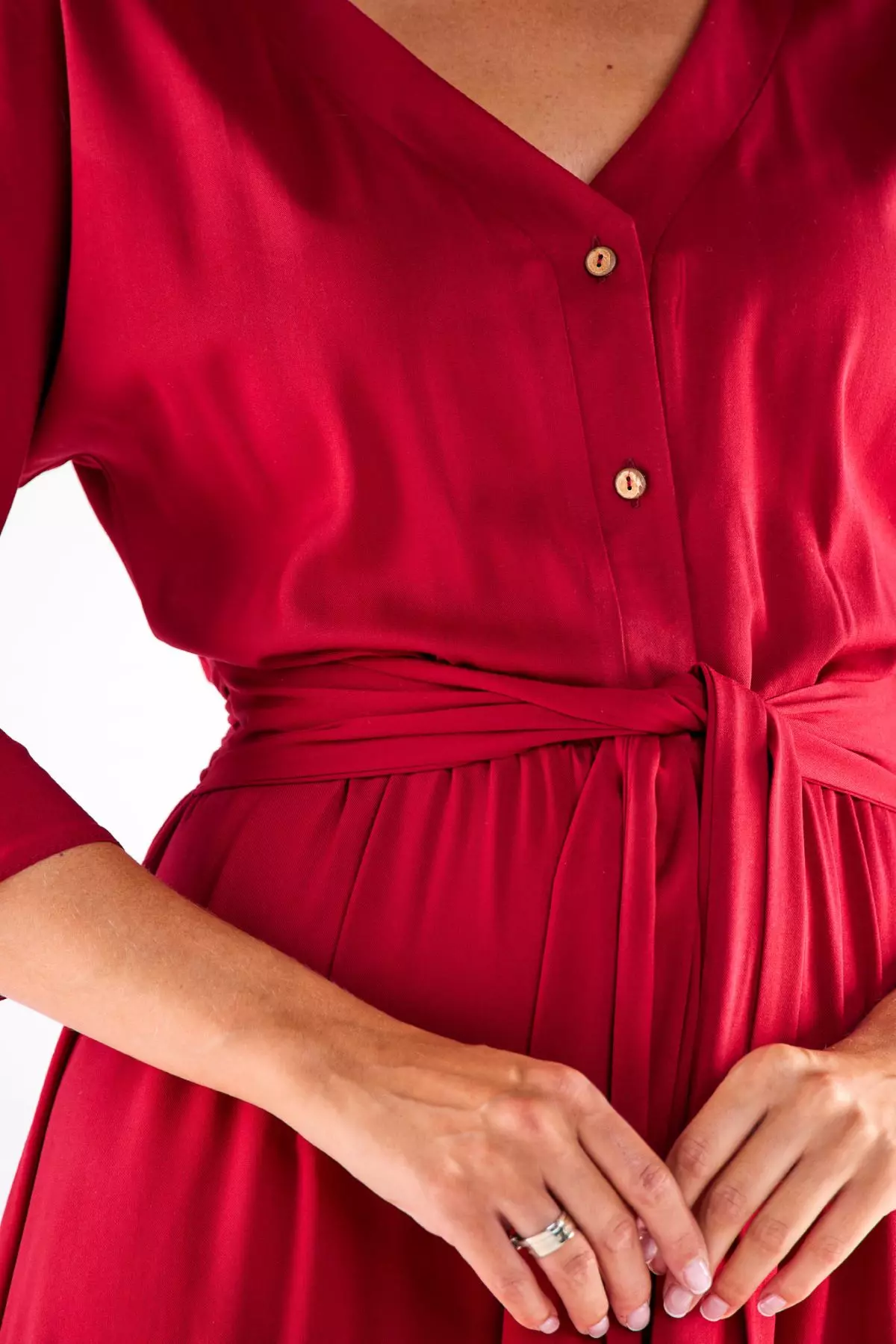 Bordowa sukienka z paskiem na wigilię firmową to stylowa propozycja dla kobiet ceniących klasyczną elegancję i komfort. Sukienka ma dekolt w kształcie litery V oraz ozdobne guziki z przodu, które dodają jej subtelnego uroku. Pasek w talii pozwala na podkreślenie sylwetki, a długość za kolano sprawia, że jest idealna zarówno na codzienne, jak i bardziej formalne okazje. Wykonana z lekkiego, przyjemnego materiału, zapewnia swobodę ruchów i doskonale sprawdza się w cieplejsze dni.