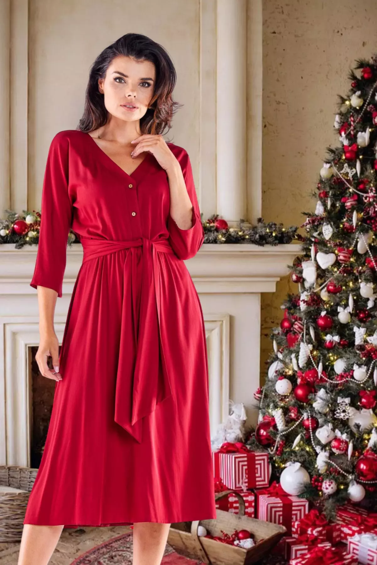 Bordowa sukienka z paskiem na wigilię firmową