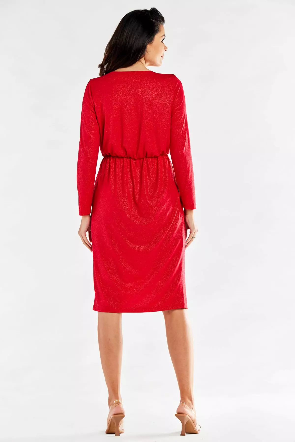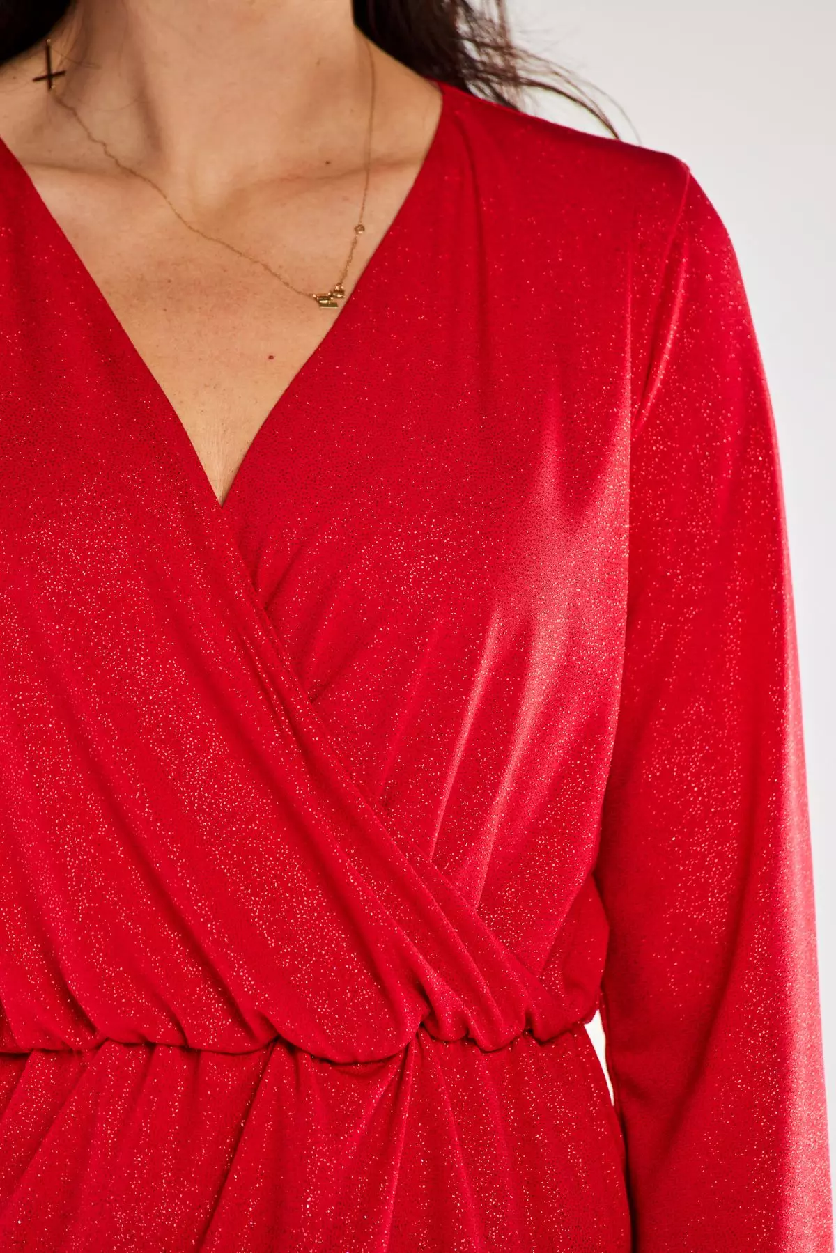 Czerwona sukienka na wigilie to elegancka propozycja uszyta z delikatnej tkaniny z brokatem. Zakładany fason pozwala modelować sylwetkę nadając jej filigranowych kształtów. Długi rękaw świetnie współgra z kopertowym dekoltem. Długość przed kolano wydłuża optycznie nogi. Czerwona sukienka na wigilię pozwoli Ci jeszcze bardziej poczuć magię świąt!