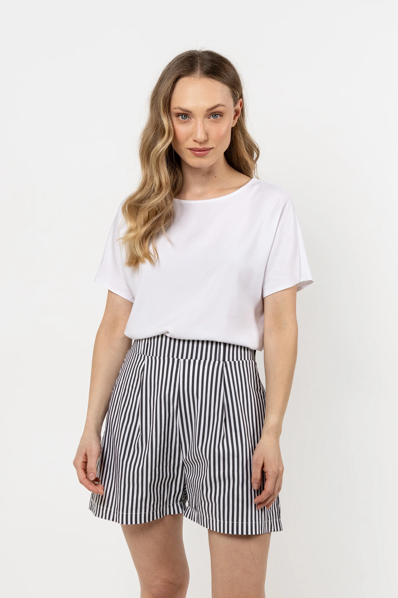 Damskie spodenki w paski z kieszeniami i elastycznym pasem - te lekkie spodenki to połączenie klasycznej elegancji i casualowego stylu, które doskonale sprawdzi się w codziennych stylizacjach. Wysoki stan pięknie podkreśla talię, a luźny krój zapewnia wygodę i swobodę ruchów. To idealna opcja na letnie dni, kiedy komfort idzie w parze z modnym wyglądem.