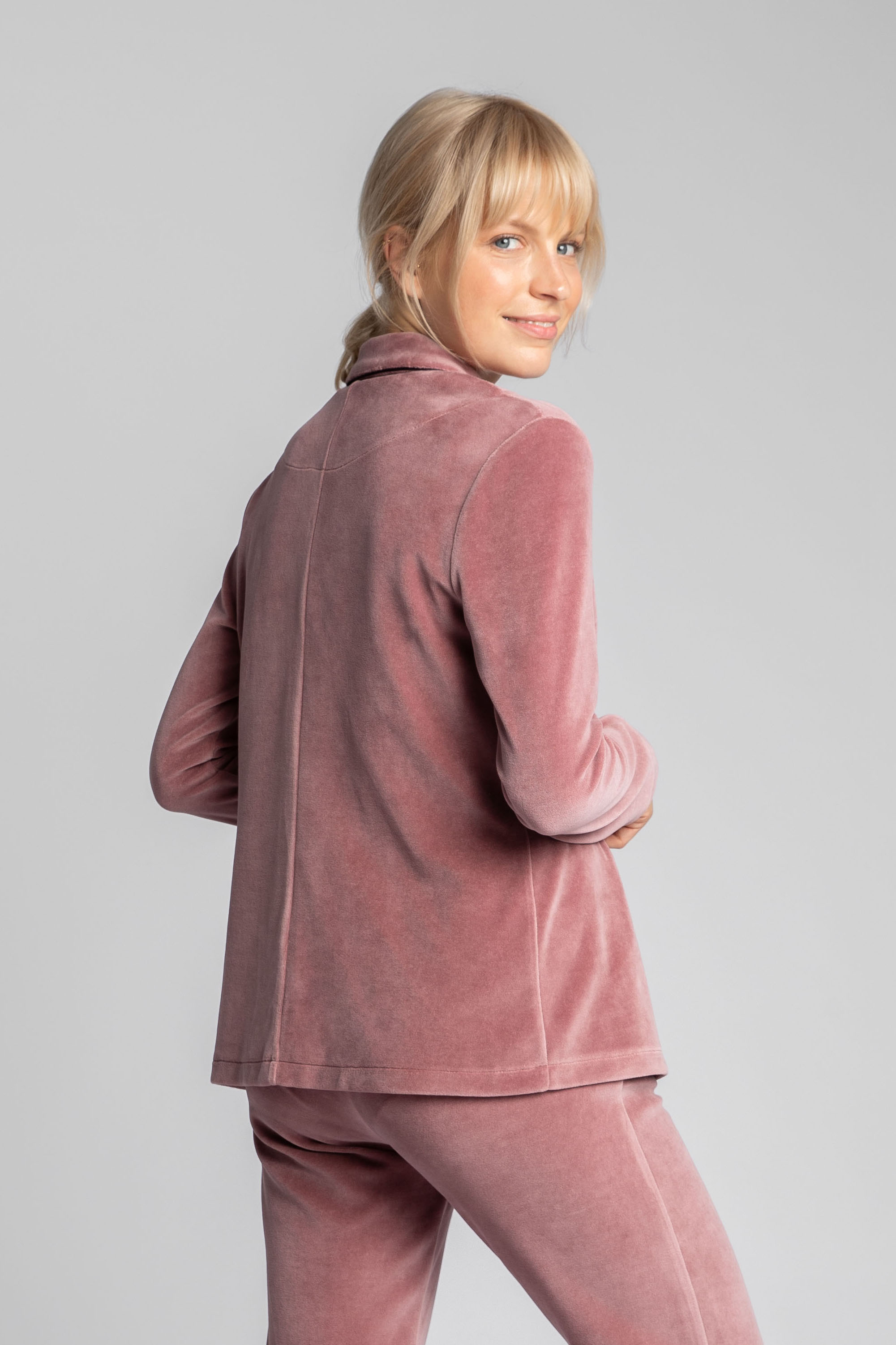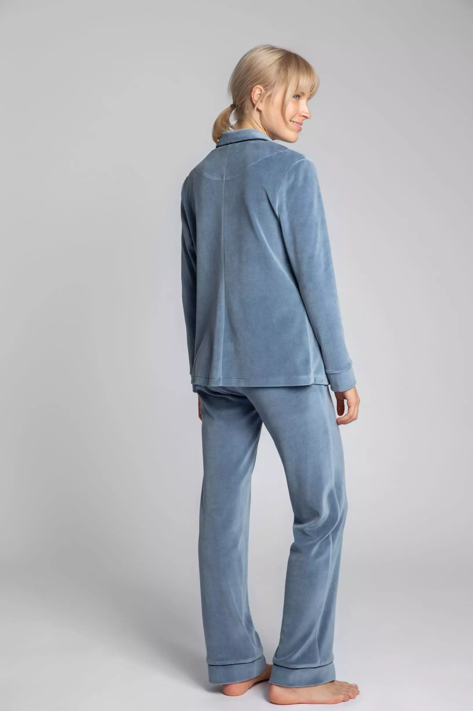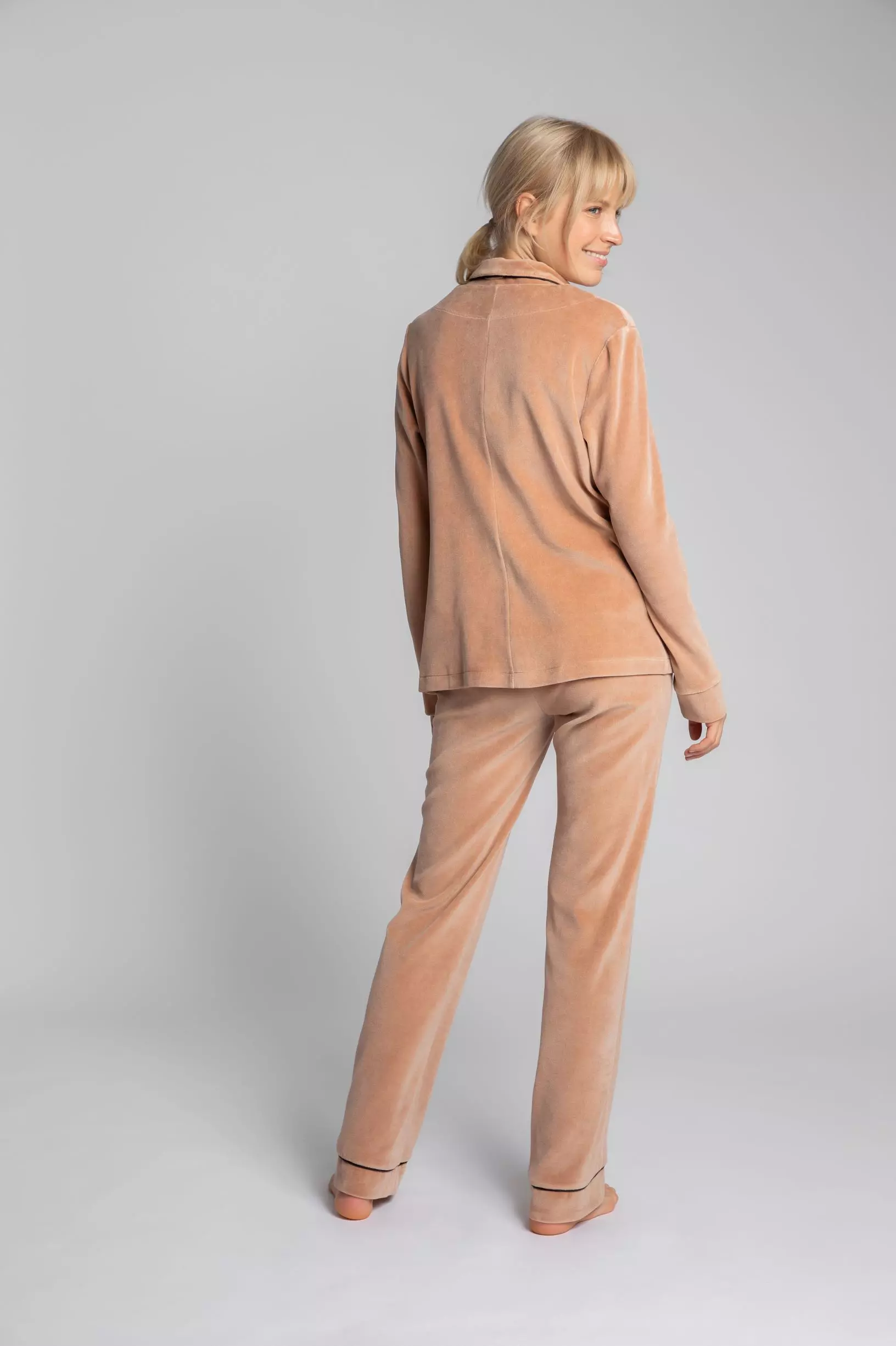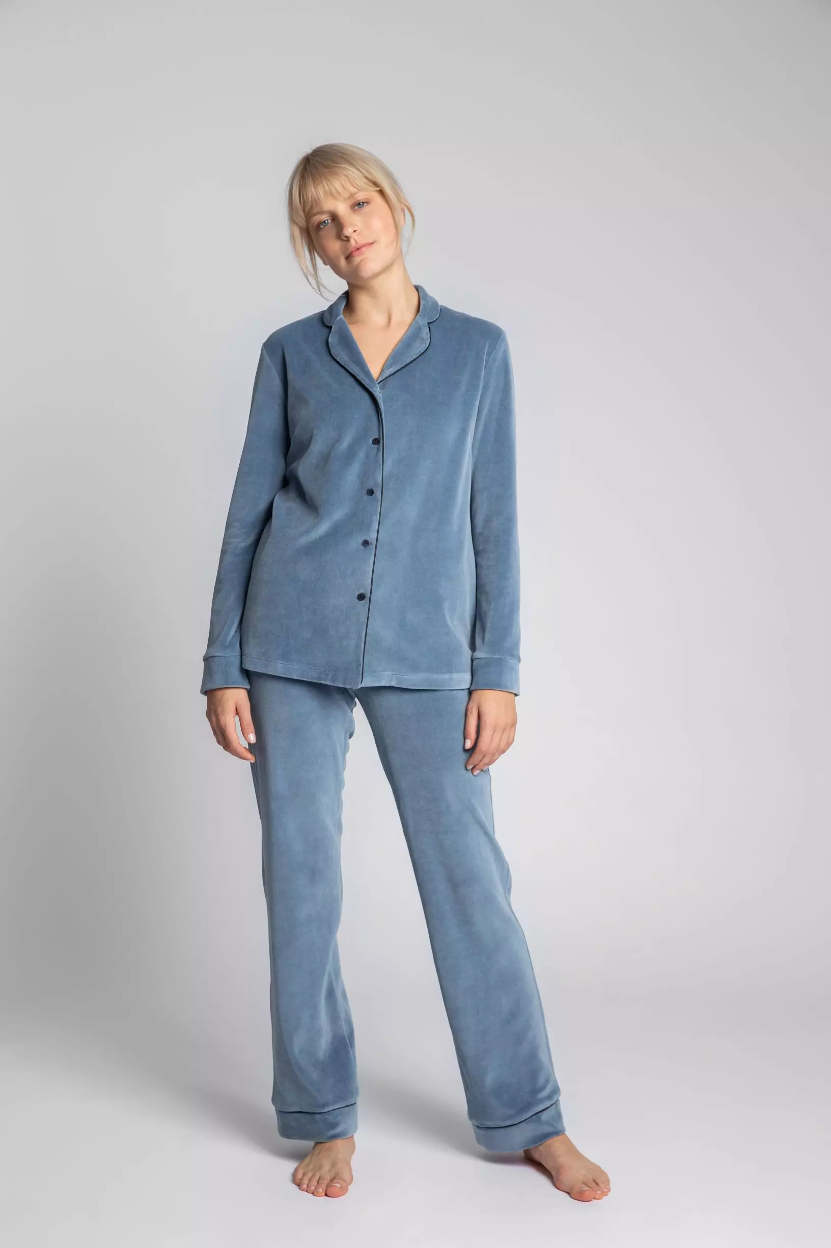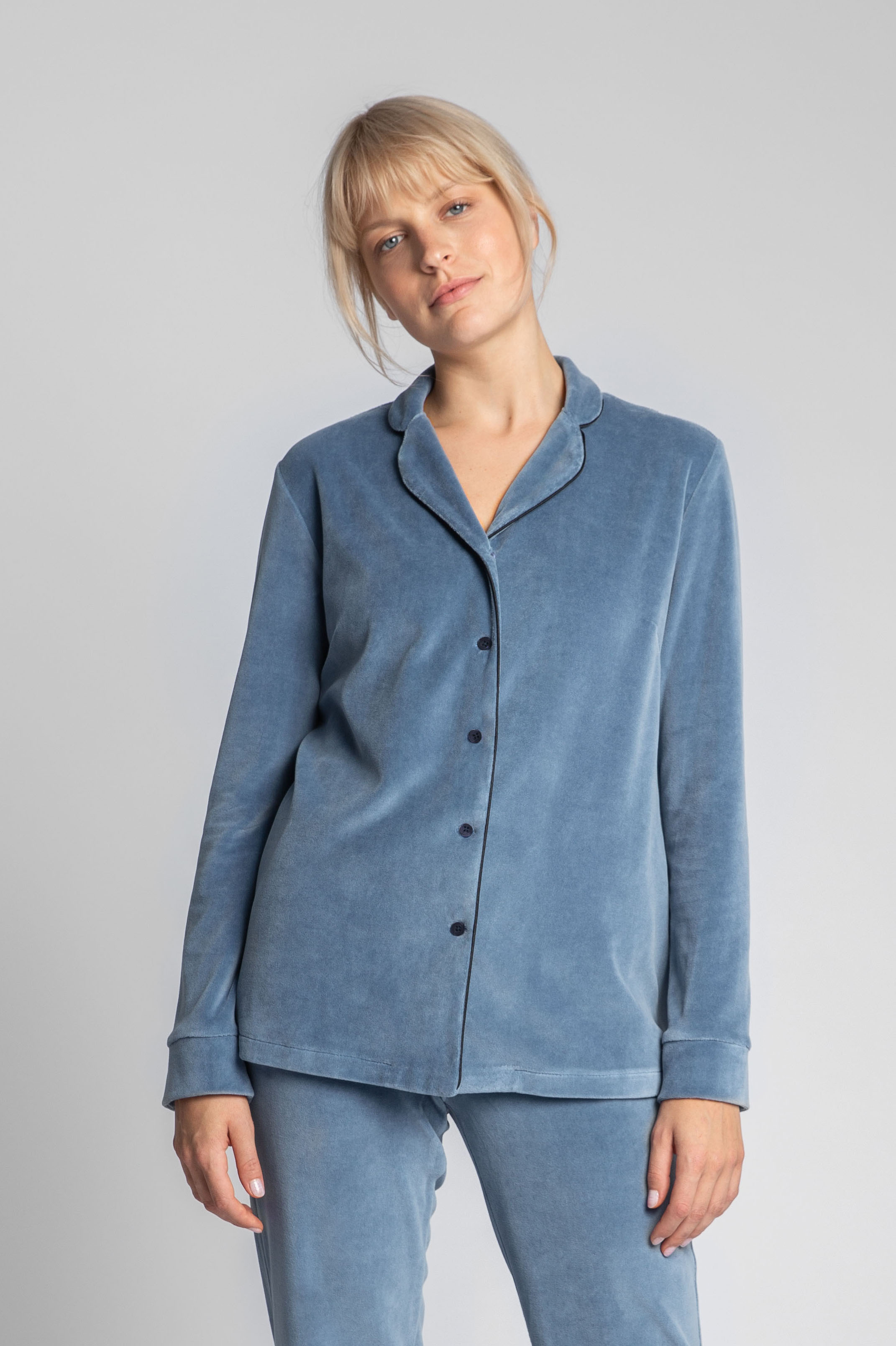 Elegancka koszula piżamowa z weluru to wyjątkowy model uszyty z miękkiego i ciepłego materiału, który z pewnością przypadnie do gustu wielbicielkom domowego komfortu. Fason klasycznej koszuli z kołnierzykiem, karczkiem i guzikami, został wykorzystany do stworzenia welurowej piżamy, która zachwyca zarówno estetyką, jak i wygodą podczas noszenia. Szykowna góra będzie świetnie wyglądała ze spodniami z pasującego materiału.