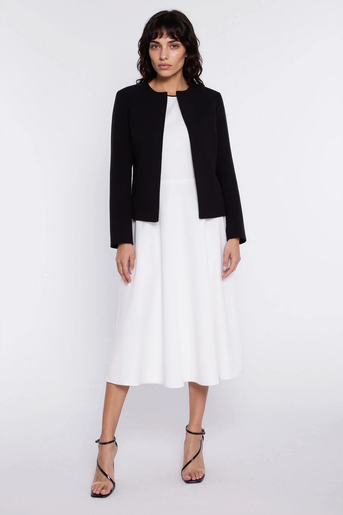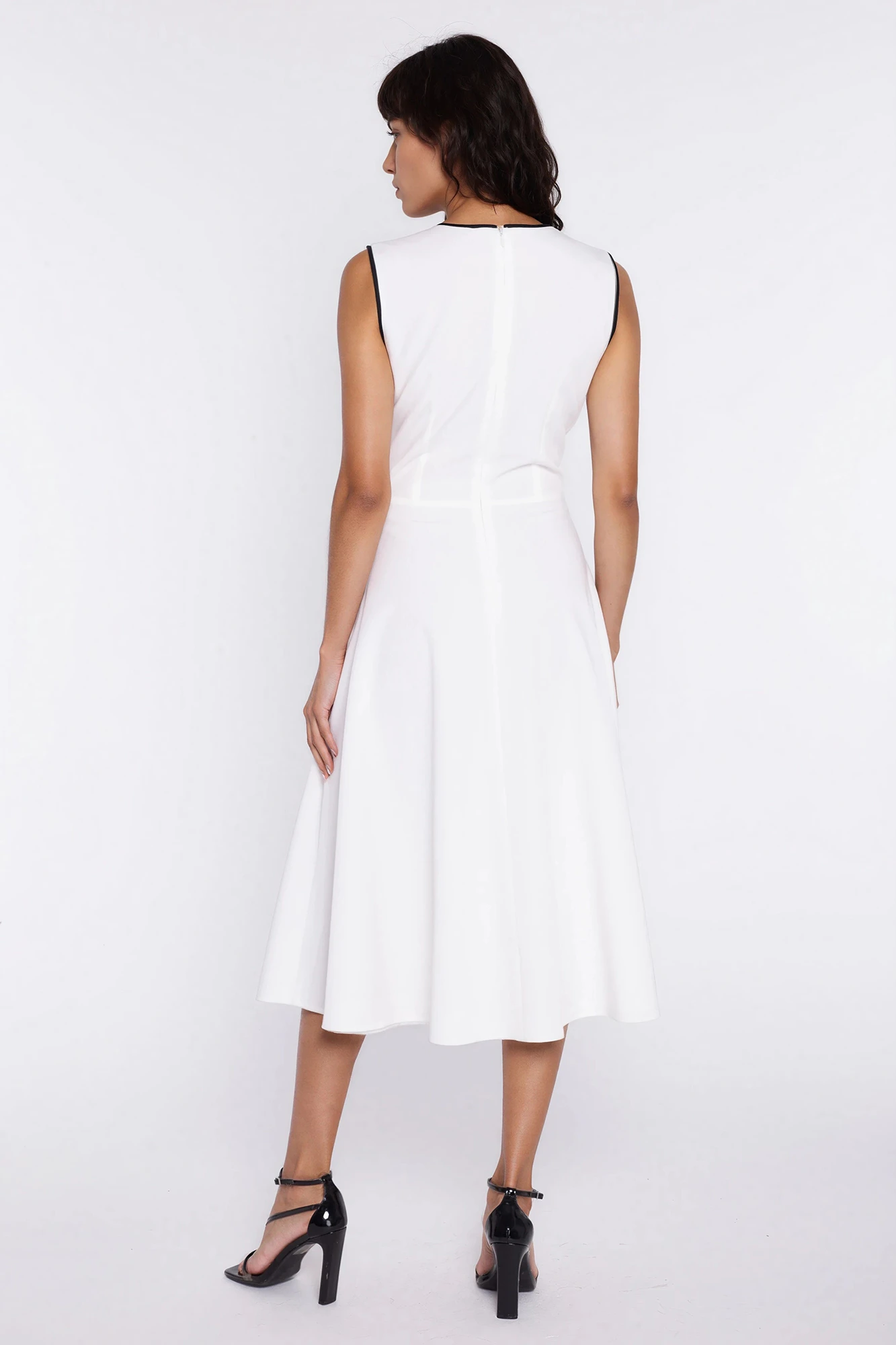 Elegancka sukienka midi bez rękawów z rozkloszowanym dołem zachwyca ponadczasowym fasonem, który pięknie podkreśla sylwetkę i sprawdza się przy wielu okazjach. Dopasowana góra oraz wyraźnie zaznaczona talia nadają całości kobiecego charakteru, a rozkloszowany dół dodaje lekkości i swobody ruchów. Minimalistyczna forma została uzupełniona subtelnym kontrastowym wykończeniem przy dekolcie i pachach, co podkreśla elegancki styl modelu. To idealna sukienka na przyjęcie, do pracy, na rodzinne uroczystości lub inne wyjątkowe wyjścia.