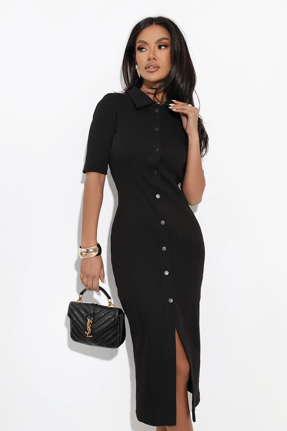 Elegancka sukienka midi na guziki z kołnierzykiem i rozcięciem