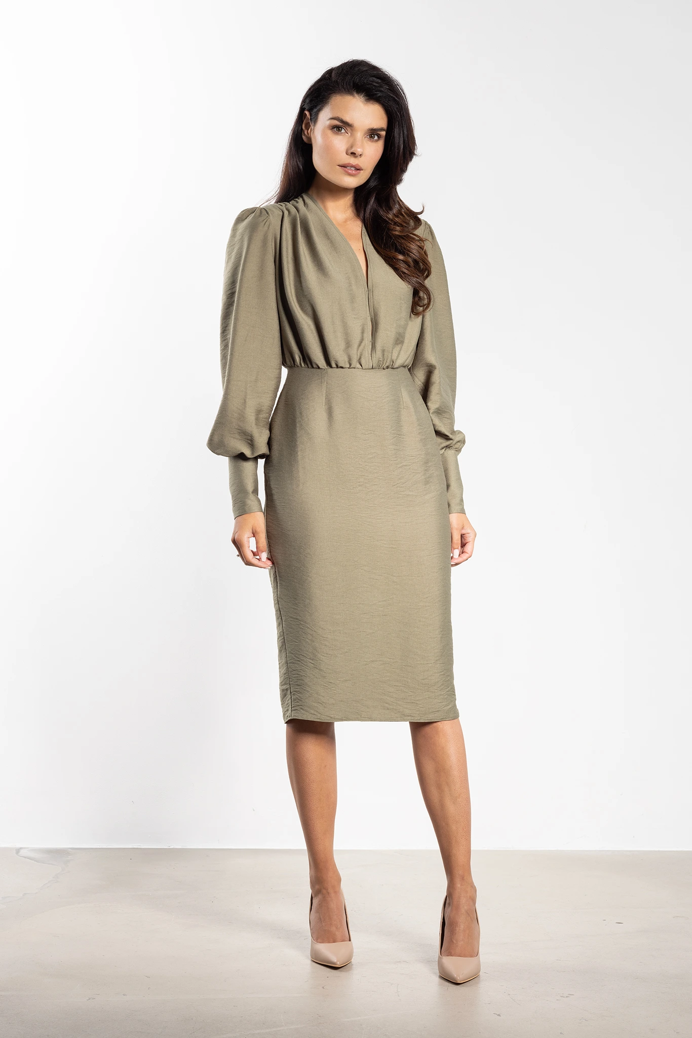 Sukienka midi o dopasowanym kroju to świetny wybór na wiele wyjątkowych okazji. Głęboki dekolt V pięknie eksponuje linię szyi i subtelnie podkreśla biust, dodając całości kobiecego charakteru. Talia została zaakcentowana marszczeniem, które nadaje sylwetce proporcji i delikatnie ją wysmukla. Ołówkowy dół sukienki gwarantuje klasyczną linię i ponadczasowy efekt, idealny na wyjątkowe okazje. Długie bufiaste rękawy zakończone szerokim mankietem nadają całości lekkości i elegancji, a długość sięgająca za kolano sprawia, że kreacja łączy w sobie klasę i kobiecość.