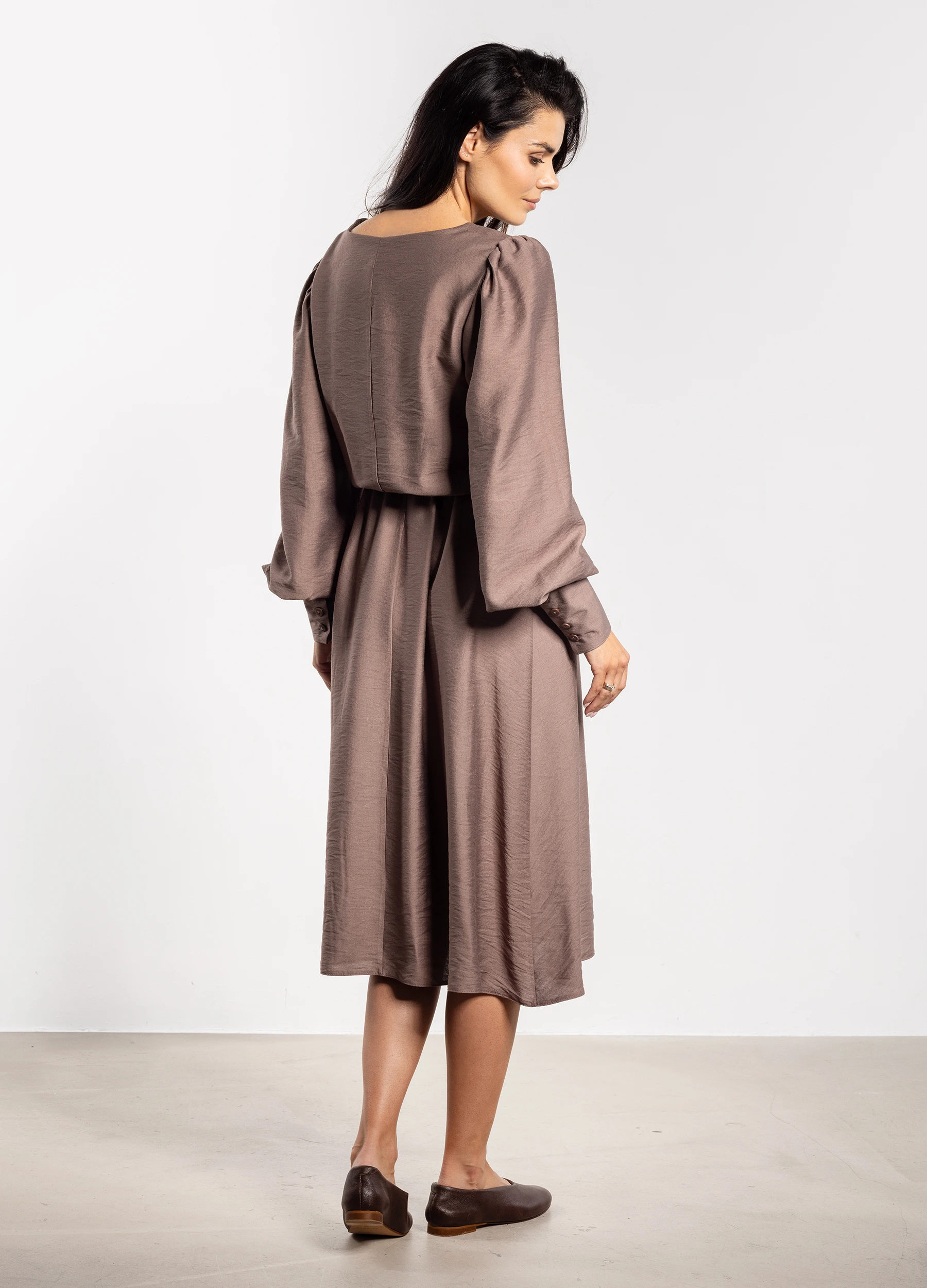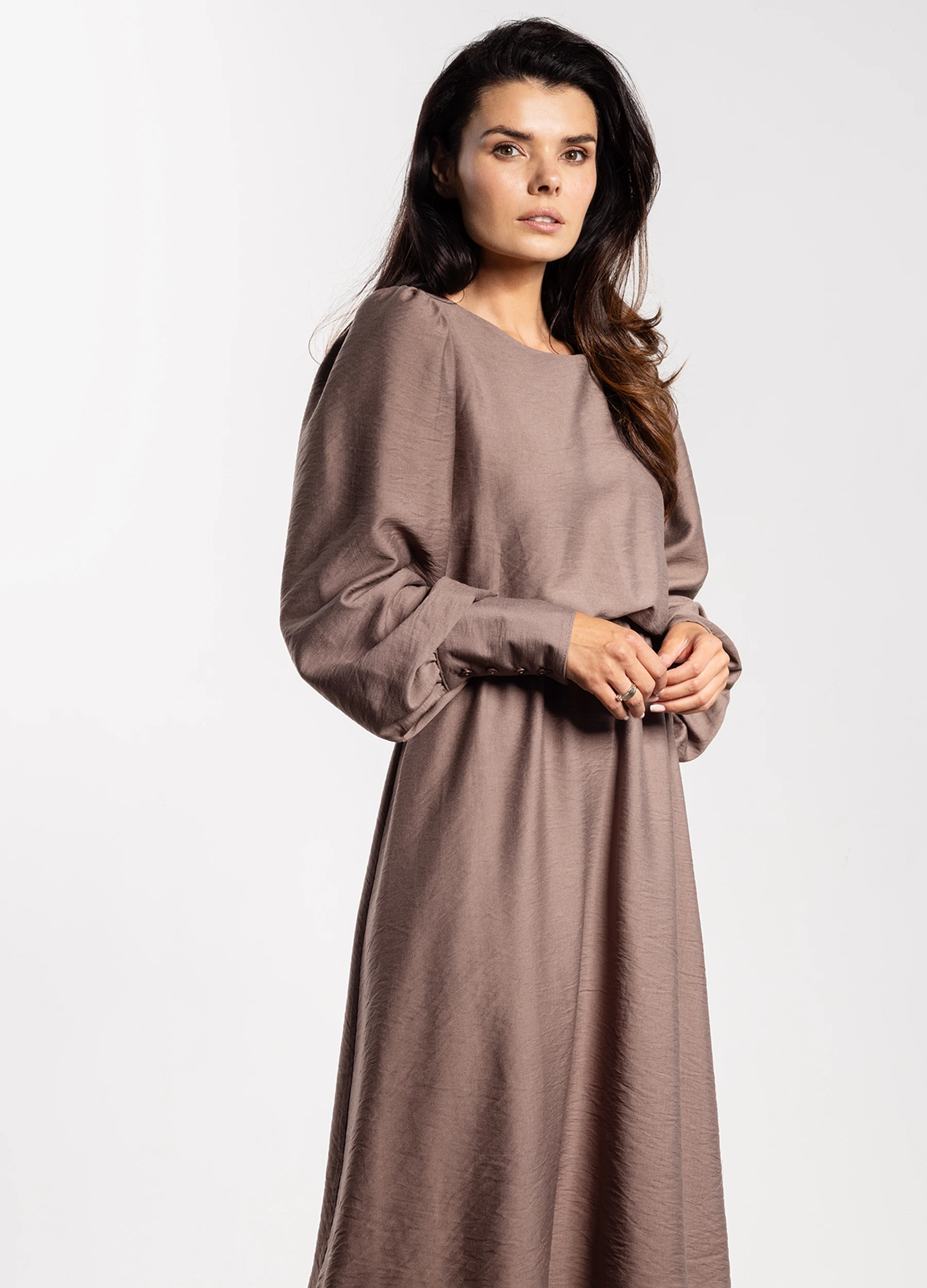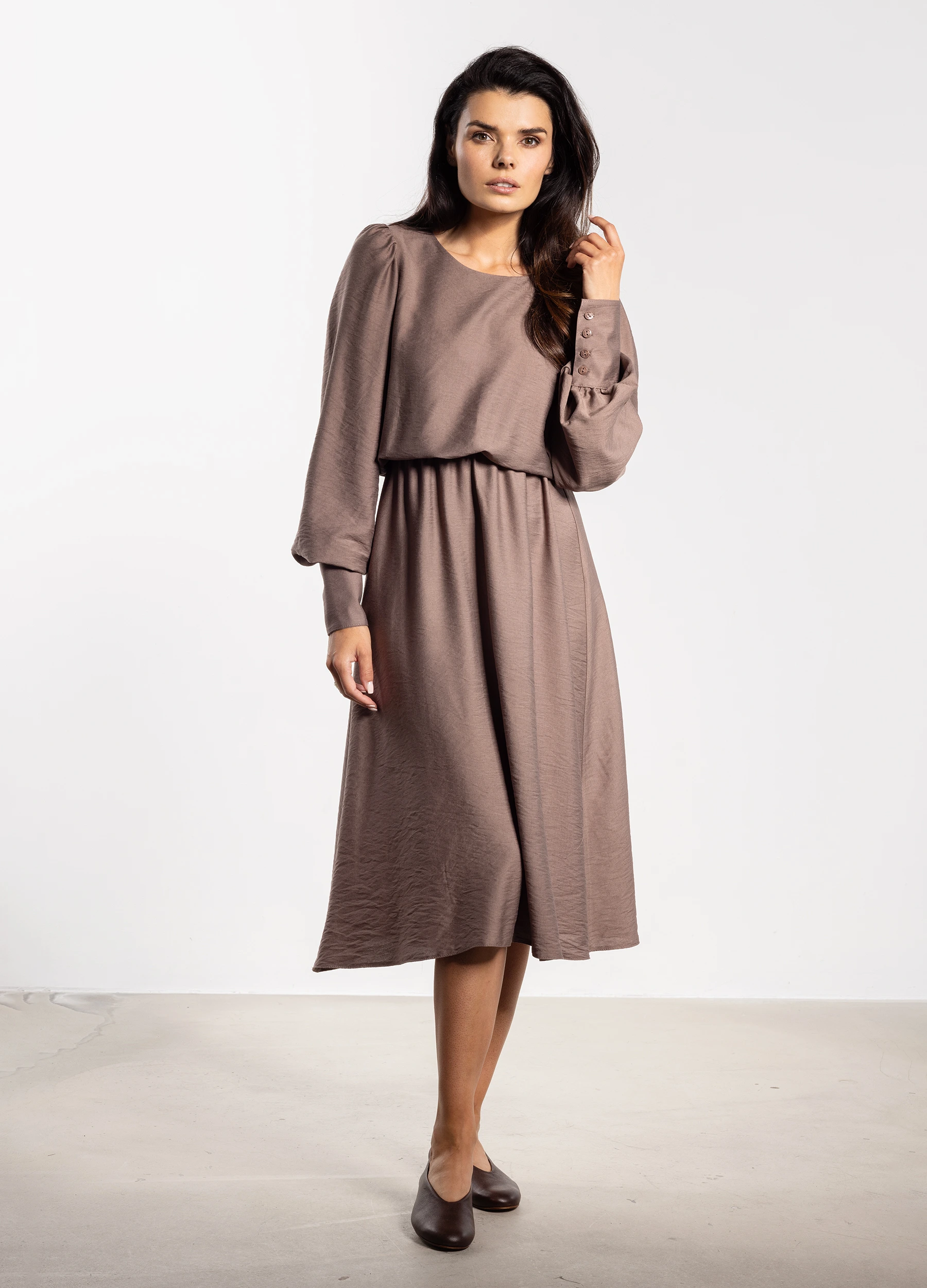 Sukienka midi ma elegancki i swobodny krój, który subtelnie podkreśla sylwetkę, zapewniając jednocześnie wygodę noszenia. Luźniejsza góra pięknie łączy się z elastycznym pasem, który zaznacza talię i dodaje kobiecych proporcji. Długie rękawy zakończone szerokim mankietem z guzikami nadają całości eleganckiego charakteru. Zaokrąglony dekolt pozostaje uniwersalny i ponadczasowy, dzięki czemu sukienka sprawdzi się zarówno na co dzień, jak i podczas bardziej formalnych okazji. Długość sięgająca za kolano nadaje stylizacji klasy i elegancji.