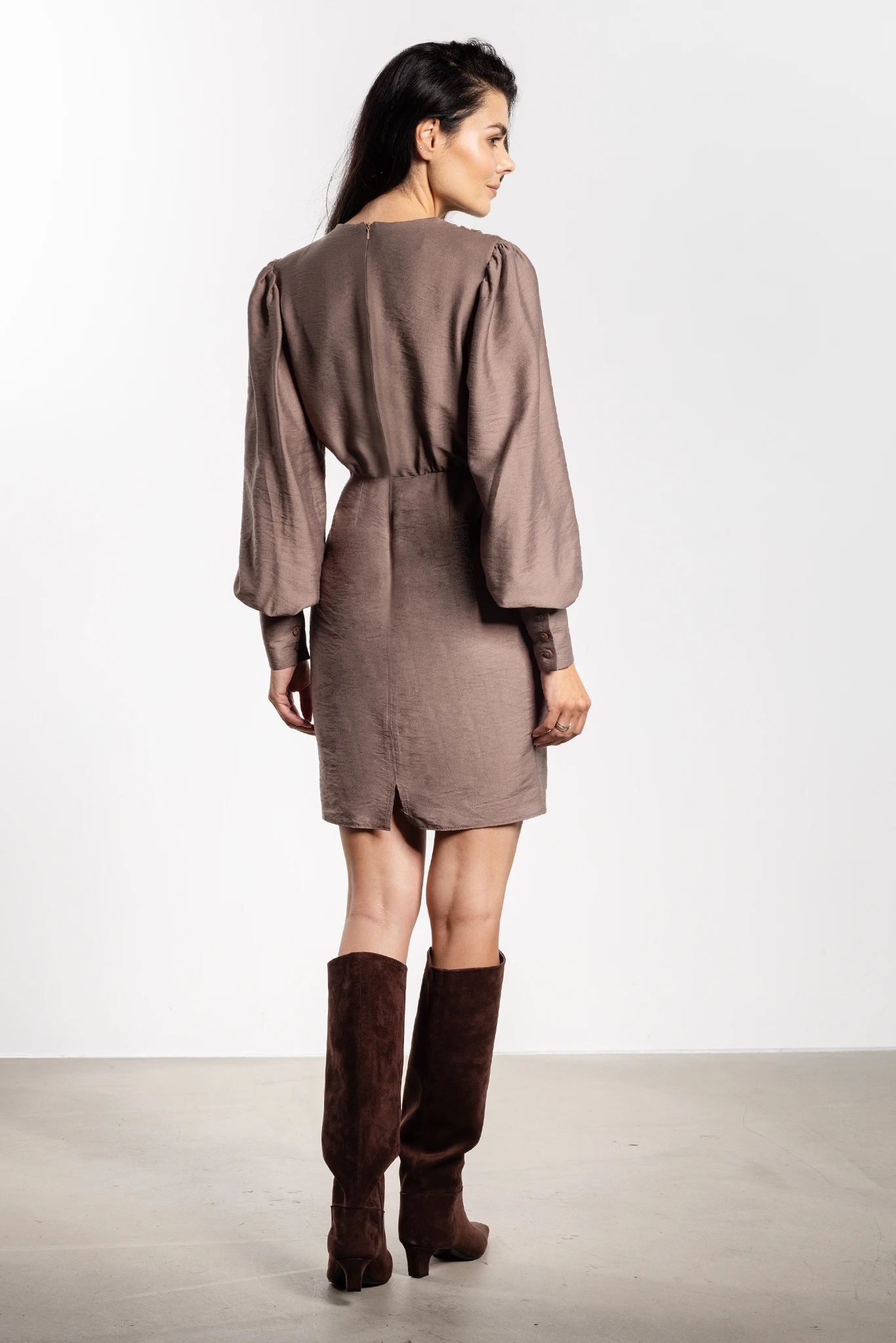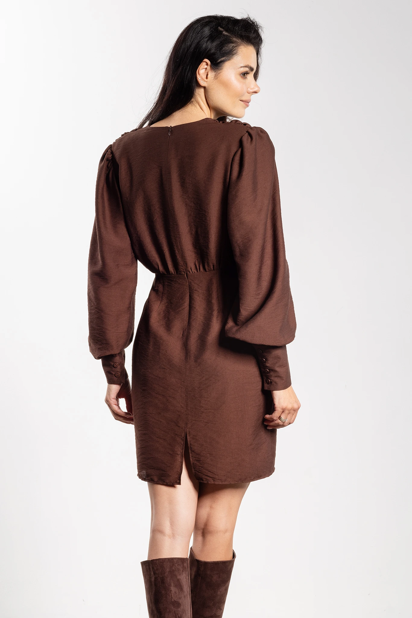Sukienka mini o eleganckim kroju jest świetnym wyborem na wiele uroczystych okazji. Dopasowana góra z głębokim dekoltem V subtelnie podkreśla linię biustu, nadając stylizacji kobiecego charakteru. Talia została zaakcentowana delikatnym marszczeniem, co optycznie wysmukla sylwetkę i nadaje jej proporcji. Długie bufiaste rękawy zakończone szerokim mankietem z guzikami dodają całości wyrazistego akcentu tworząc modny efekt. Długość mini eksponuje nogi, dzięki czemu sukienka sprawdzi się doskonale zarówno na eleganckie przyjęcia, jak i wyjątkowe okazje wymagające efektownej stylizacji.
