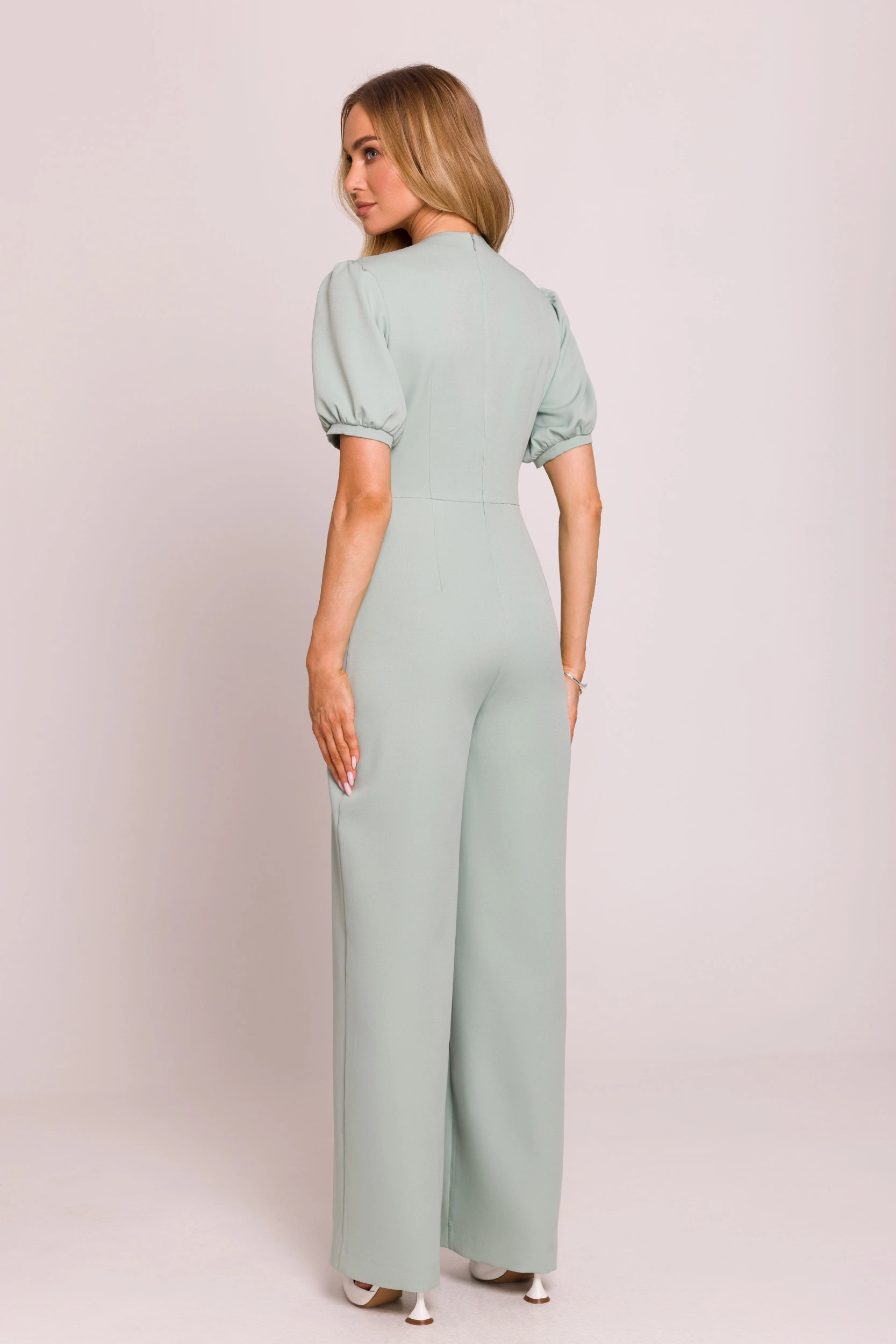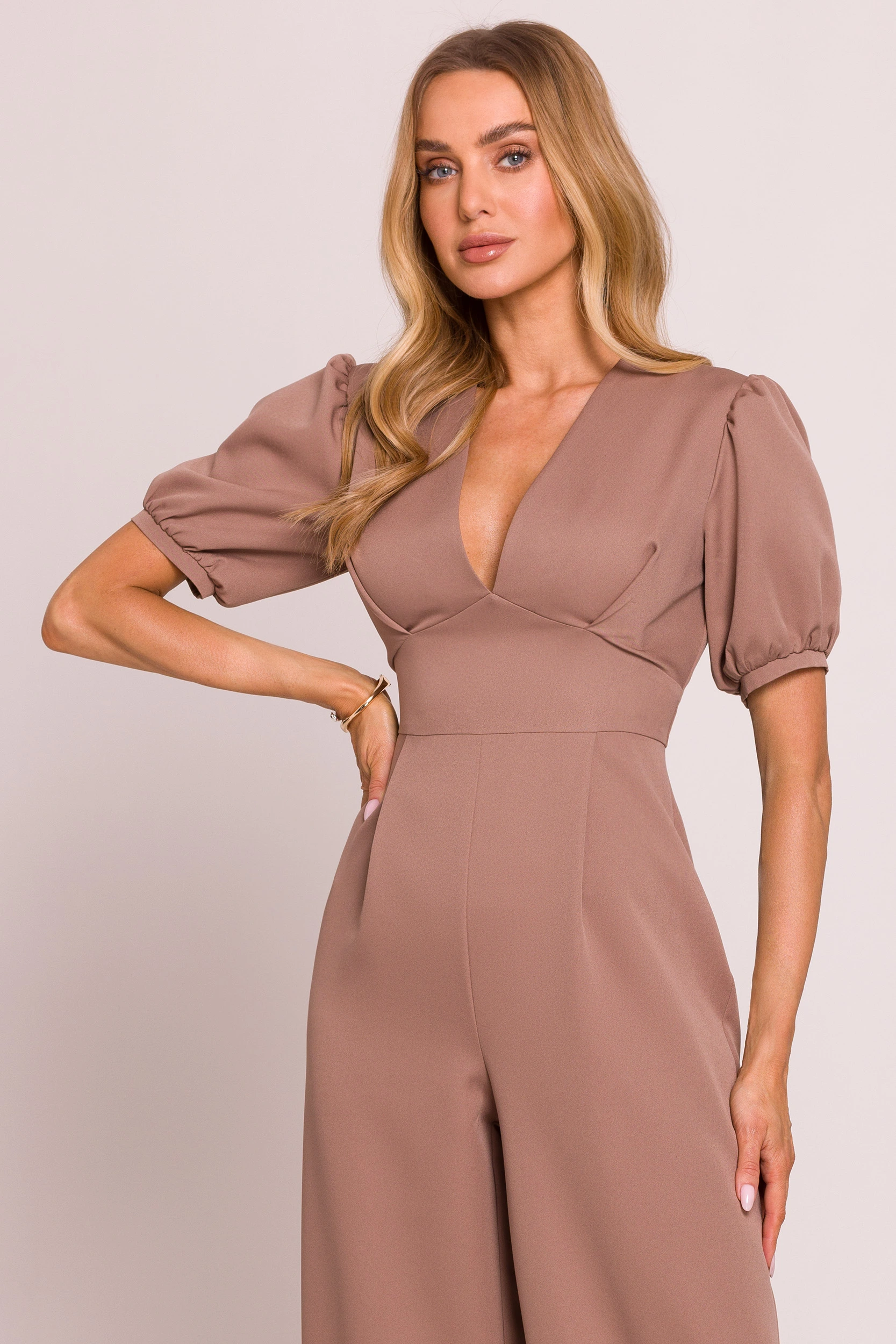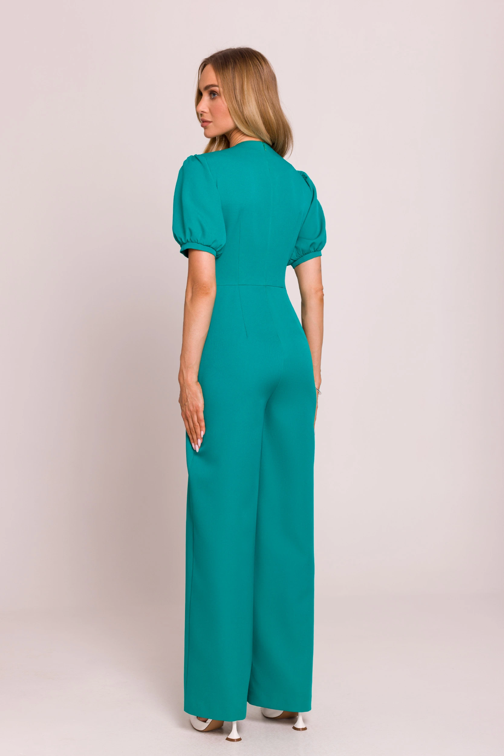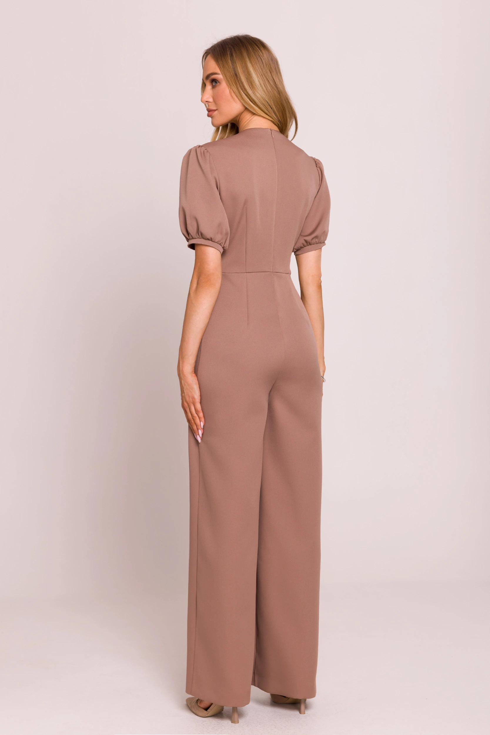 Elegancki kombinezon damski z kopertowym dekoltem i szerokimi nogawkami