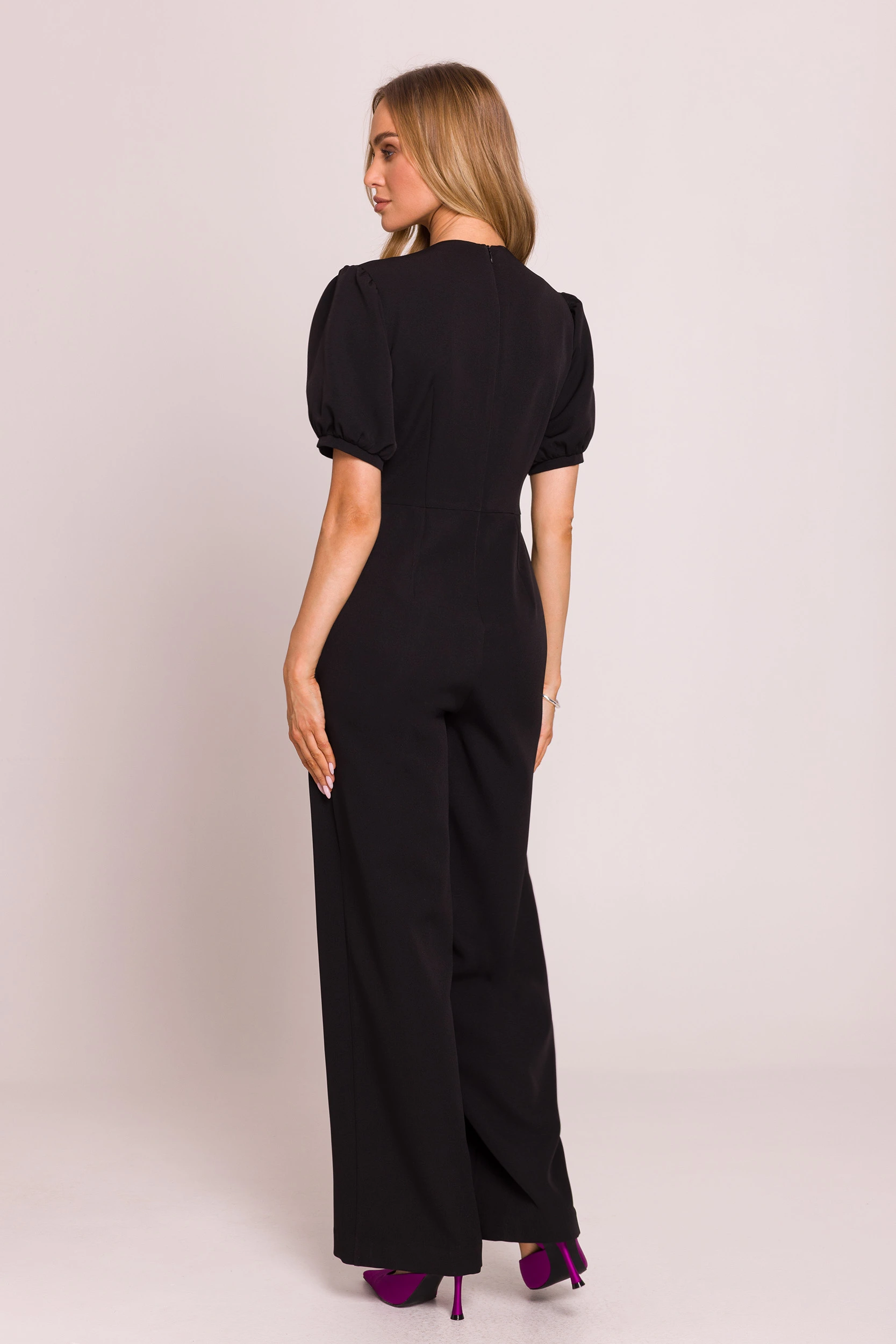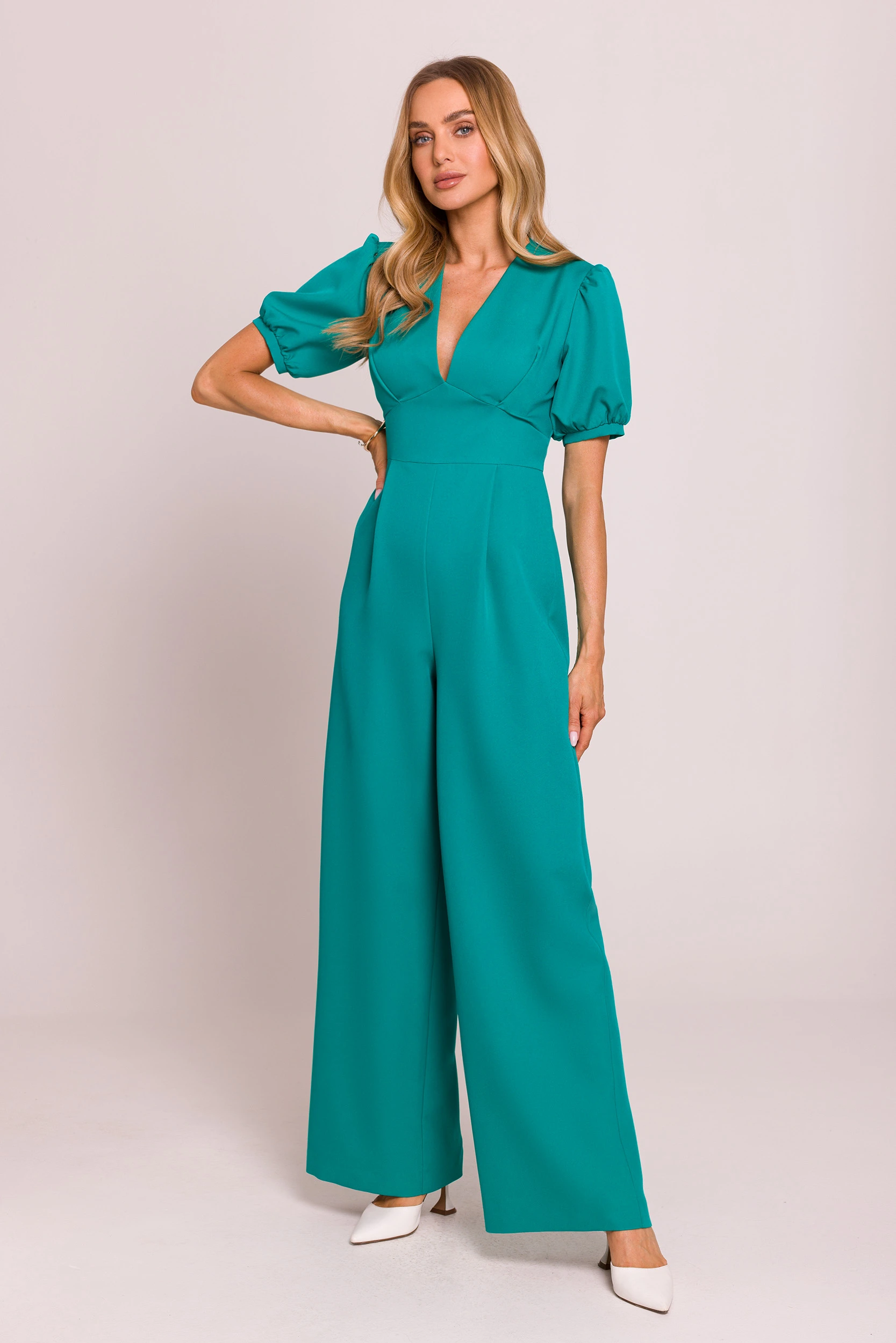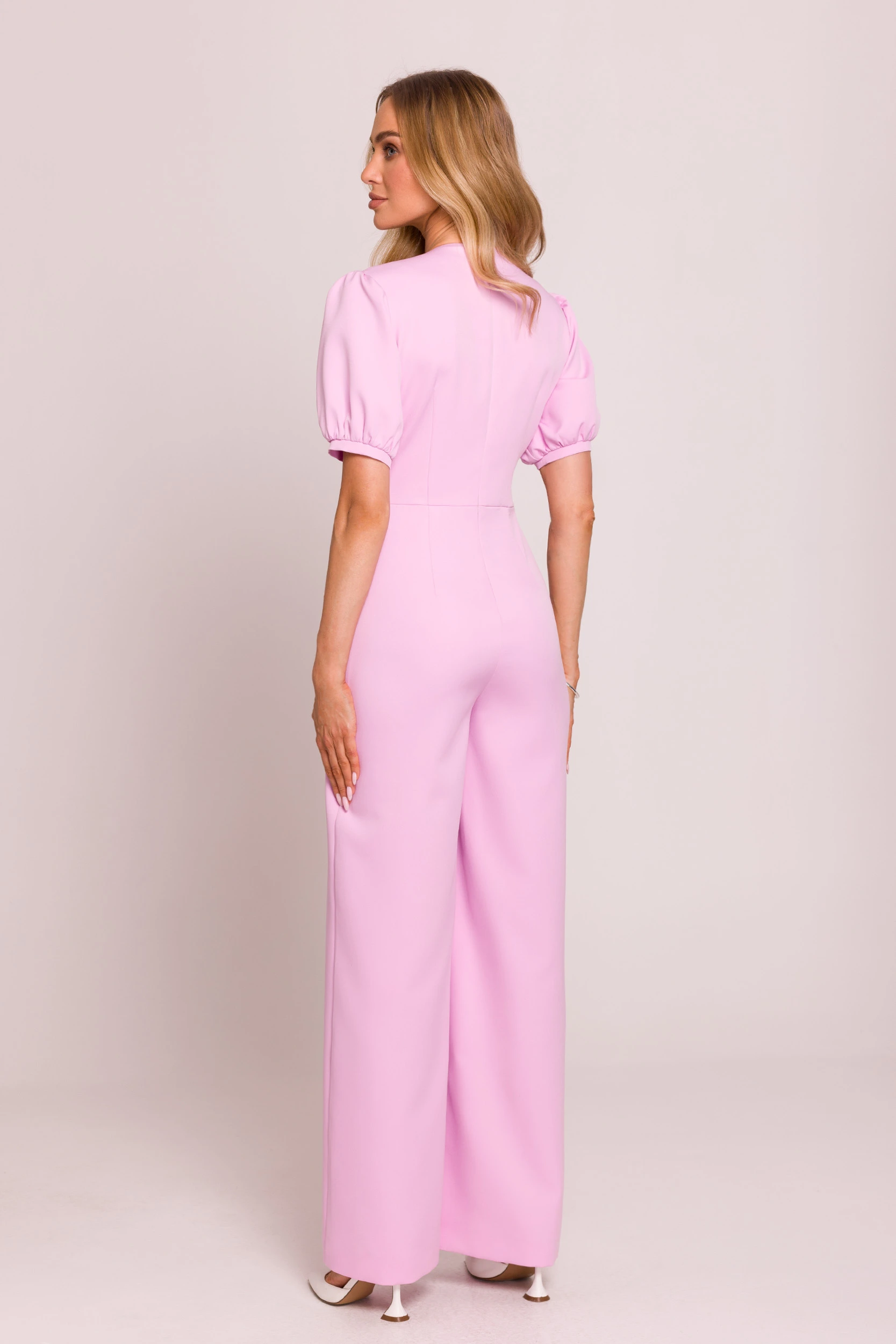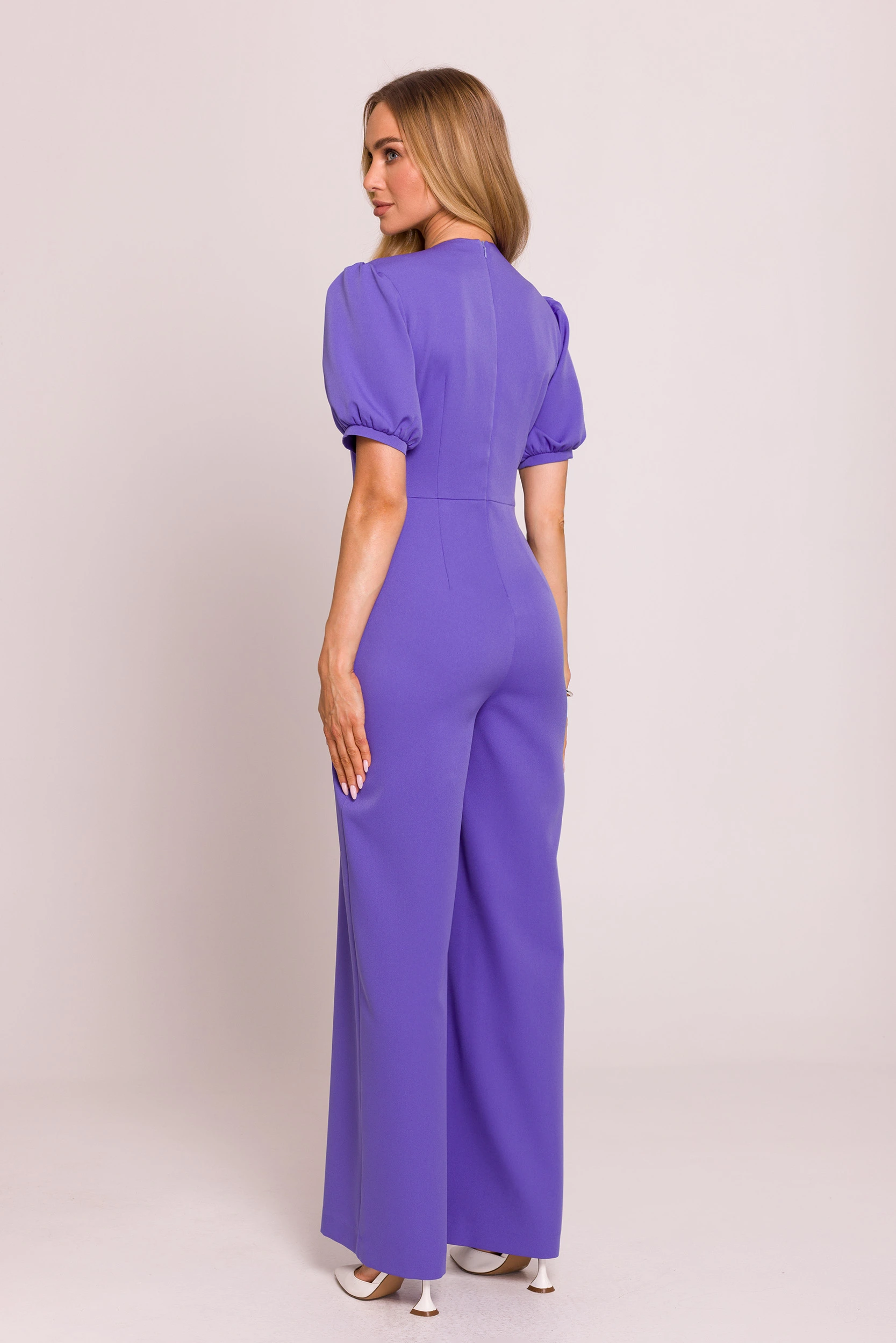 Elegancki kombinezon damski z kopertowym dekoltem i szerokimi nogawkami