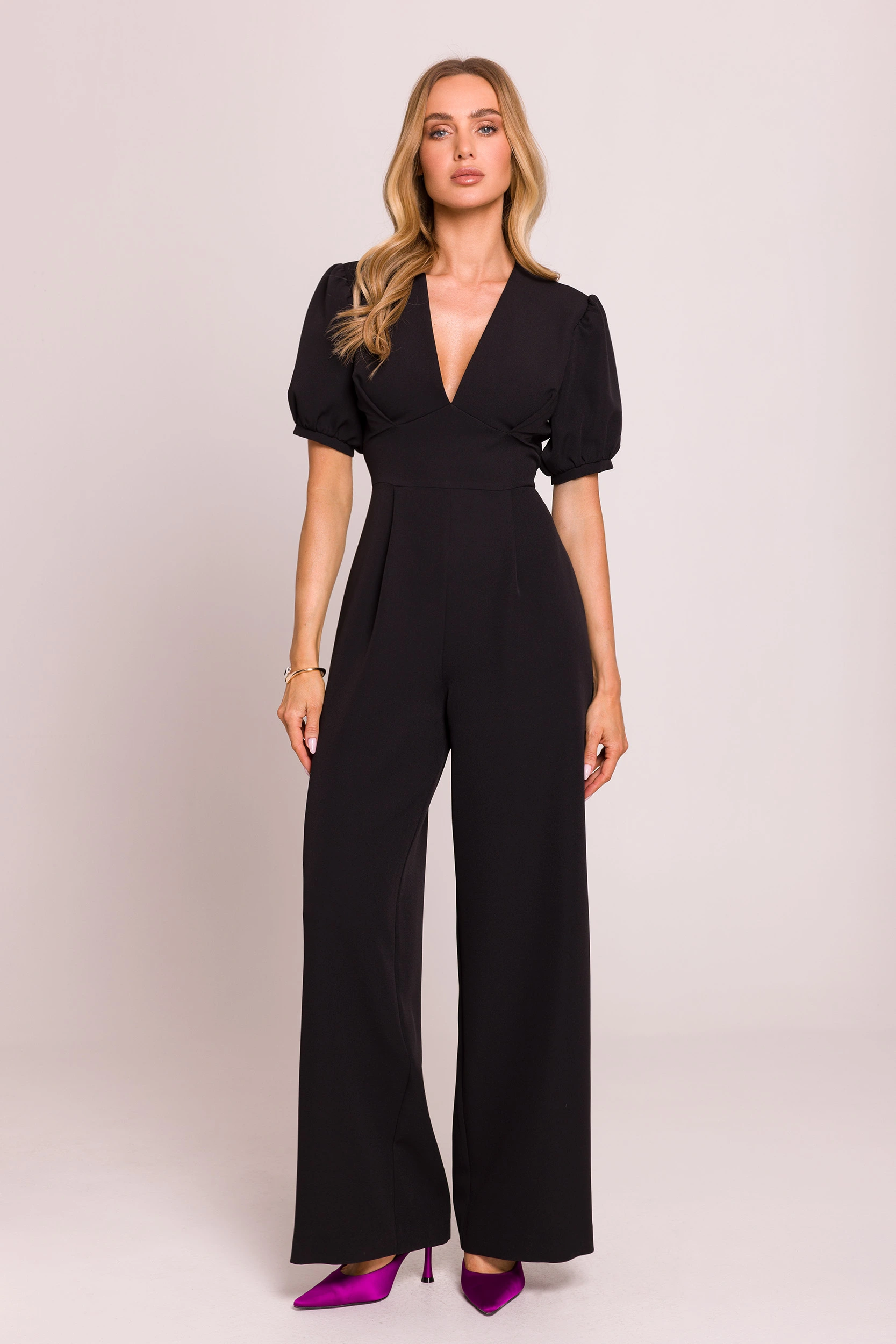Elegancki kombinezon damski z kopertowym dekoltem i szerokimi nogawkami to propozycja dla kobiet, które szukają połączenia nowoczesnej formy z ponadczasową klasą. Dopasowana góra pięknie podkreśla sylwetkę, a szerokie nogawki nadają całości lekkości i stylowego charakteru. Kopertowy dekolt subtelnie eksponuje szyję oraz dekolt, a krótkie bufiaste rękawy dodają modelowi kobiecej finezji. To doskonały wybór na przyjęcie, wesele, komunię, randkę, rodzinne uroczystości lub inne okazje, gdy chcesz wyglądać elegancko i czuć się komfortowo. Starannie zaprojektowany krój sprawia, że kombinezon prezentuje się efektownie zarówno z przodu, jak i z tyłu.