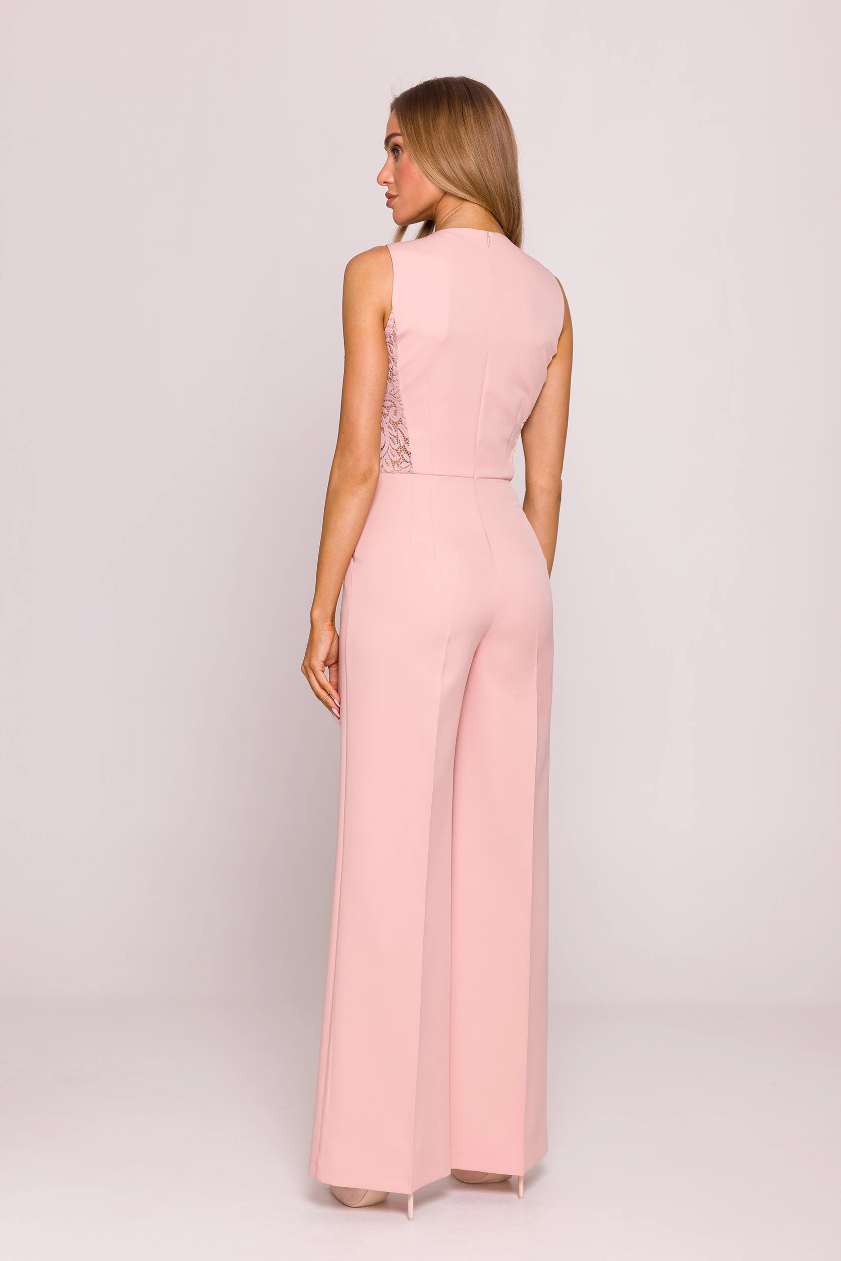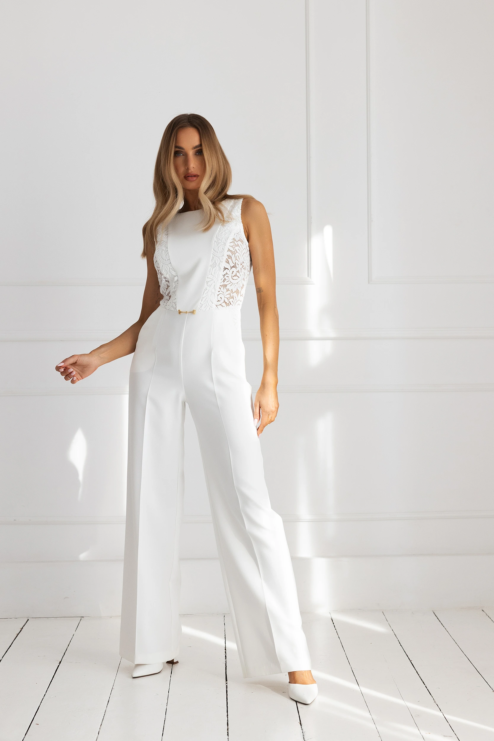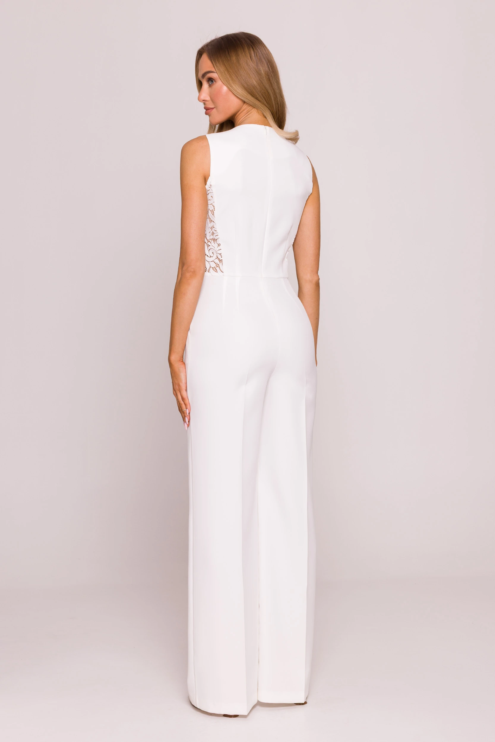 Elegancki kombinezon damski z koronkowymi wstawkami i szerokimi nogawkami