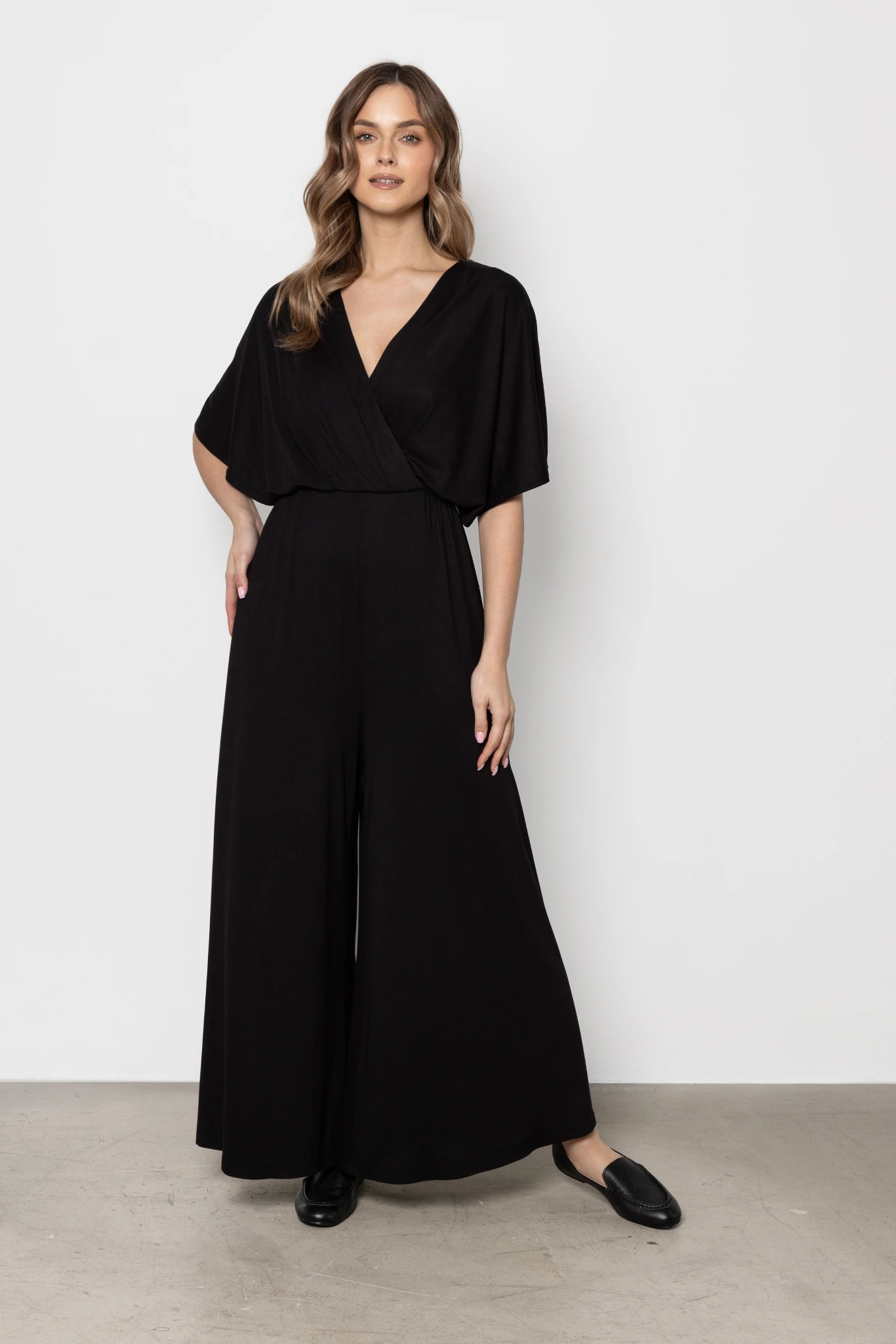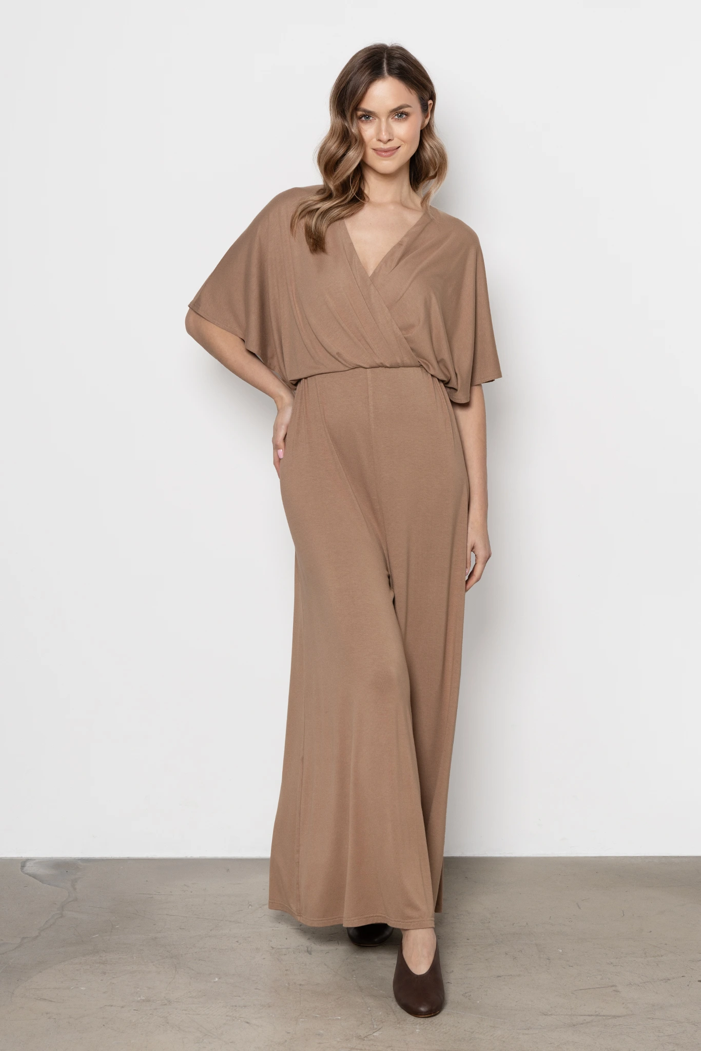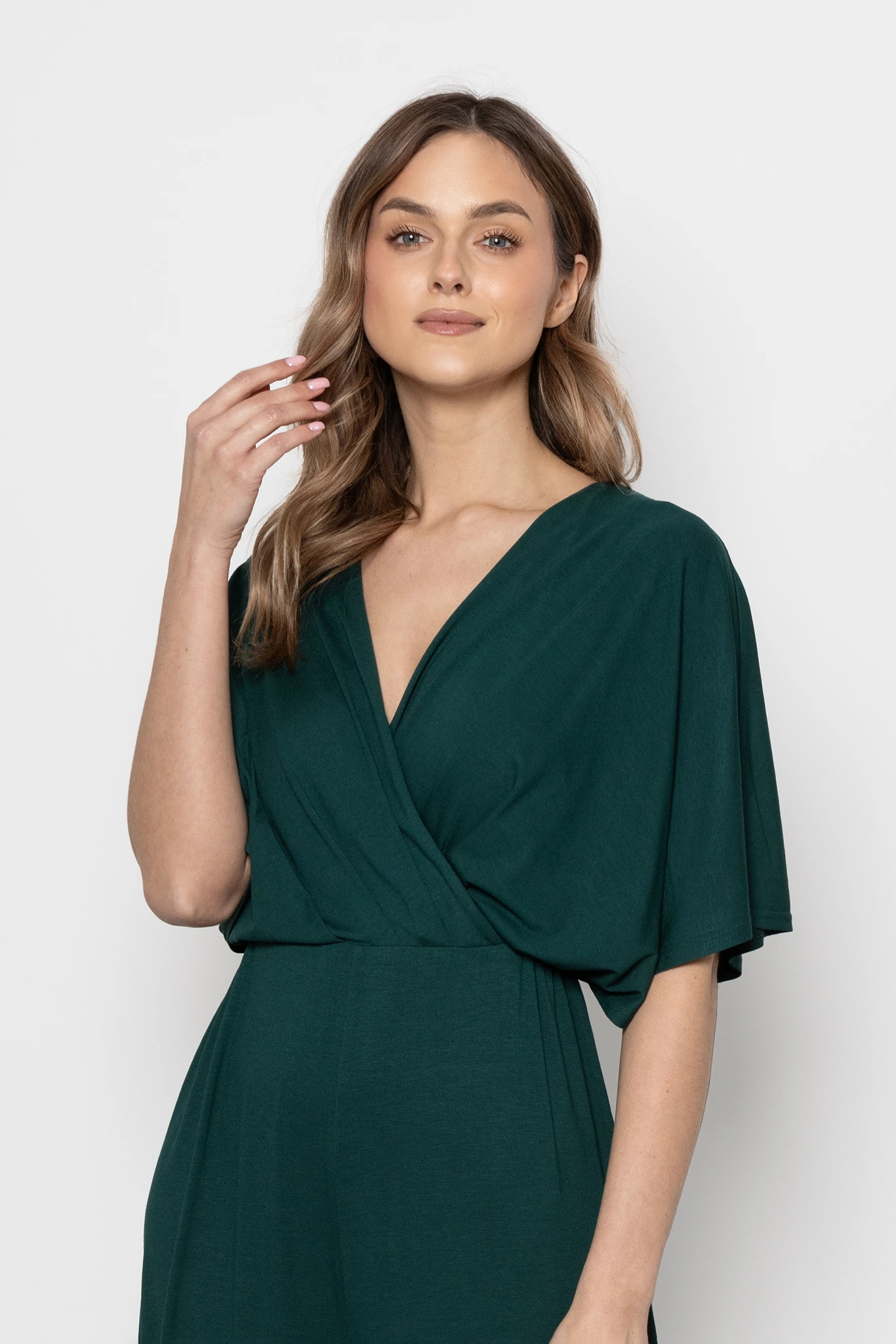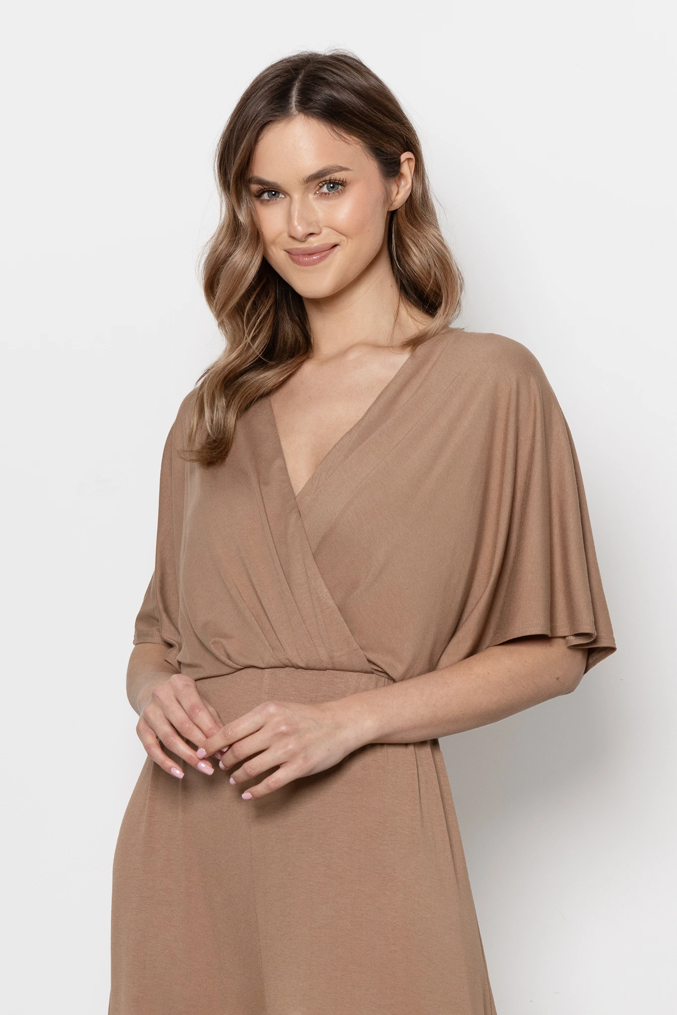 Elegancki kombinezon z kopertowym dekoltem i szerokimi nogawkami