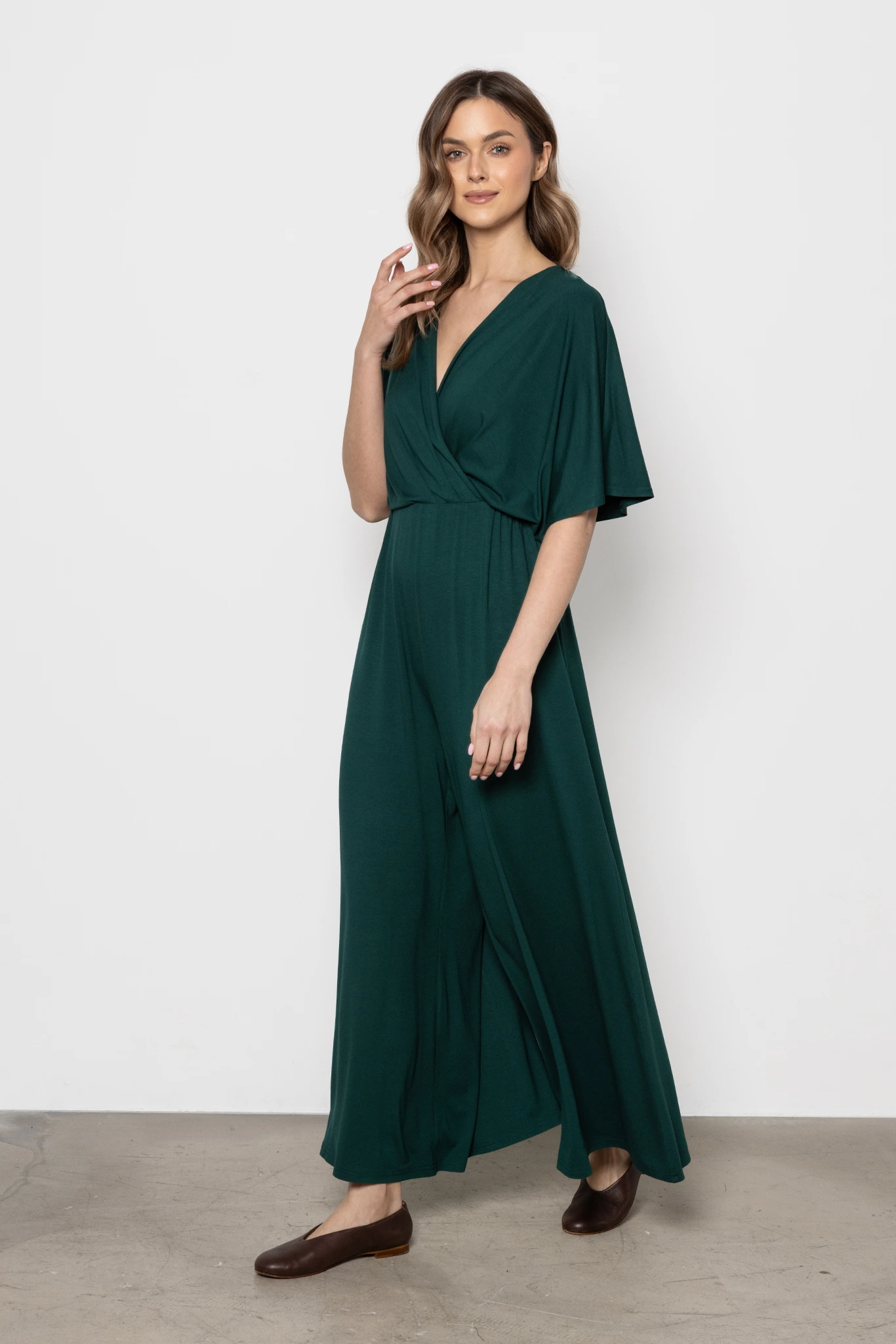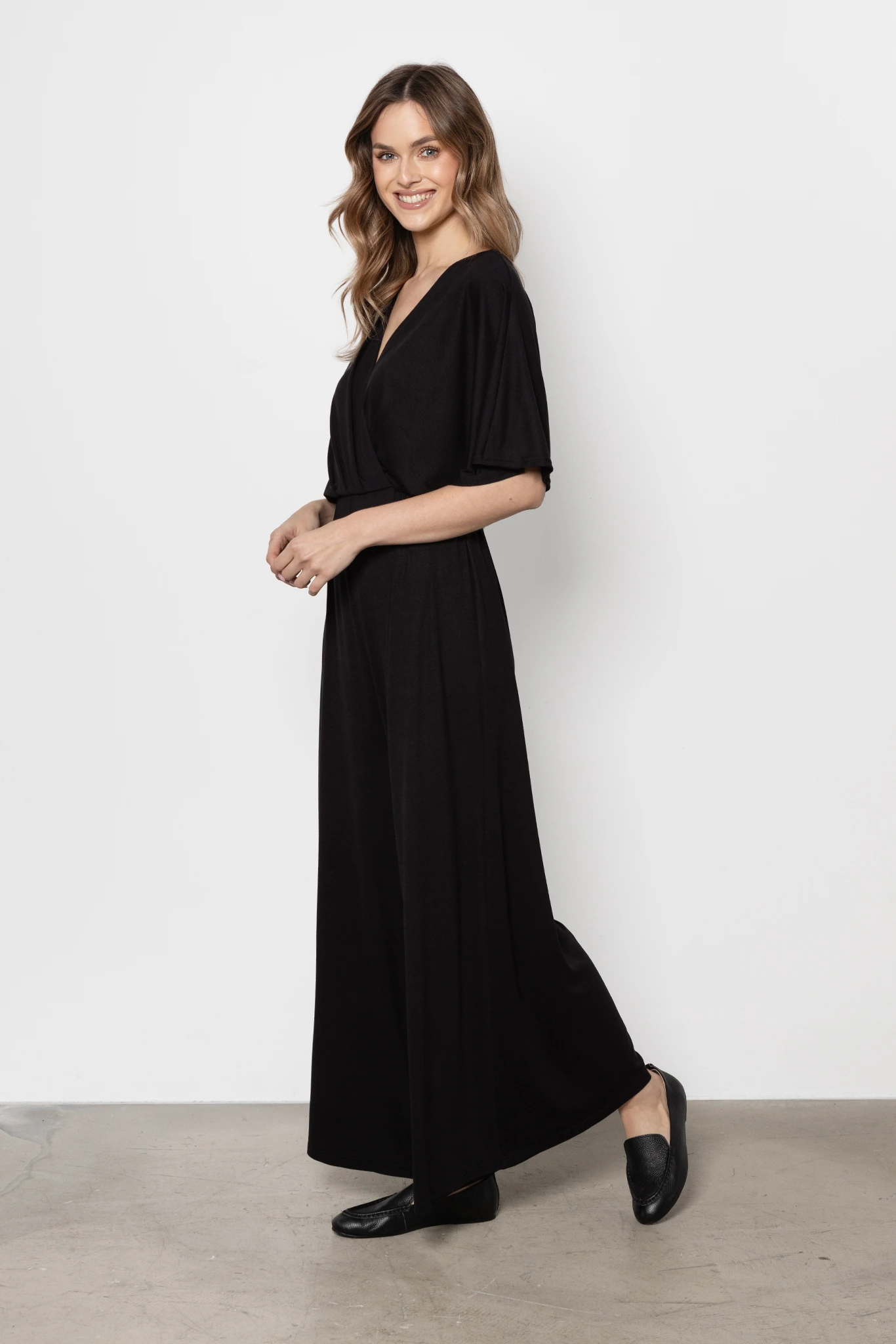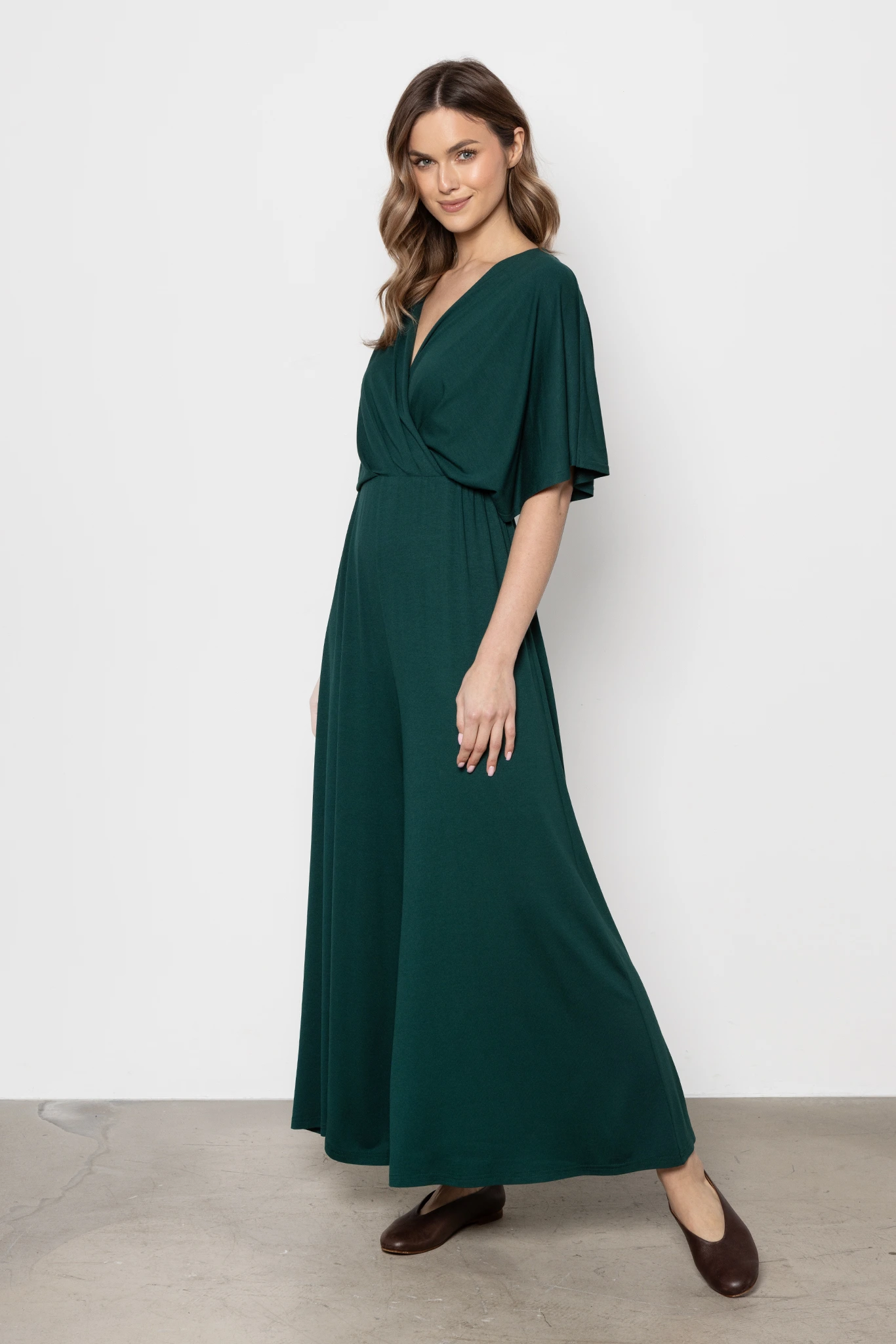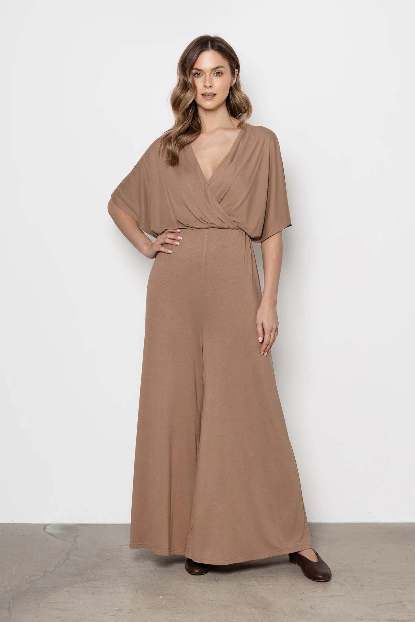 Elegancki kombinezon z kopertowym dekoltem i szerokimi nogawkami
