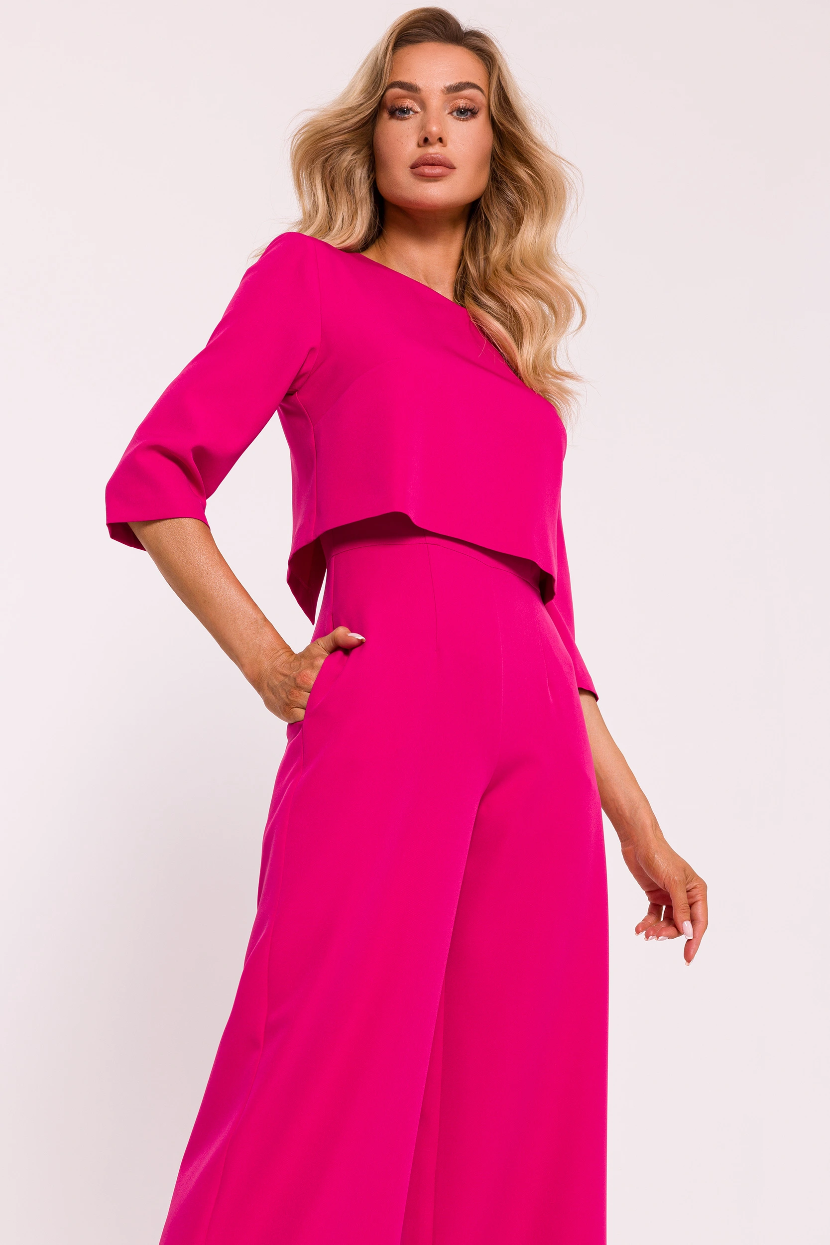 Fuksjowy elegancki kombinezon damski na komunię z szeroką nogawką to wyjątkowa propozycja dla kobiet, które szukają stylizacji szykownej, nowoczesnej i wygodnej zarazem. Model zachwyca wyrazistym kolorem, subtelną formą oraz dopracowanym krojem, który pięknie podkreśla sylwetkę. To idealny kombinezon na uroczystość Pierwszej Komunii Świętej, rodzinne przyjęcie, elegancki obiad lub inne ważne okazje.