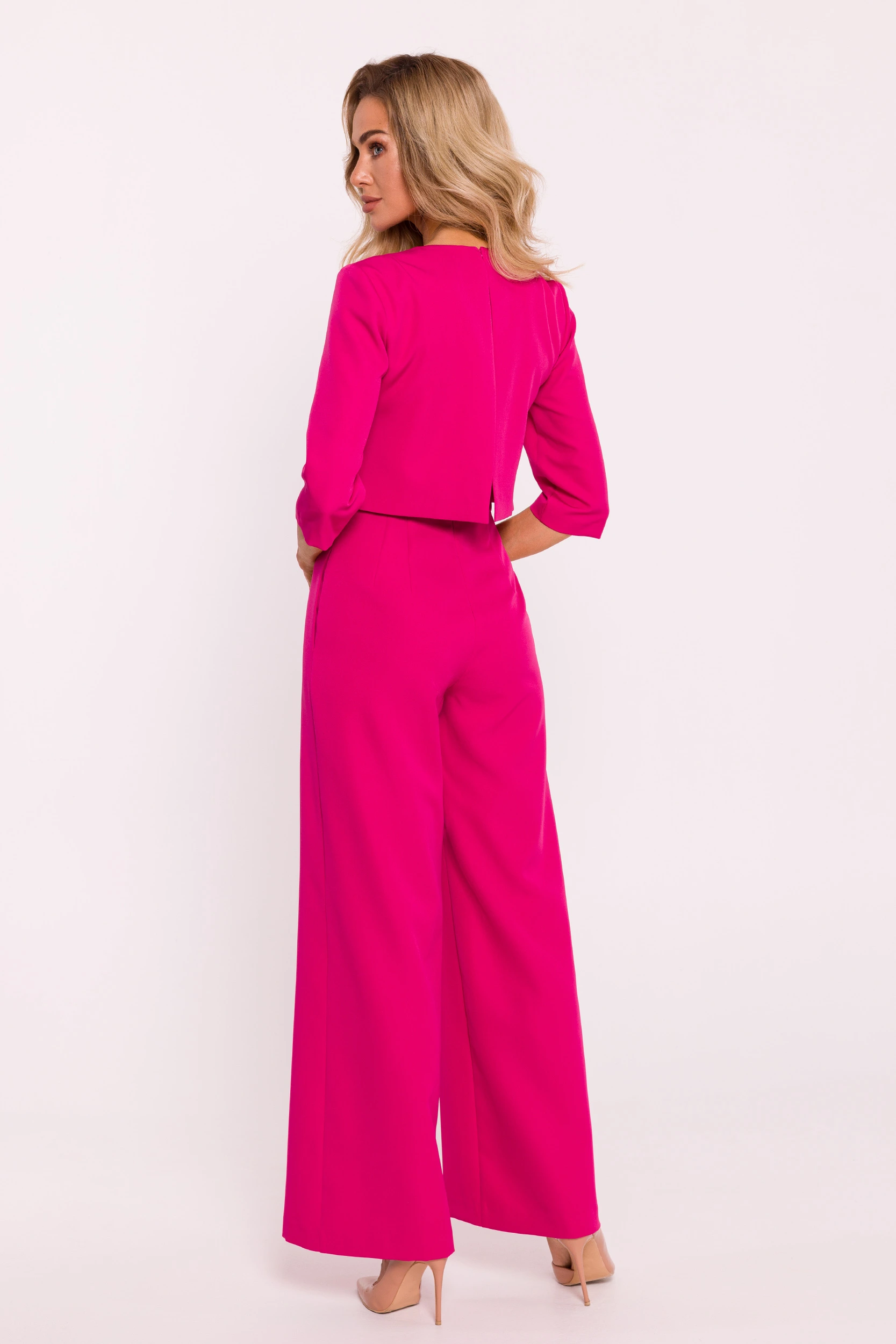 Fuksjowy elegancki kombinezon damski na komunię z szeroką nogawką