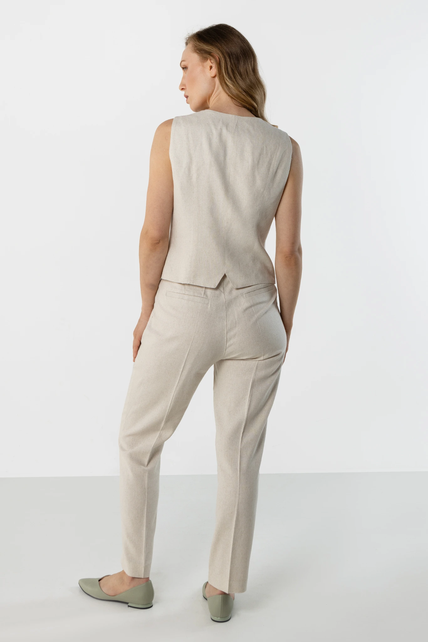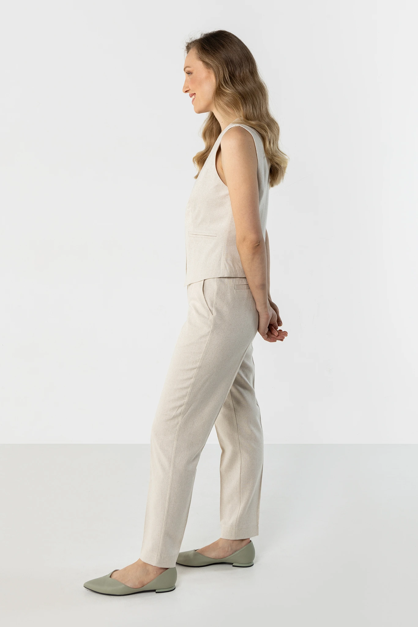 Jasnobeżowy lniany komplet damski z kamizelką i cygaretkami