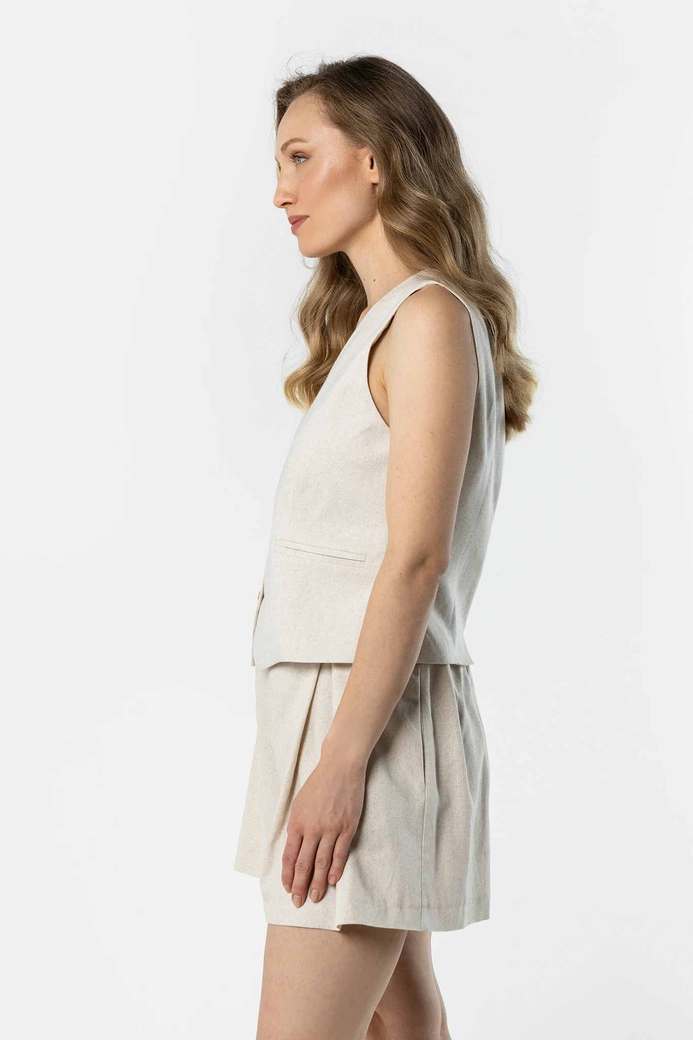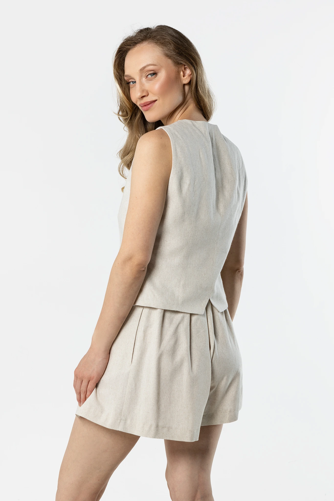 Jasnobeżowy lniany komplet damski z kamizelką i plisowanymi spodenkami – elegancja i lekkość na lato
