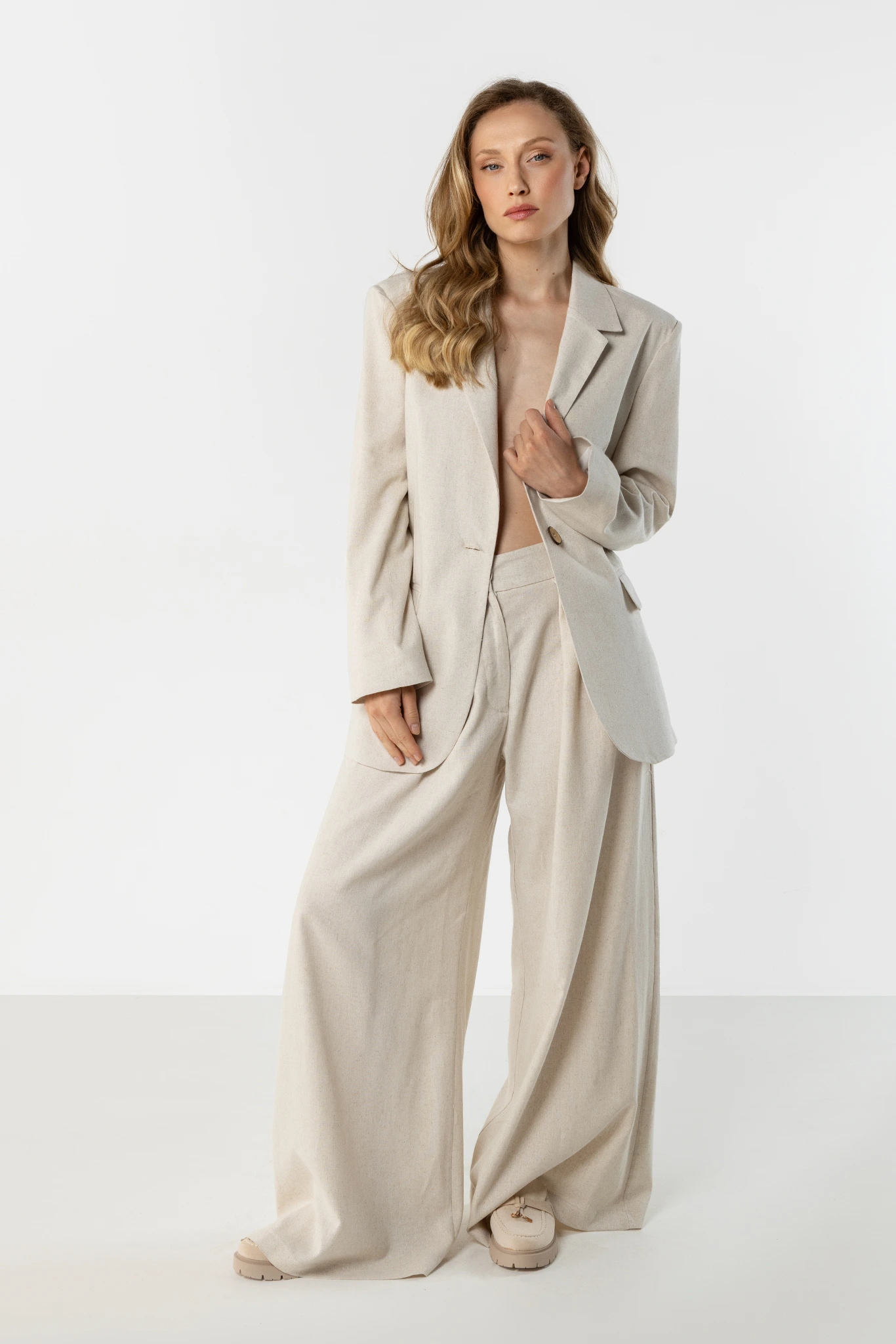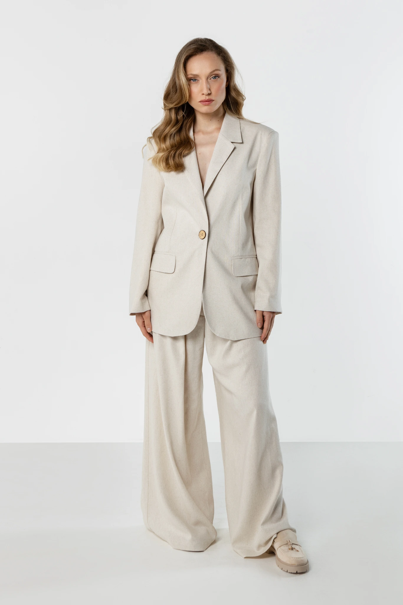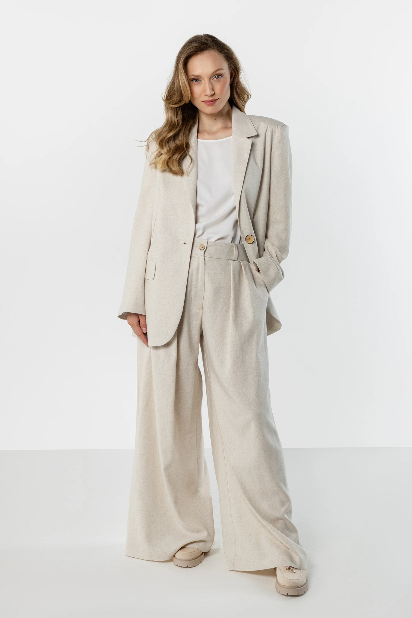 Jasnobeżowy lniany komplet damski z marynarką i szerokimi spodniami – elegancja w naturalnym wydaniu