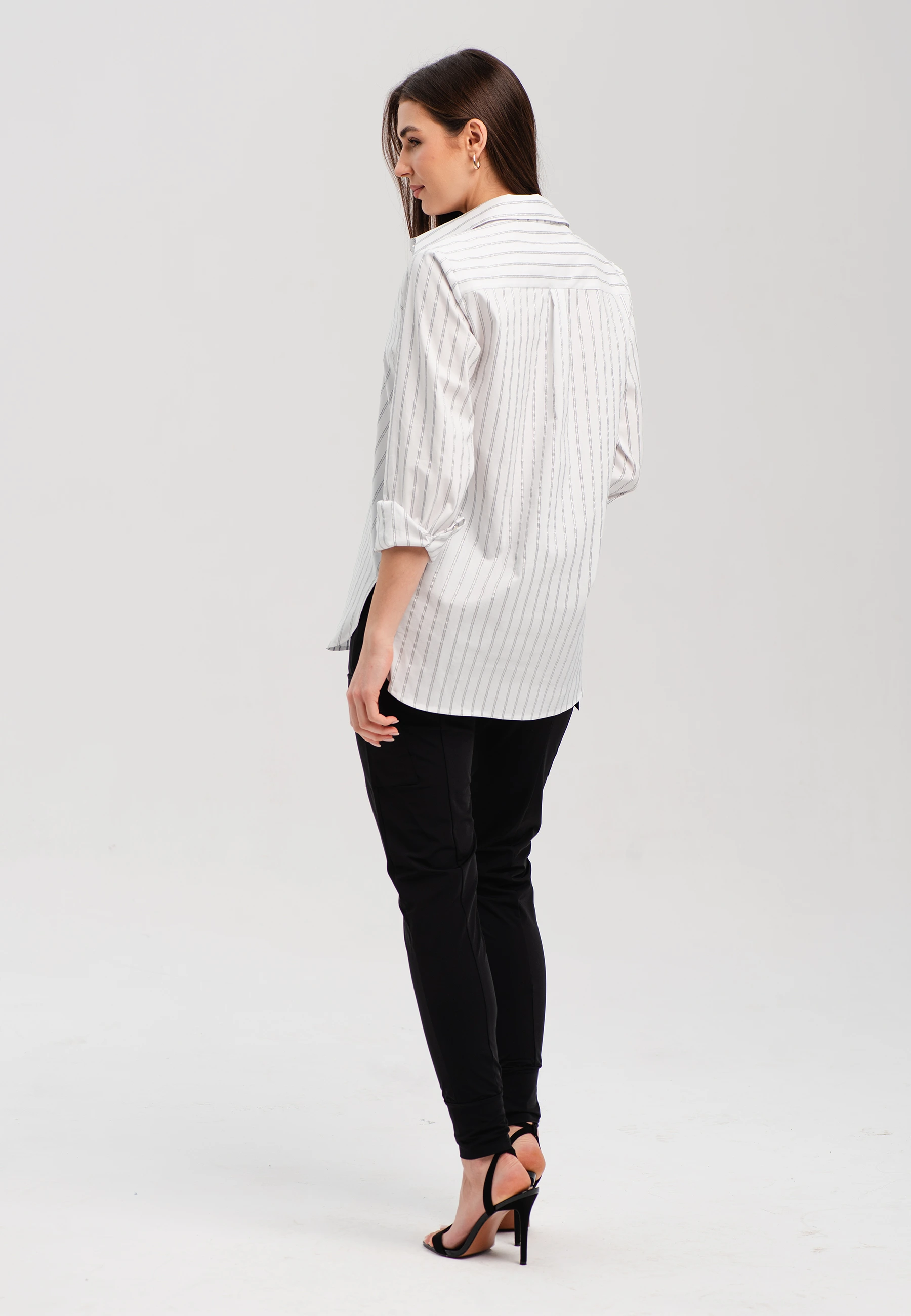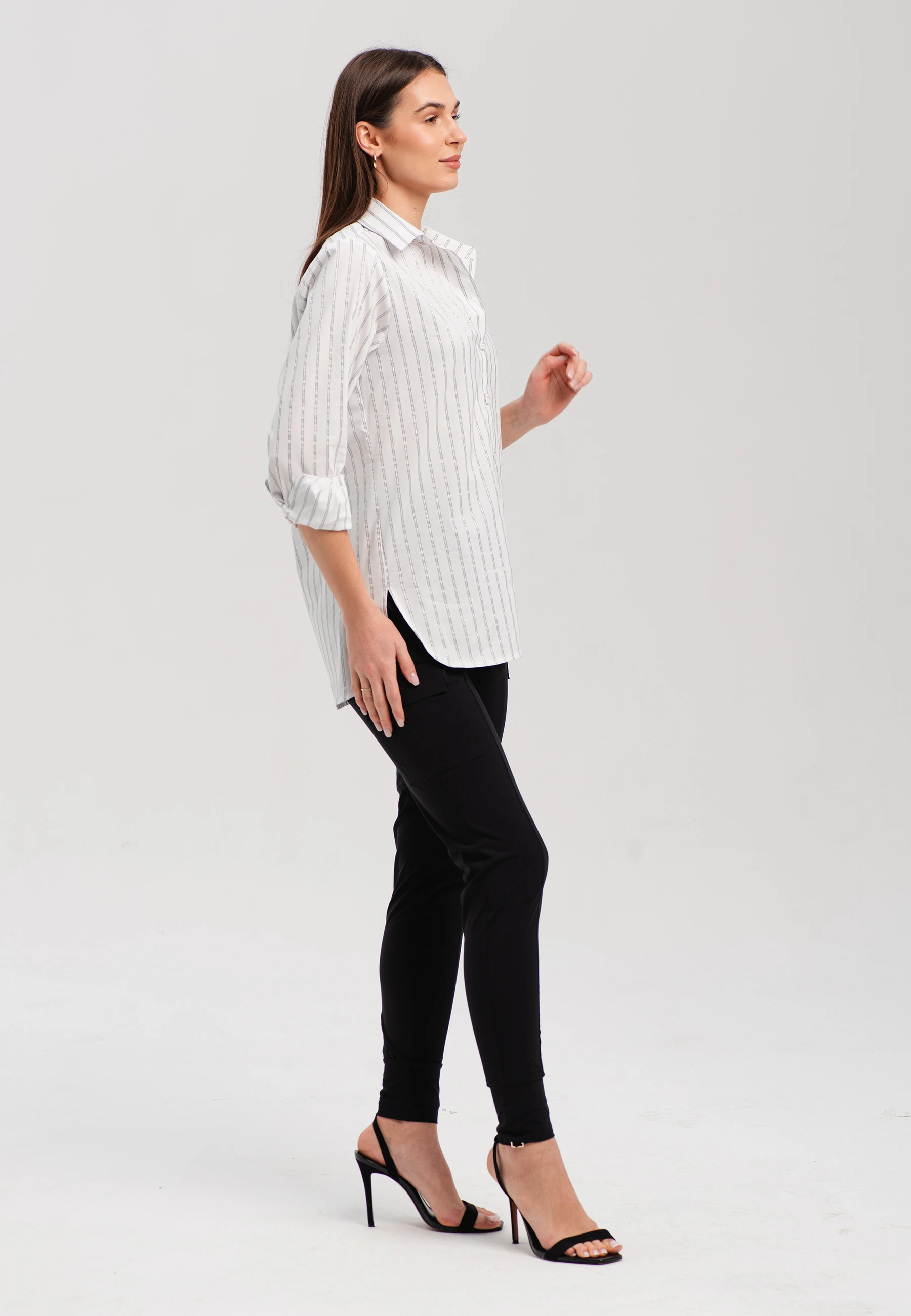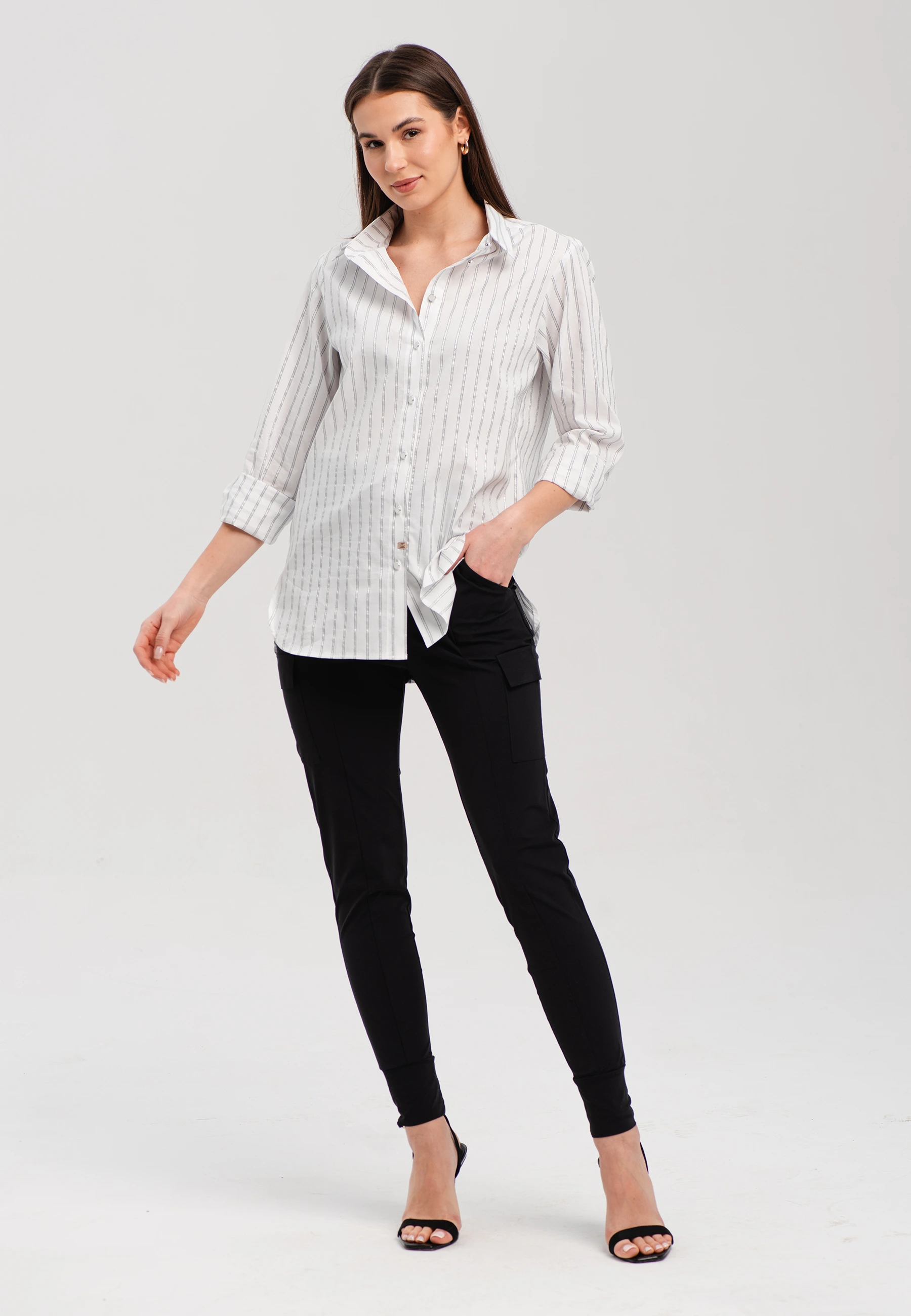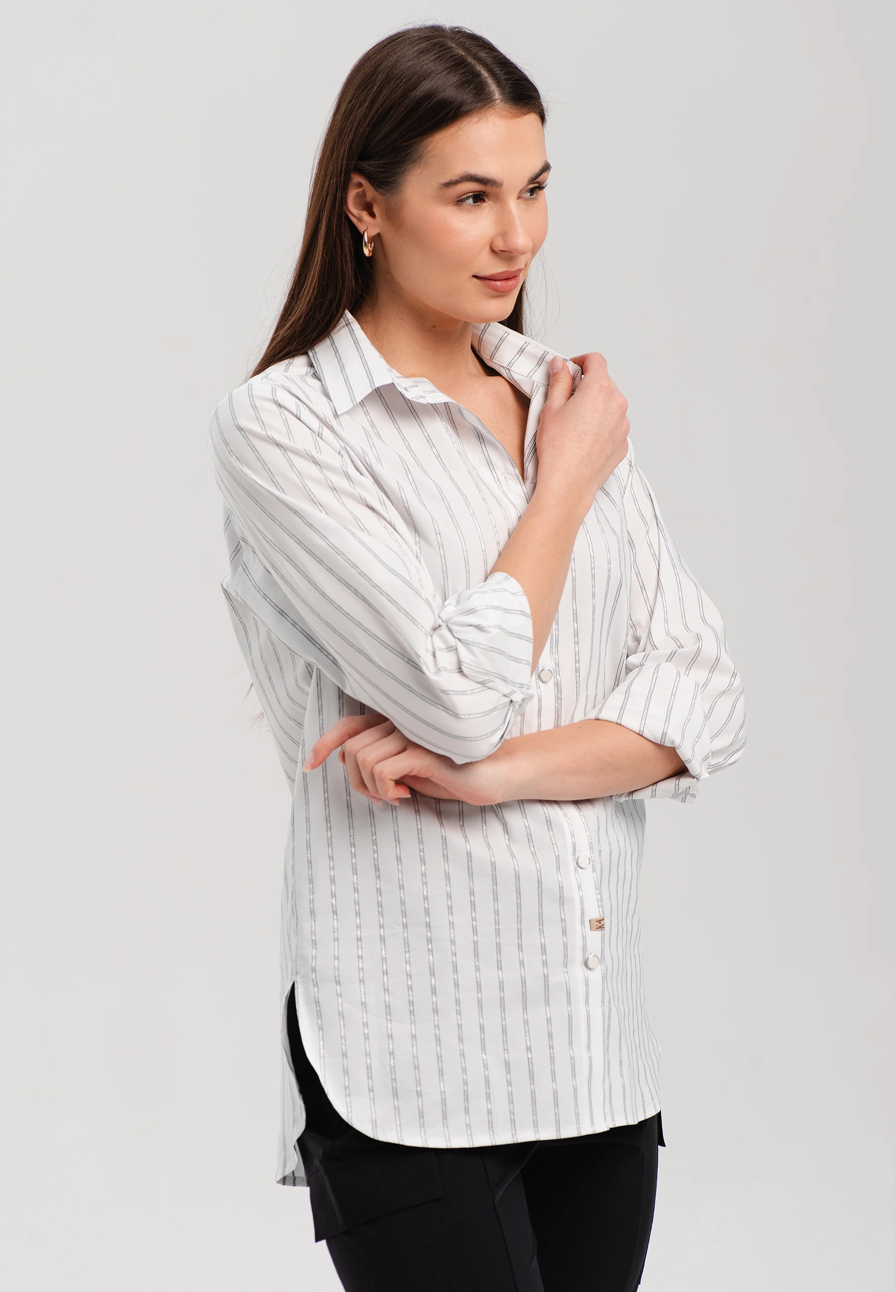 Prosty kołnierzyk, klasyczne zapięcie na guziki oraz rękawy z możliwością podwinięcia tworzą funkcjonalną bazę do wielu looków. Subtelny wzór w pasy dodaje całości elegancji, nie dominując stylizacji. To propozycja dla kobiet ceniących minimalizm, ale z nutą charakteru.