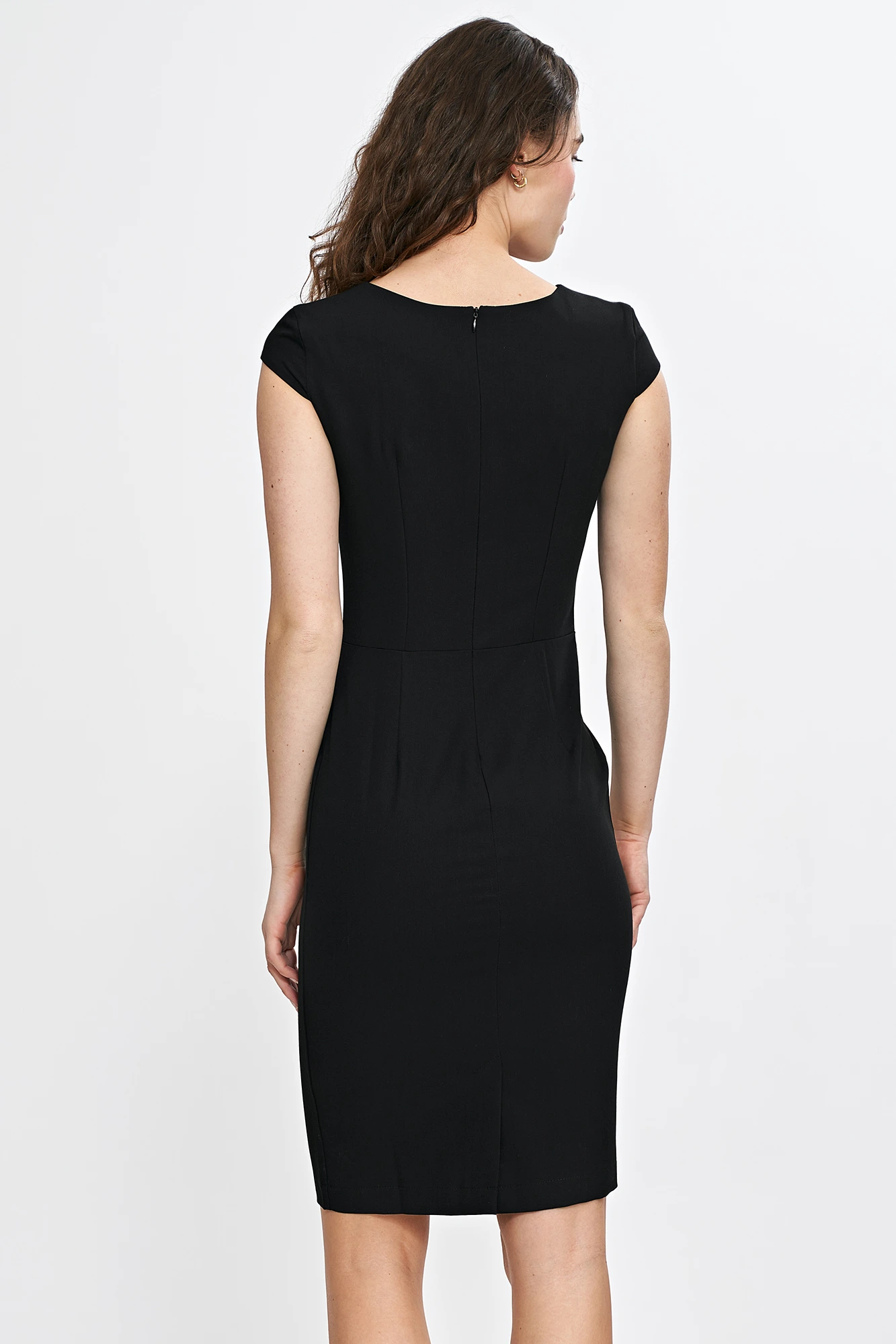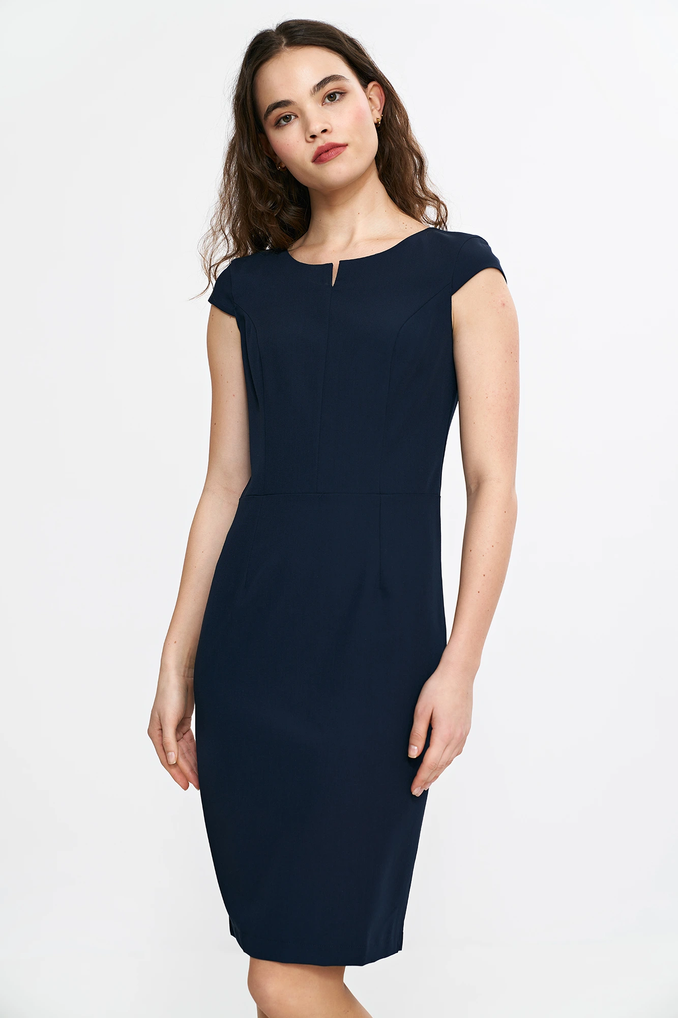 Model posiada krótki rękaw i charakterystyczne wycięcie przy dekolcie, które dodaje nowoczesnego charakteru klasycznej formie. Starannie zaprojektowane cięcia modelujące optycznie wysmuklają sylwetkę, a długość przed kolano sprawia, że sukienka świetnie sprawdzi się zarówno z butami na obcasie, jak i bardziej casualowymi dodatkami. Ukryty suwak z tyłu i niewielki rozporek zapewniają wygodę użytkowania oraz swobodę ruchów.