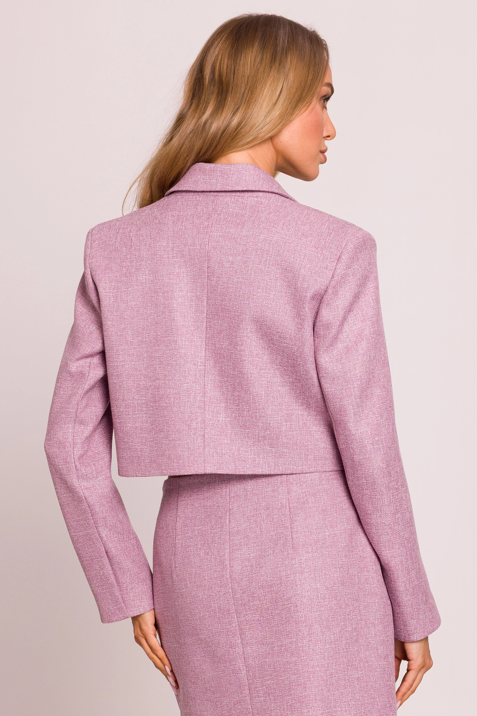 Ten elegancki komplet damski w kolorze marsala to nowoczesna propozycja dla kobiet, które cenią wyrafinowany styl i dopracowany krój. Zestaw składa się z krótkiej marynarki oraz spódniczki mini, tworząc spójną, kobiecą sylwetkę idealną na wyjątkowe okazje, przyjęcia, rodzinne uroczystości czy eleganckie wyjścia. Starannie zaprojektowane proporcje podkreślają talię, a minimalistyczne detale nadają całości szyku i subtelnej elegancji. To komplet damski, który łączy klasykę z modowym charakterem i świetnie prezentuje się zarówno noszony razem, jak i osobno.