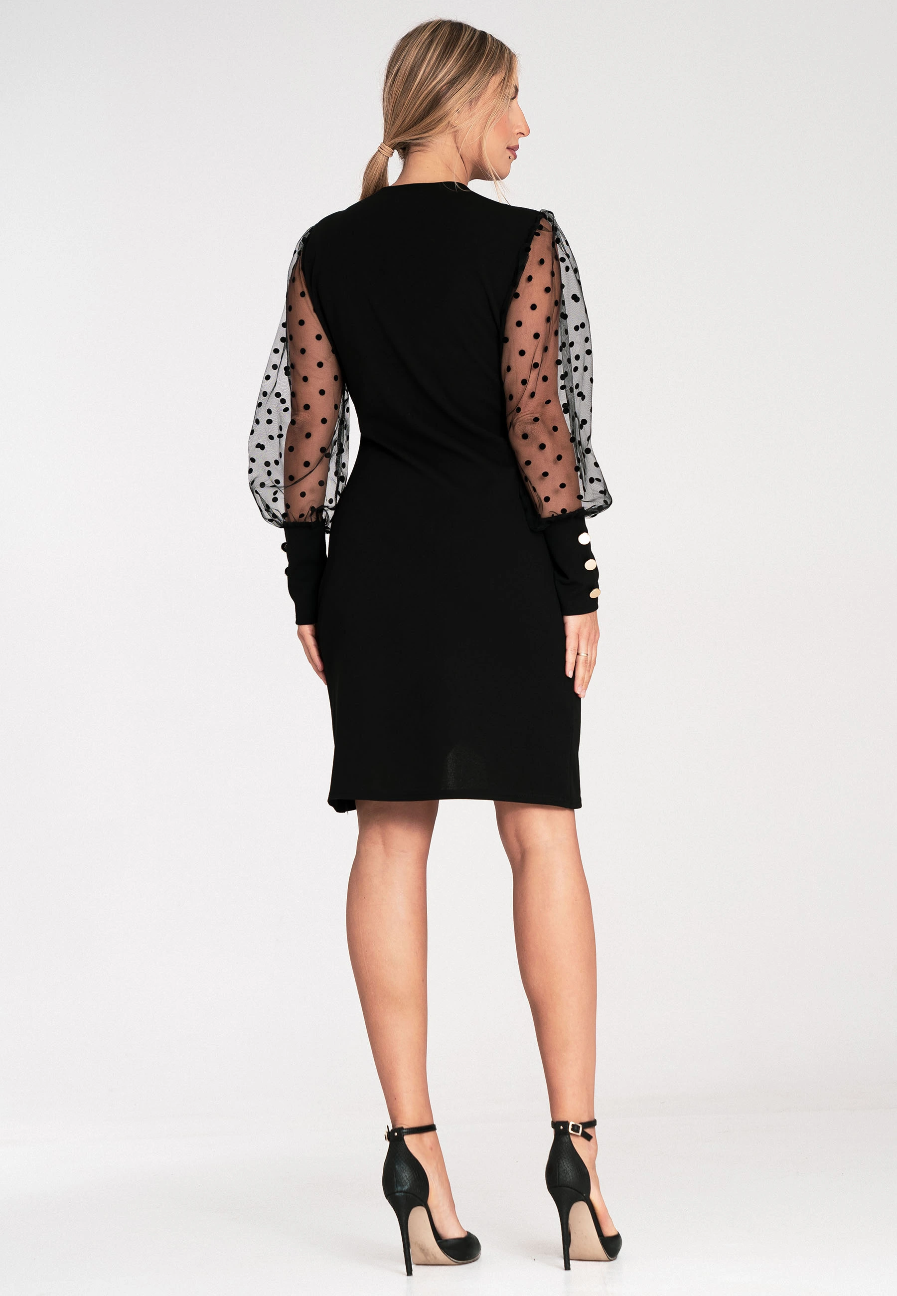 Kopertowa sukienka z tiulowymi rękawami w kropki i dekoltem V