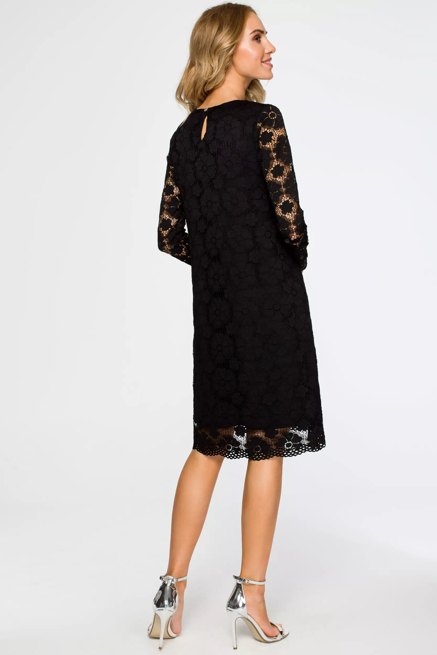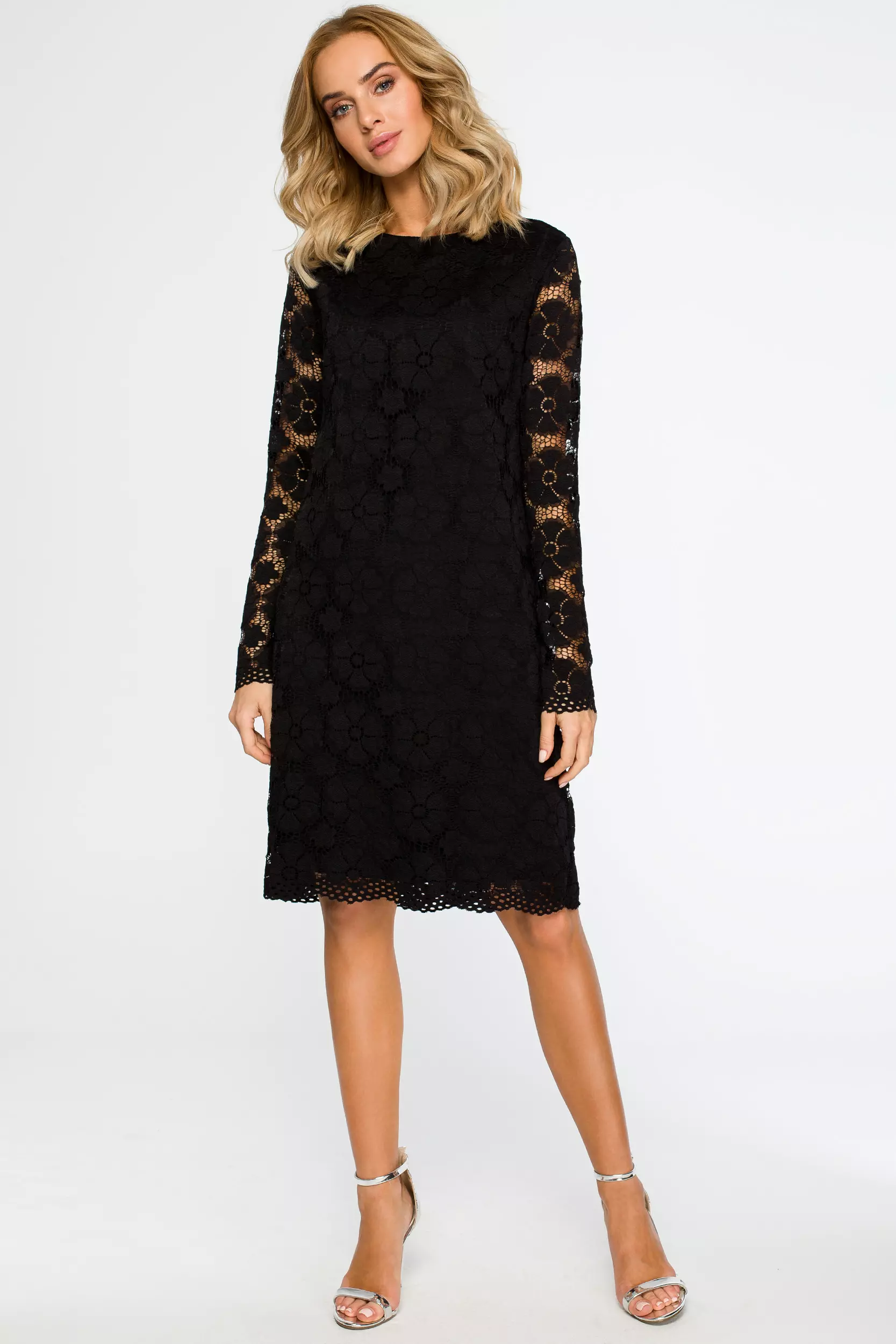 Koronkowa sukienka midi to propozycja dla kobiet kochających delikatne i romantyczne detale. Delikatny trapezowy fason pięknie podkreśla górną partię ciała i elegancko przysłania zbyt duże biodra czy obszerne uda. Niewielki dekolt przy szyi dodaje niewinności a pięknie wykończone rękawy tworzą harmonijną całość. Oryginalność zawdzięczamy tutaj koronce, która w dziewczęcy sposób zdobi sukienkę.