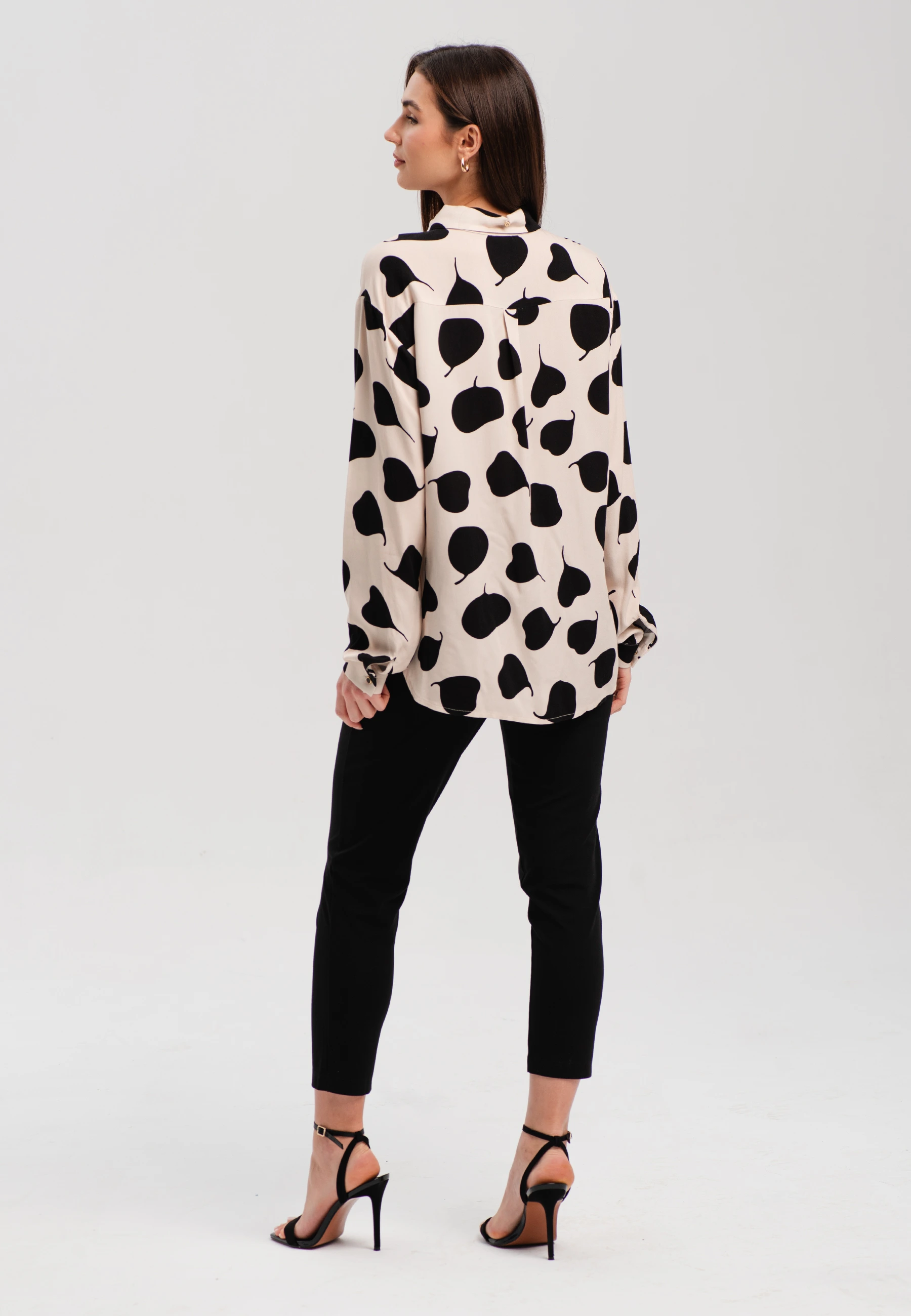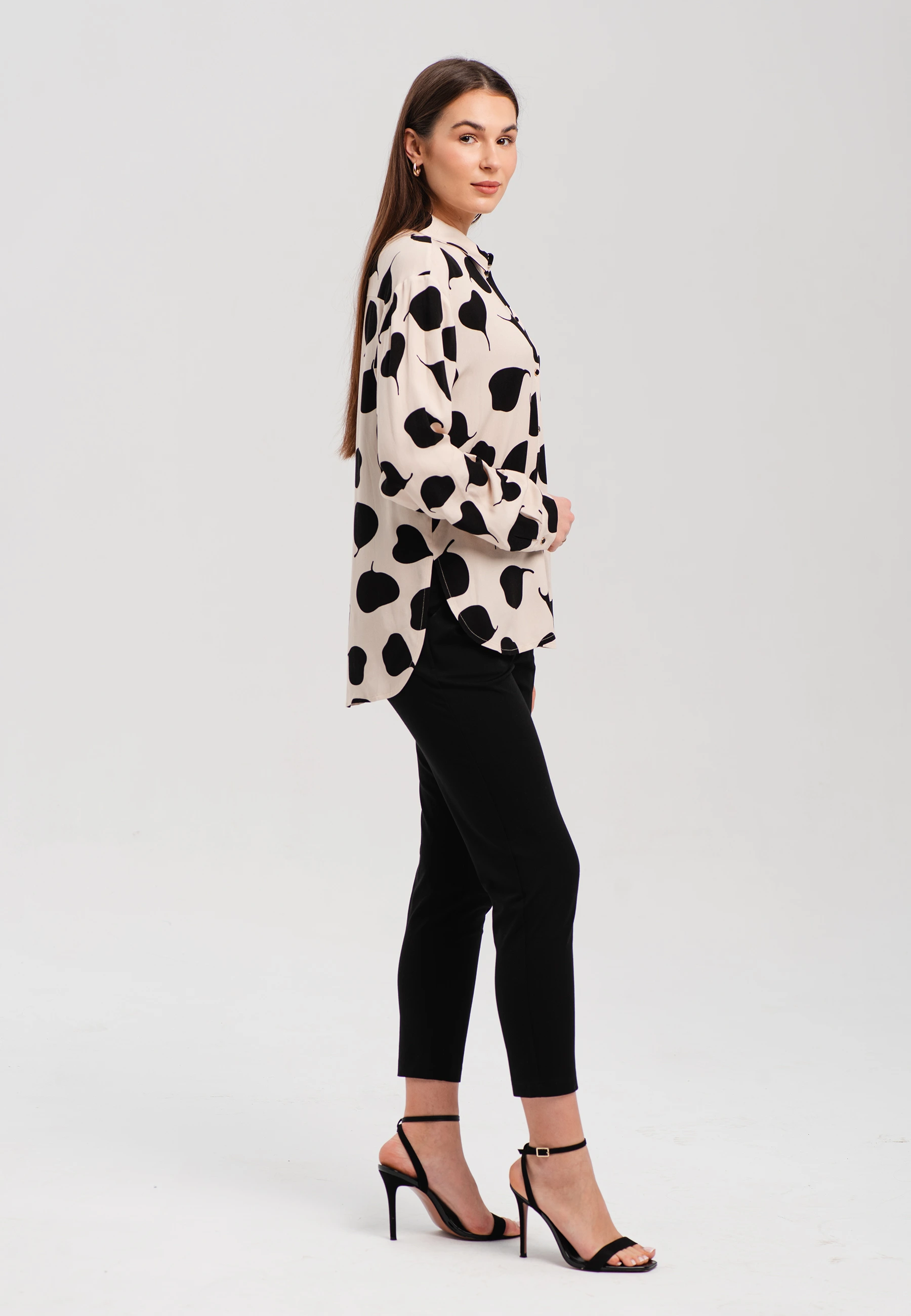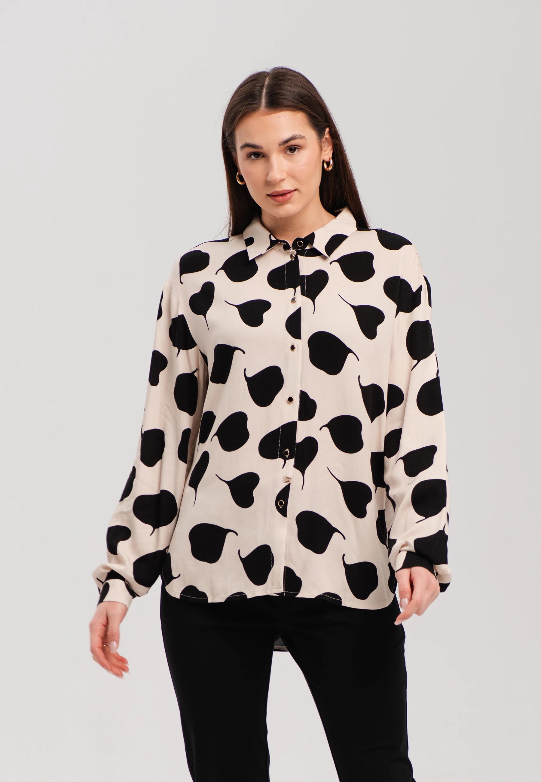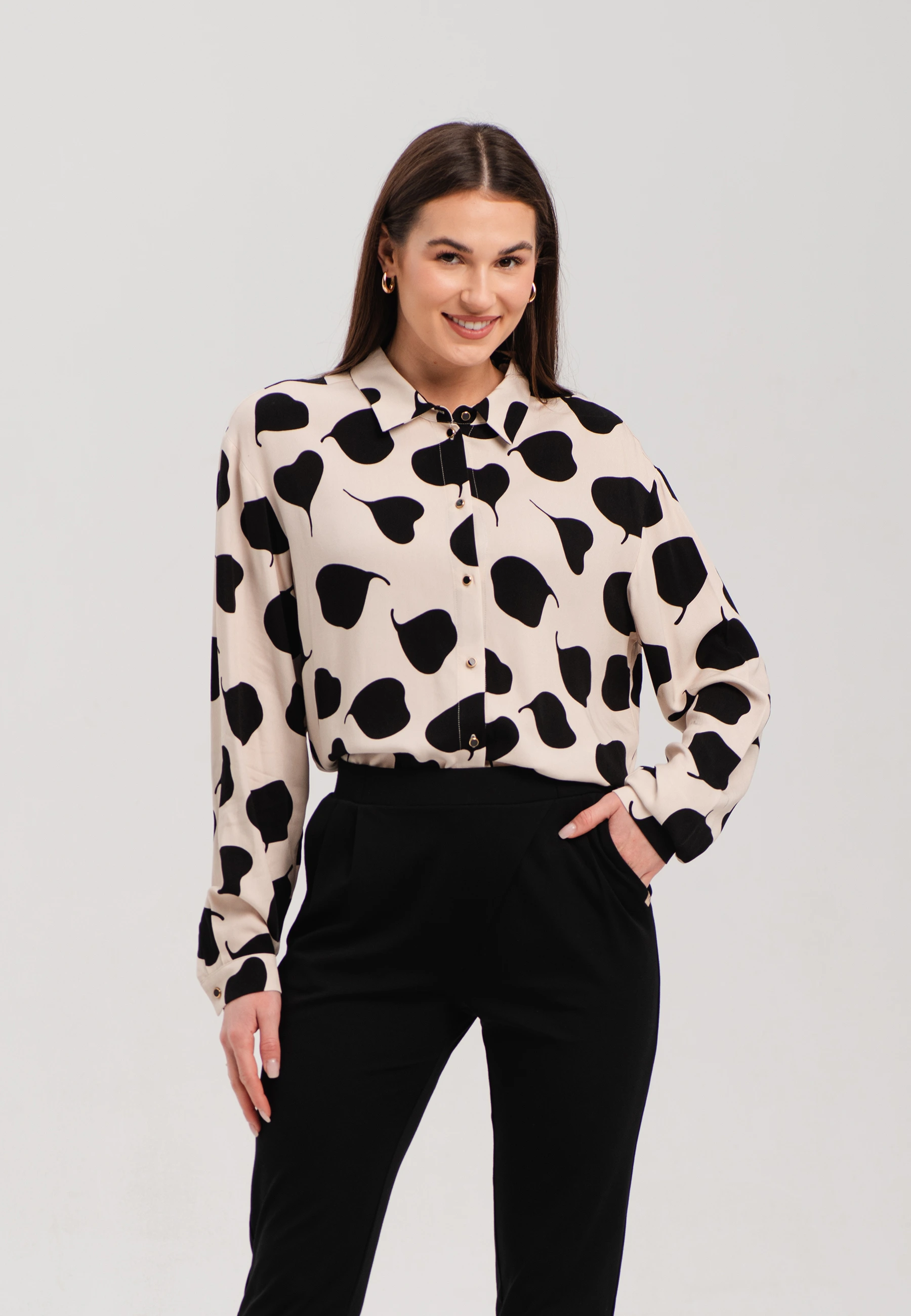 Elegancka koszula o swobodnym fasonie to doskonały wybór dla kobiet ceniących wygodę i modny wygląd. Klasyczny kołnierzyk oraz zapięcie na guziki nadają jej ponadczasowego charakteru, a oryginalny nadruk w duże kształty sprawia, że model przyciąga uwagę i wyróżnia się w każdej stylizacji.