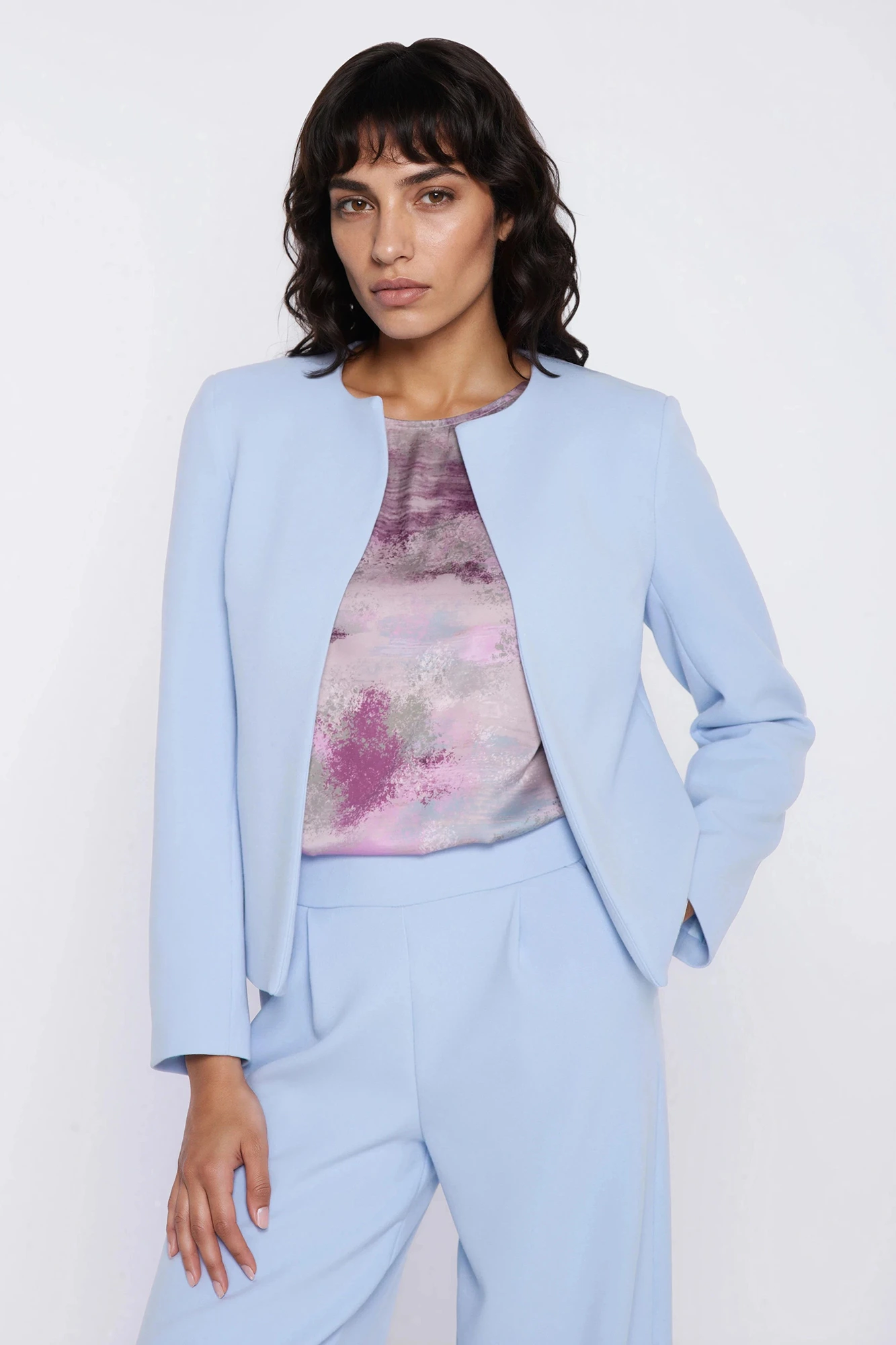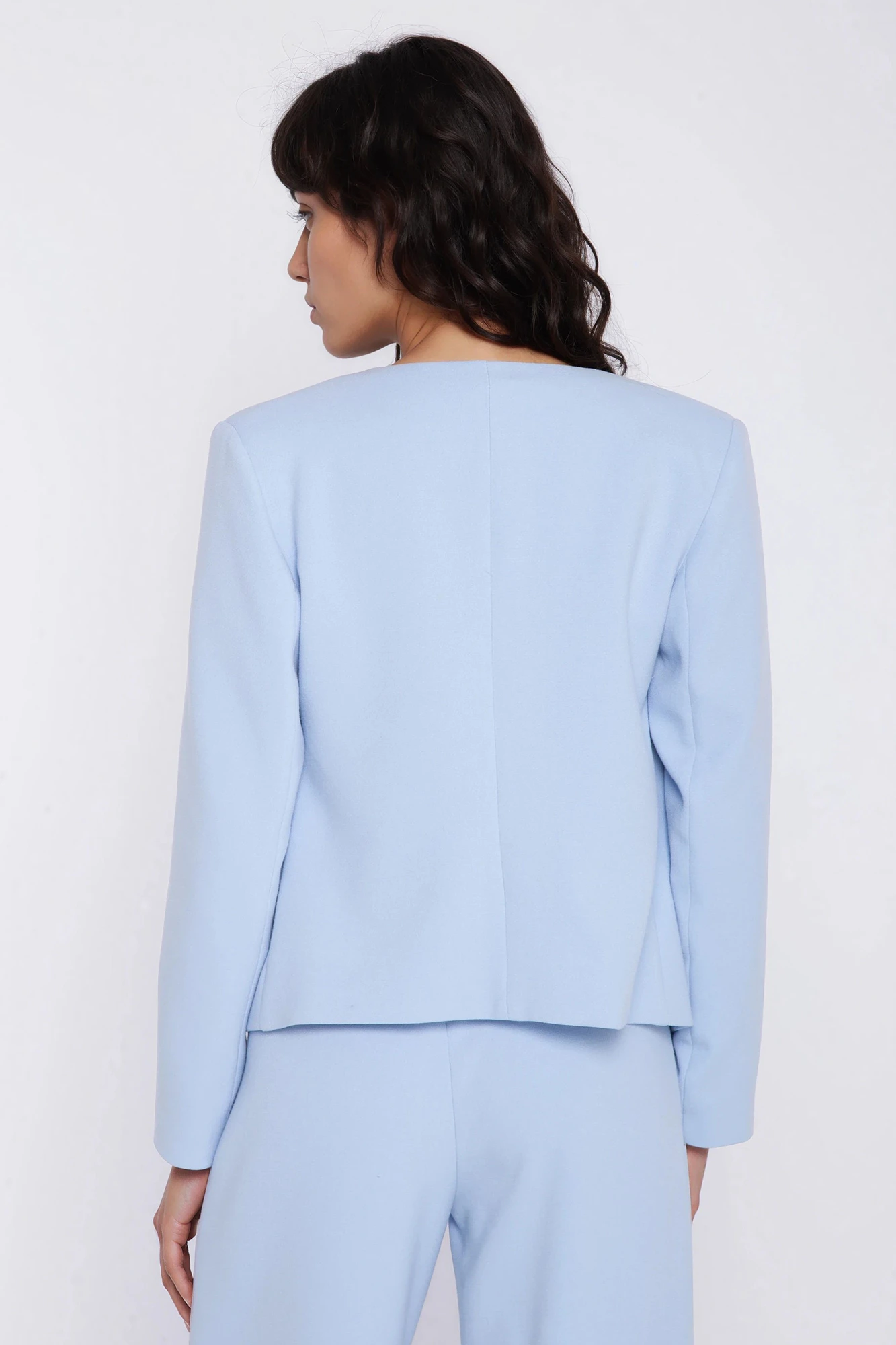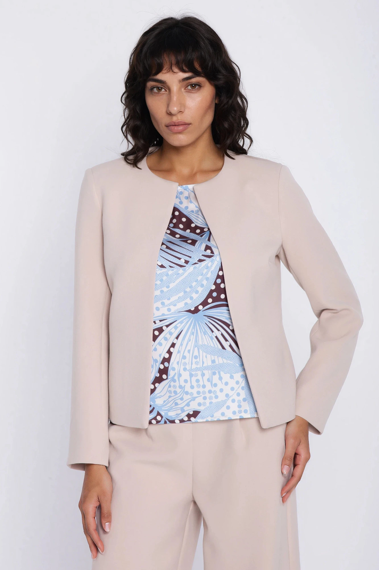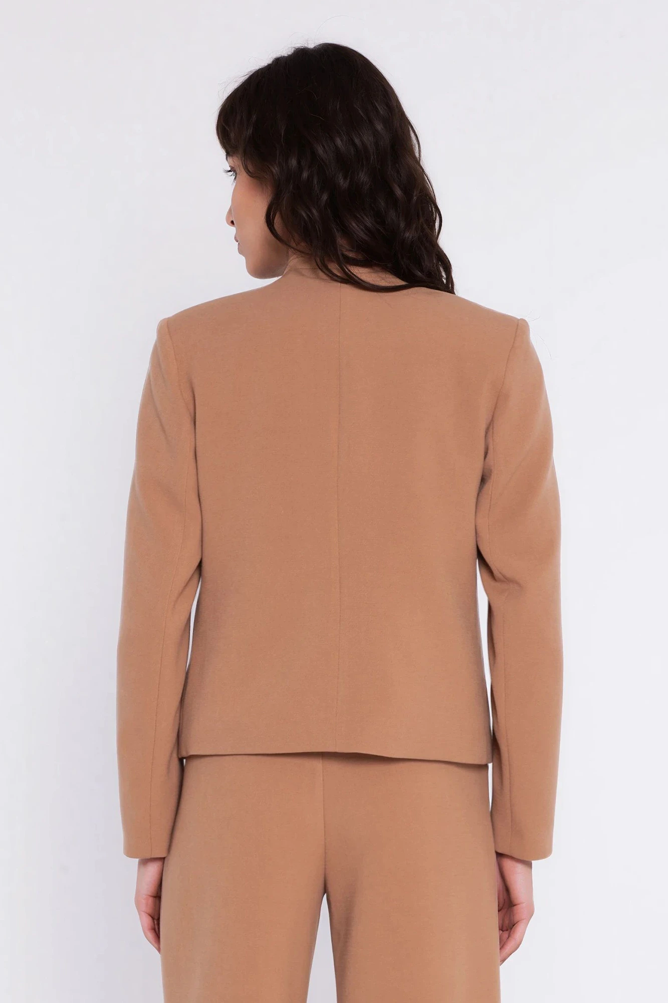 Krótka marynarka damska o minimalistycznym fasonie to idealna propozycja dla kobiet, które cenią prostotę, nowoczesny styl i uniwersalne kroje. Krótsza linia świetnie komponuje się zarówno ze spodniami z wysokim stanem, jak i spódnicą, tworząc spójne stylizacje do pracy, na spotkanie lub na wyjątkowe okazje. Otwarty przód i brak klasycznych klap podkreślają minimalistyczny charakter modelu, a starannie dopracowany krój zapewnia estetyczne ułożenie na sylwetce. To ponadczasowa marynarka damska, która doskonale uzupełni garderobę kapsułową i elegancki dress code.