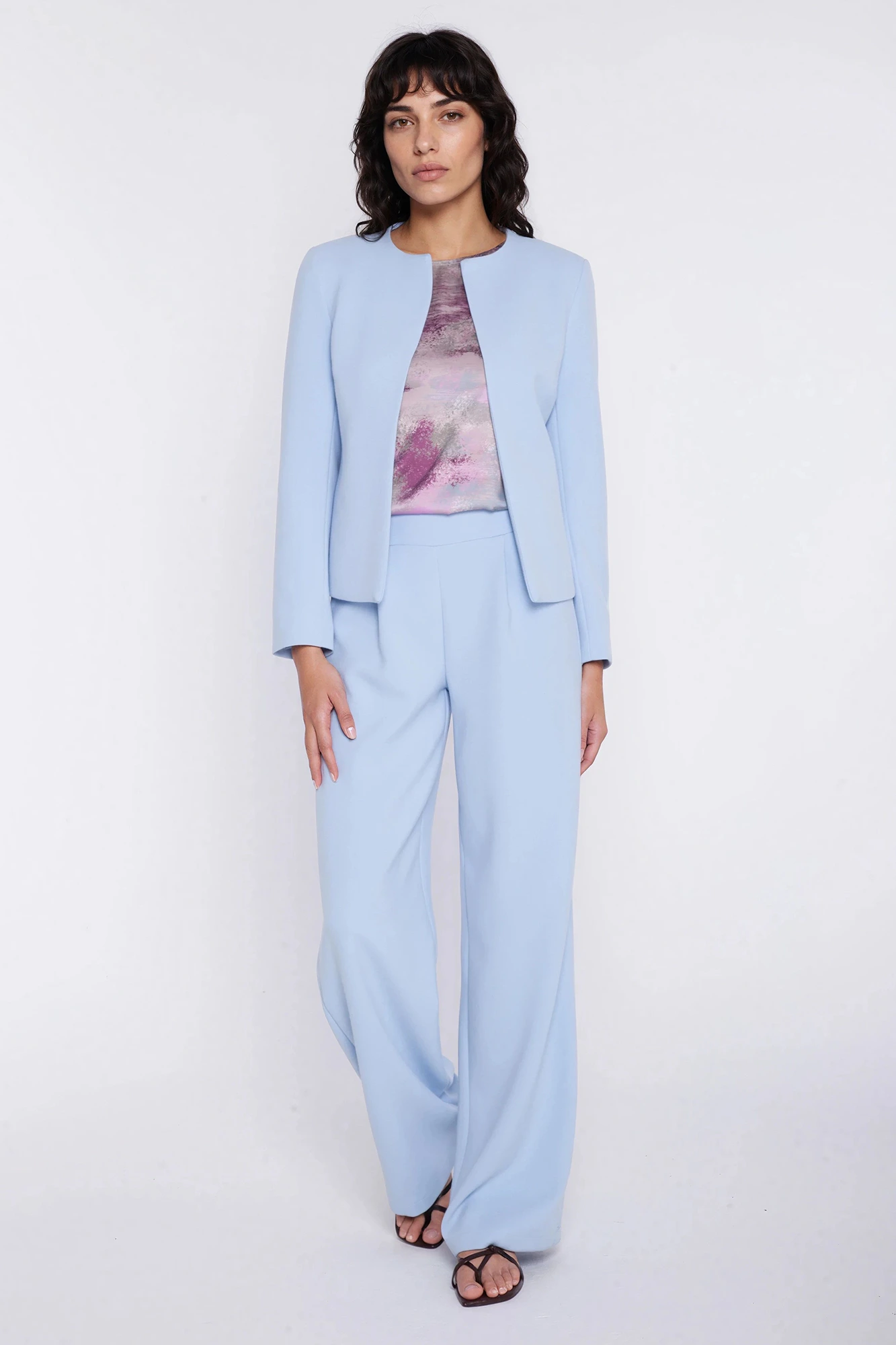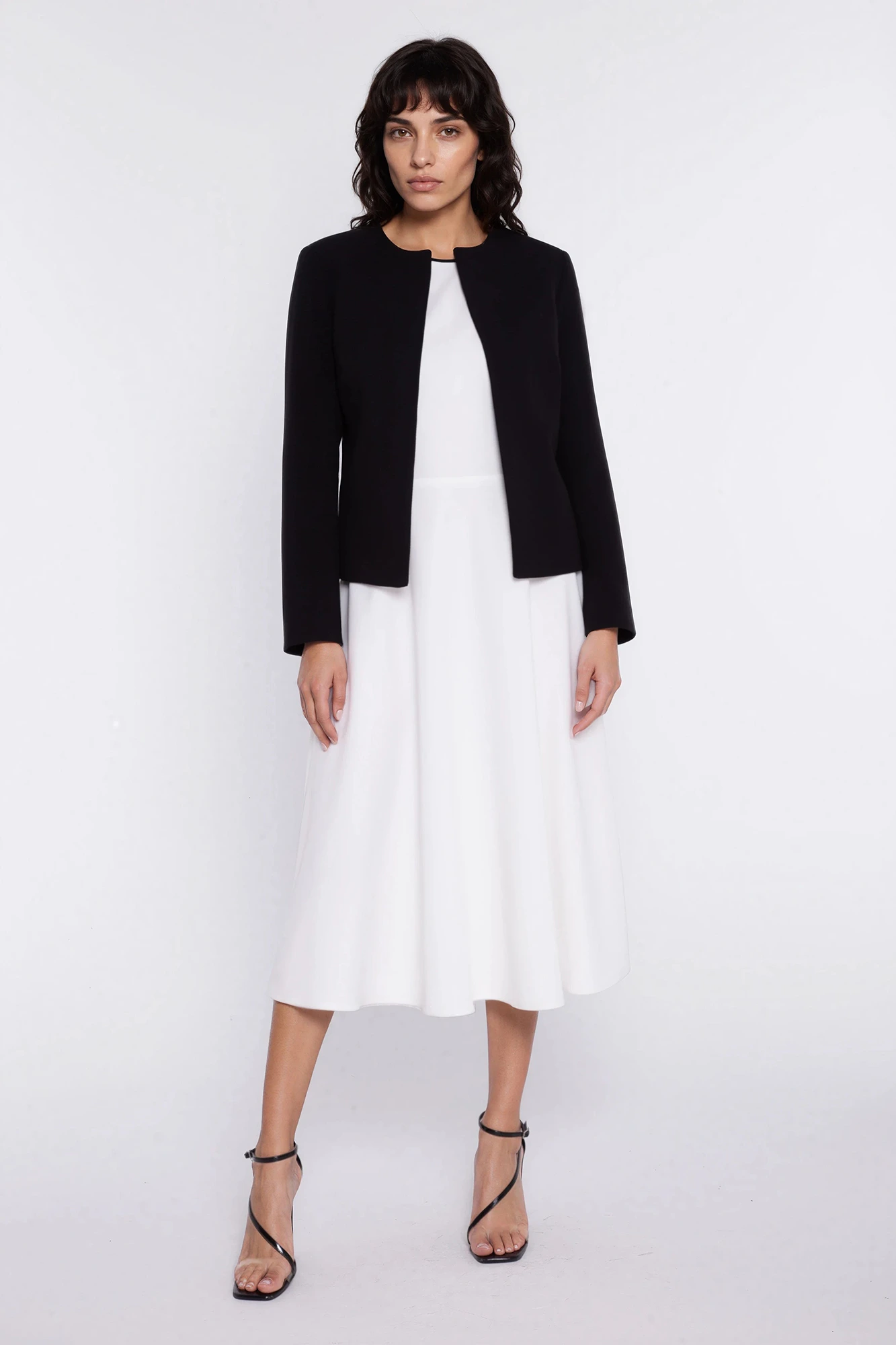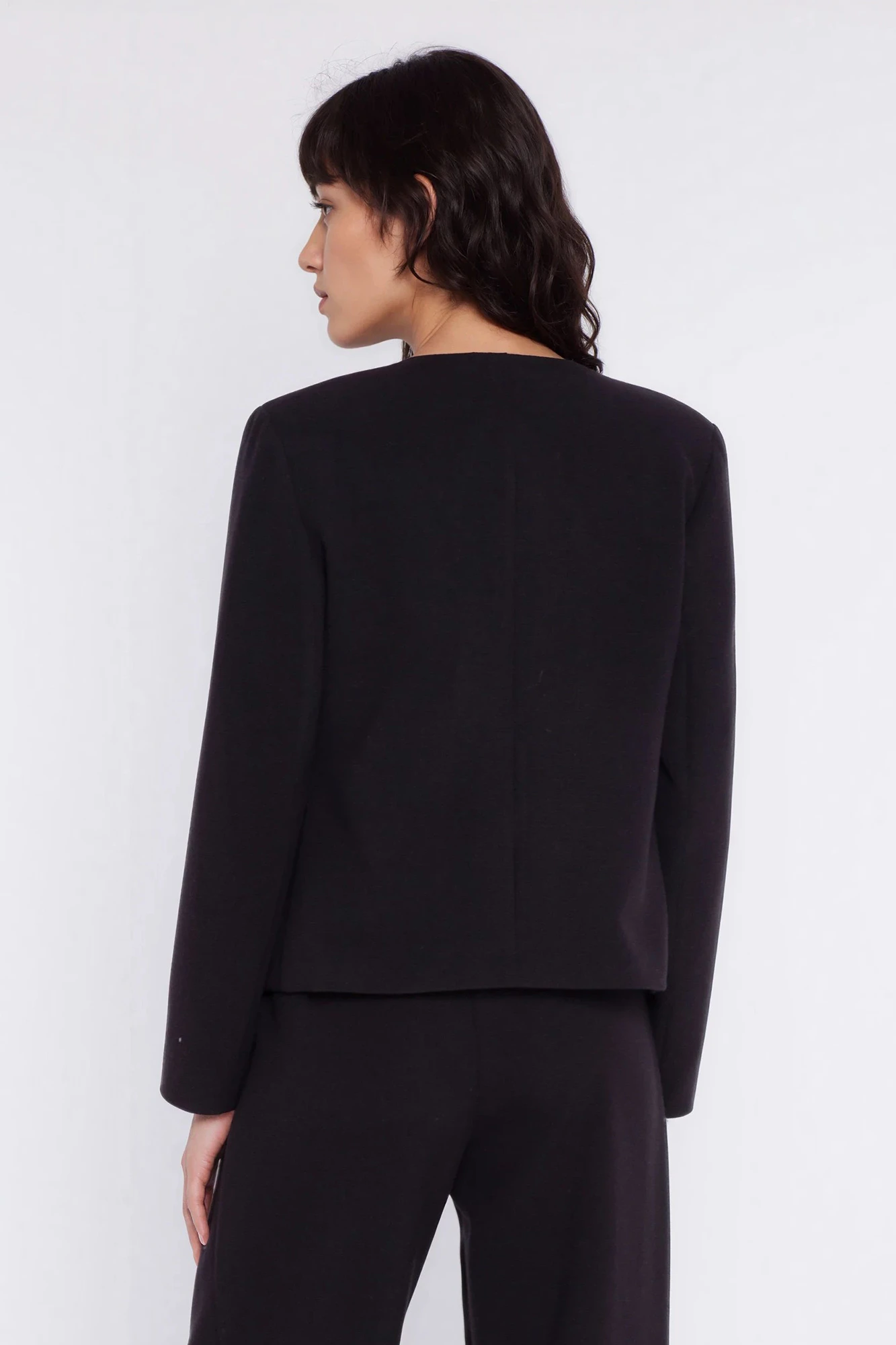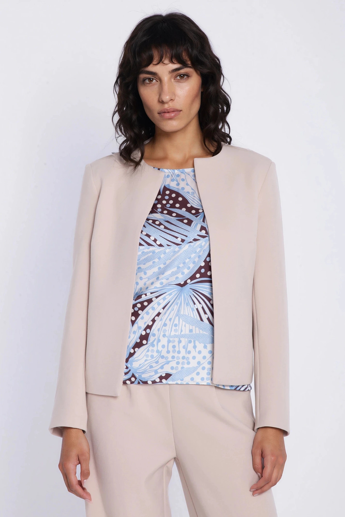 Krótka marynarka damska o minimalistycznym fasonie to idealna propozycja dla kobiet, które cenią prostotę, nowoczesny styl i uniwersalne kroje. Krótsza linia świetnie komponuje się zarówno ze spodniami z wysokim stanem, jak i spódnicą, tworząc spójne stylizacje do pracy, na spotkanie lub na wyjątkowe okazje. Otwarty przód i brak klasycznych klap podkreślają minimalistyczny charakter modelu, a starannie dopracowany krój zapewnia estetyczne ułożenie na sylwetce. To ponadczasowa marynarka damska, która doskonale uzupełni garderobę kapsułową i elegancki dress code.