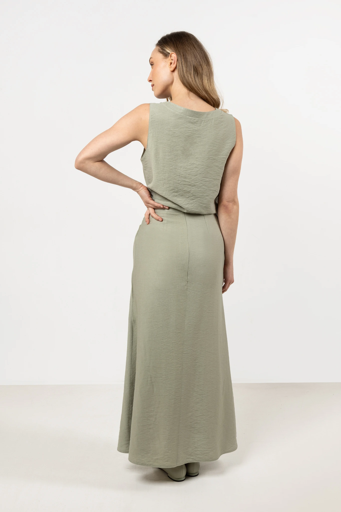 Ten kobiecy komplet składający się z lekkiej bluzki bez rękawów oraz długiej spódnicy to świetna propozycja na letnie stylizacje. Minimalistyczna forma i subtelna faktura materiału sprawiają, że zestaw prezentuje się bardzo nowocześnie i stylowo. Bluzka z dekoltem w serek pięknie eksponuje szyję, a prosty fason zapewnia swobodę ruchów. Spódnica o długości maxi z wysokim stanem i rozcięciem z boku dodaje sylwetce smukłości, a jednocześnie podkreśla kobiecą linię bioder.