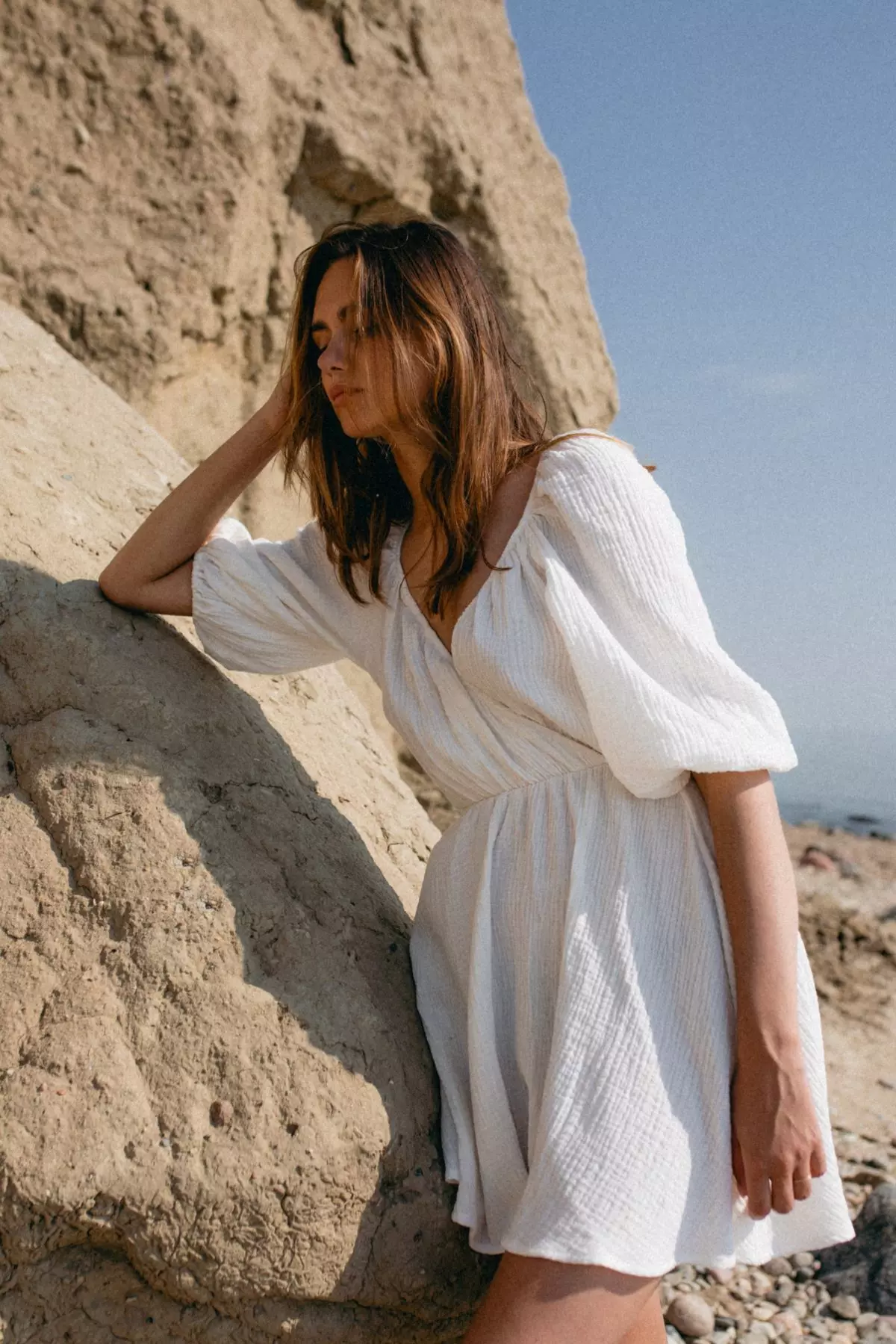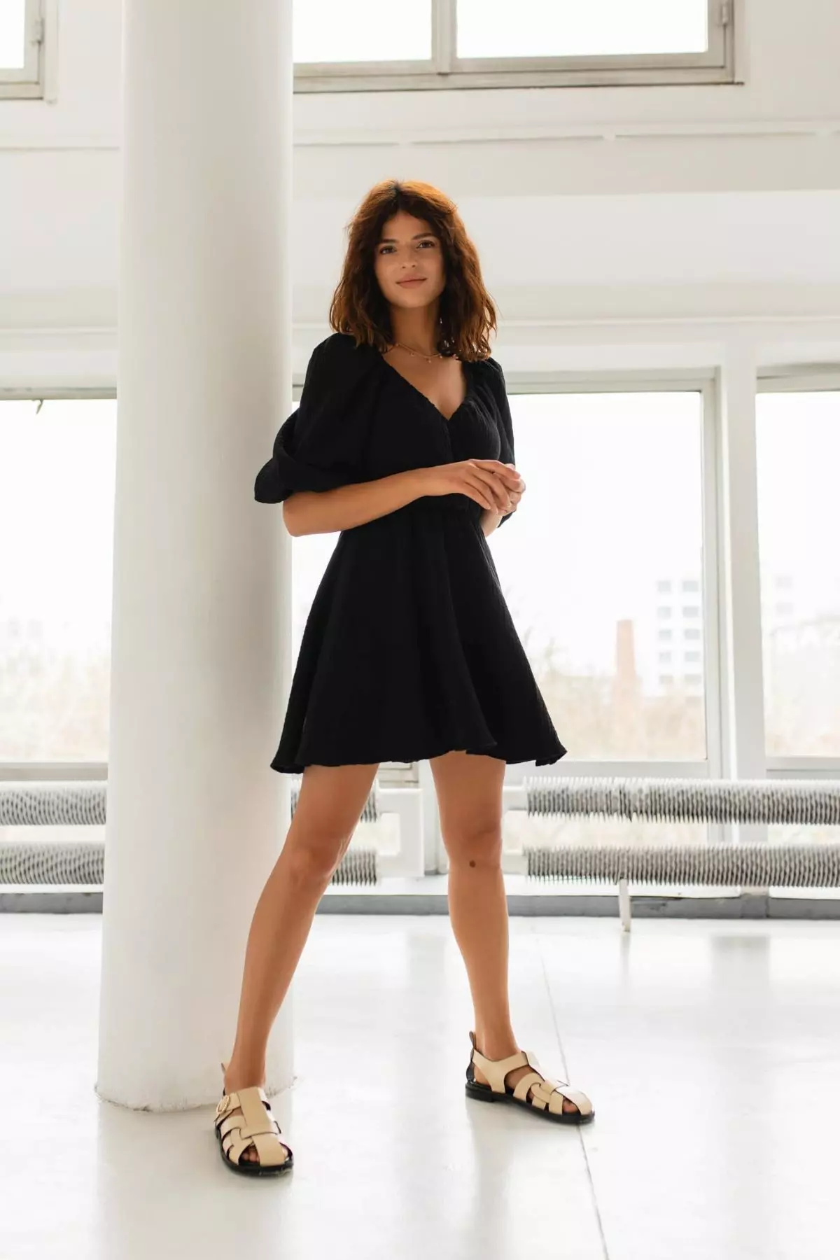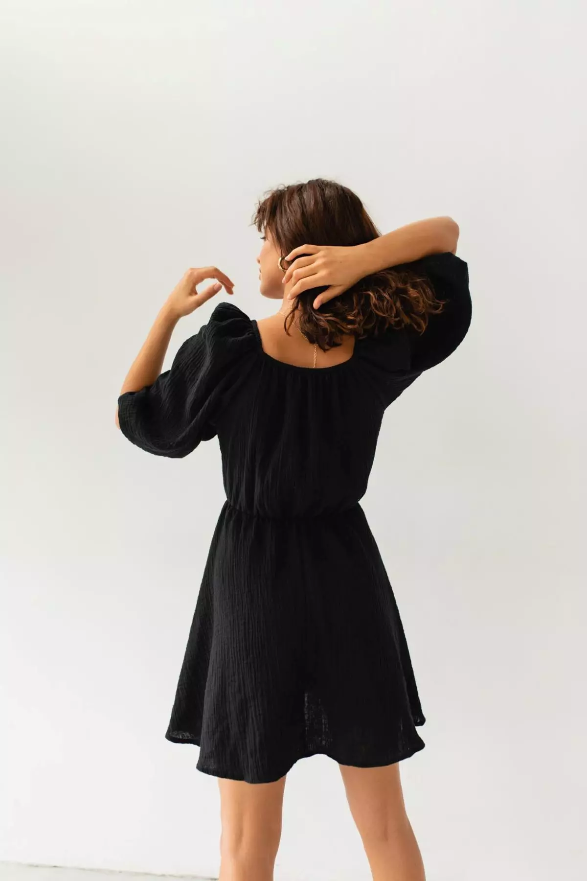 Letnia kopertowa sukienka z muślinu to model o klasycznym fasonie z balonowymi rękawami do łokci. Dekolt na zakładkę i długość przed kolano dodają całości mnóstwo dziewczęcego wdzięku, a bawełniana tkanina jest przyjemna w dotyku i posiada charakterystyczną dla muślinu delikatną fakturę. Dekolt na zakładkę, podkreślona talia i lekko rozkloszowany dół pięknie podkreślają figurę, a klasyczny fason sprawdzi się na wiele okazji i może być różnorodnie stylizowany w zależności od doboru butów i dodatków.
