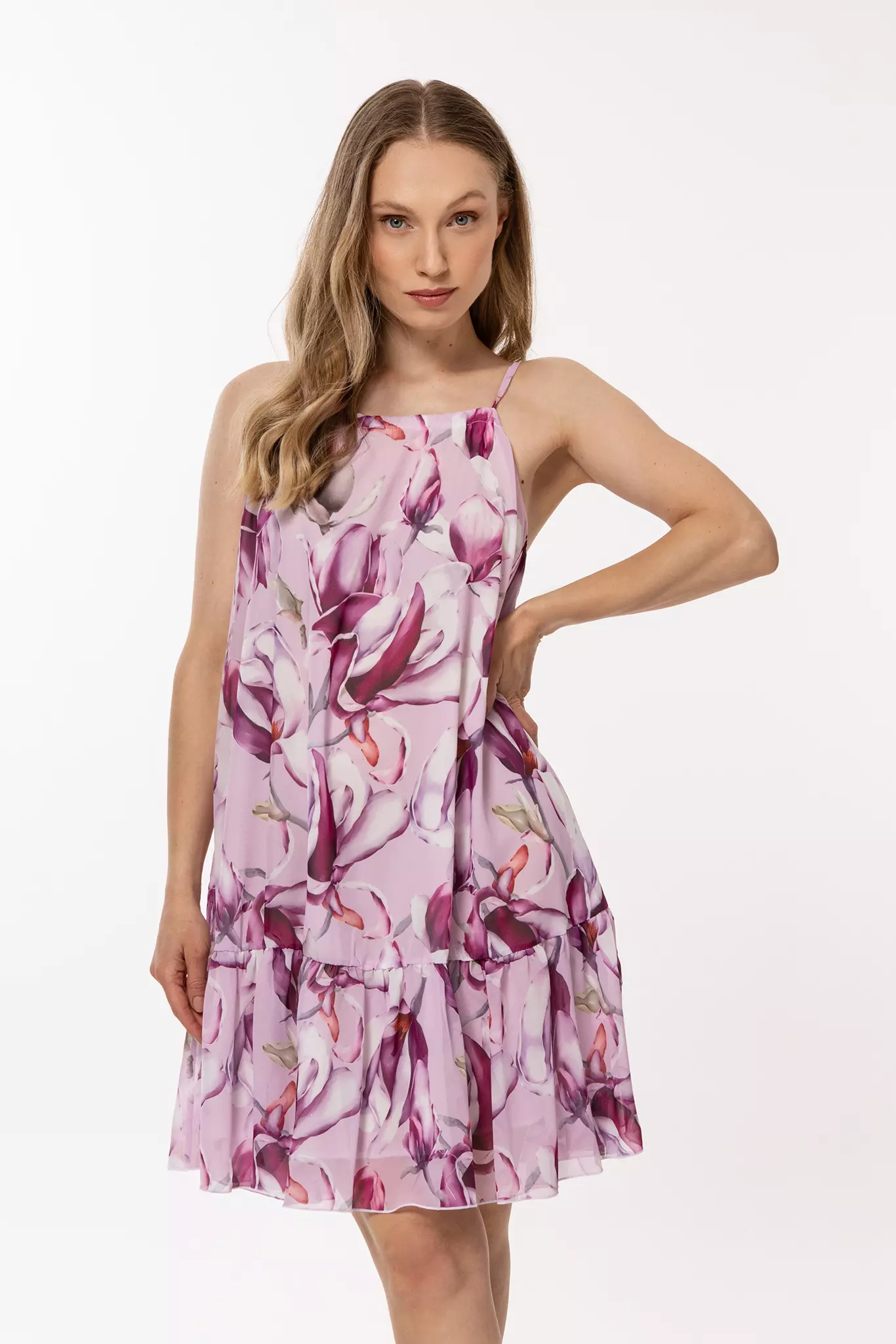 Letnia szyfonowa sukienka w kwiaty to lekka i przewiewna sukienka idealna na ciepłe dni. Wykonana z delikatnego materiału, który zapewnia komfort noszenia, sukienka wyróżnia się pięknym, kwiatowym wzorem w odcieniach niebieskiego. Sukienka ma prosty, ale efektowny krój z cienkimi ramiączkami, co nadaje jej lekkości i swobody. Luźny fason pozwala na pełną swobodę ruchów, a zarazem podkreśla kobiecą sylwetkę. Idealna na letnie spacery, plażowe wyjścia czy wakacyjne przygody.