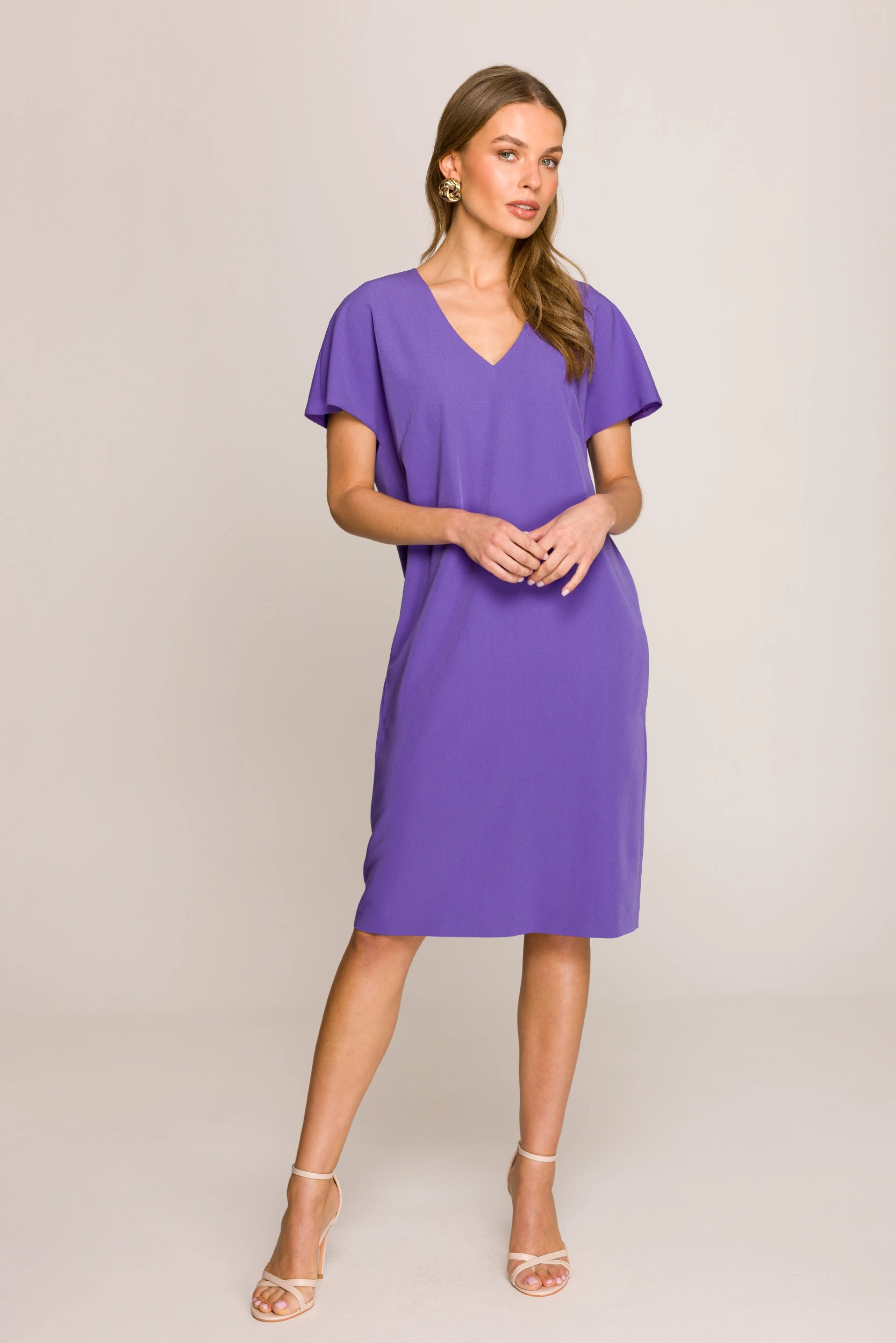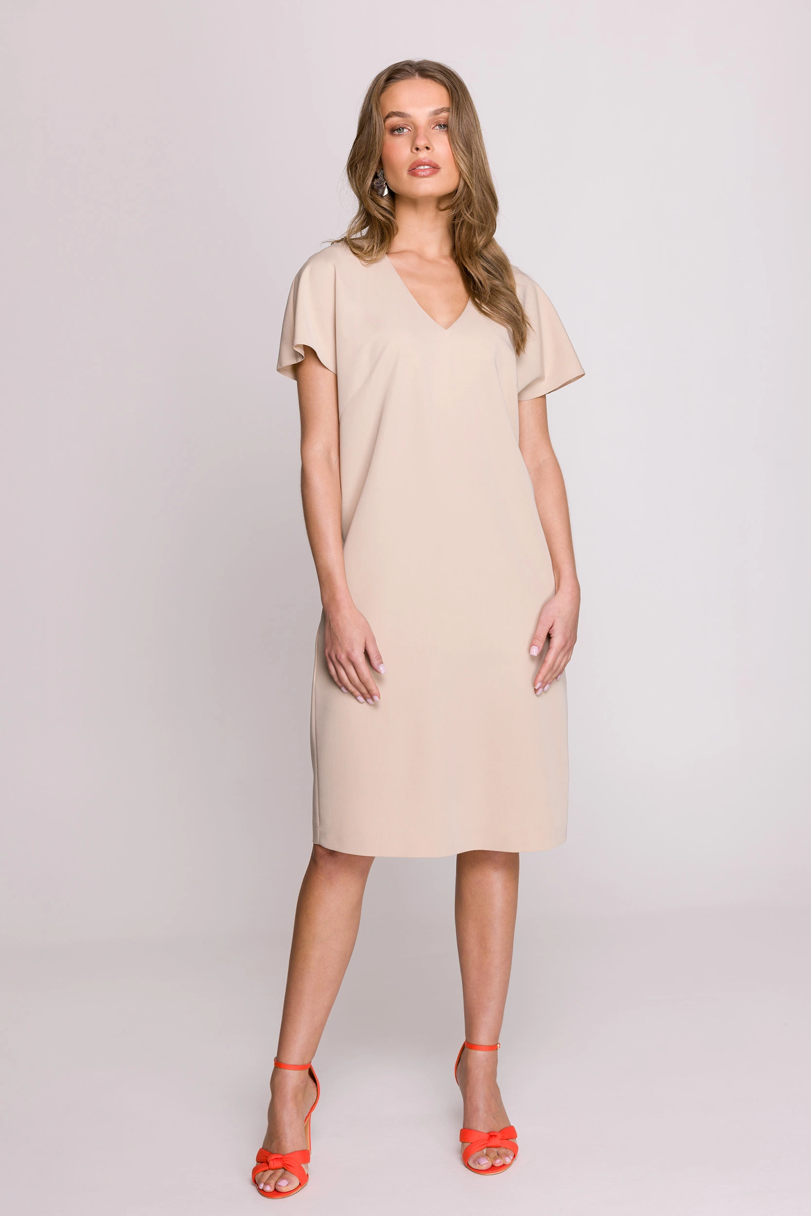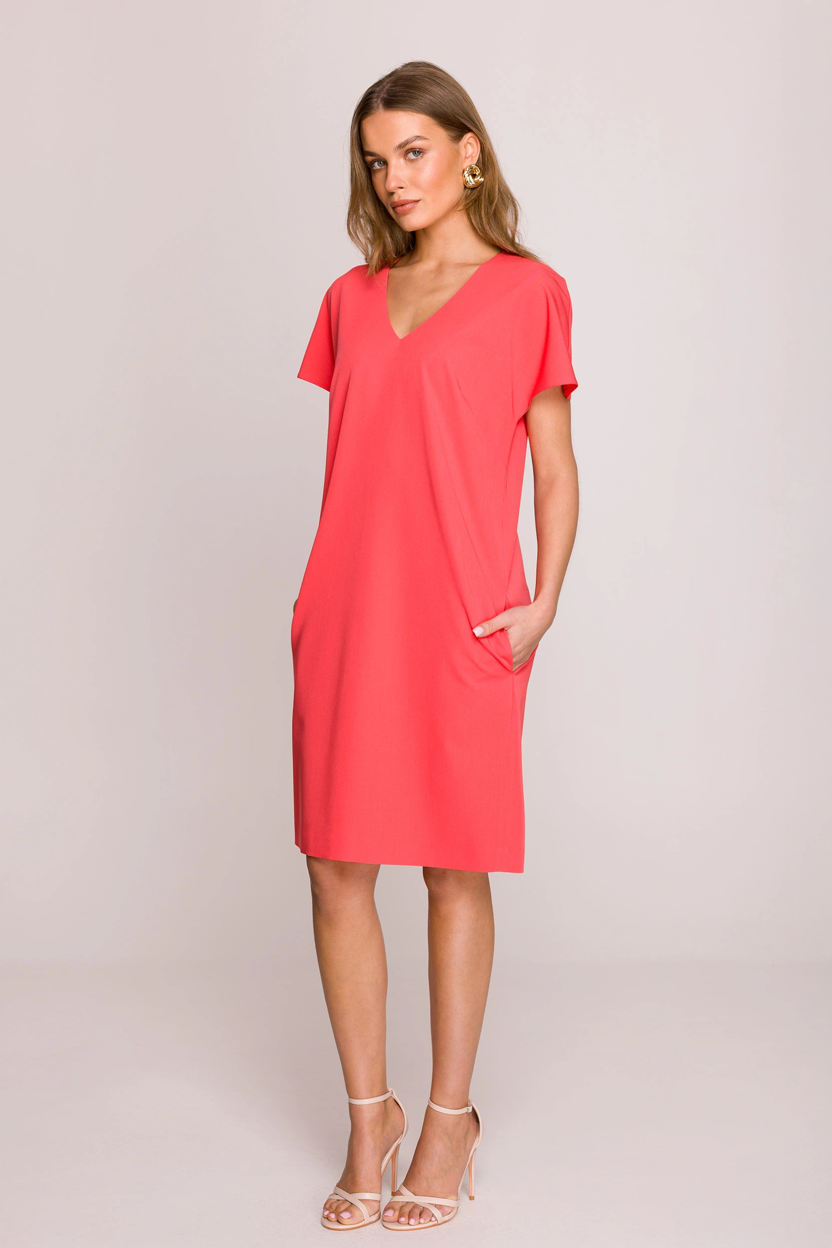 Luźna sukienka midi z dekoltem V i kieszeniami to elegancka propozycja dla kobiet, które cenią wygodę i ponadczasowy styl. Model ma swobodny, prosty fason, który miękko układa się na sylwetce i zapewnia komfort noszenia przez cały dzień. Krótkie, delikatnie opadające rękawy oraz długość do kolan sprawiają, że sukienka świetnie sprawdzi się zarówno na co dzień, jak i na bardziej eleganckie okazje. To uniwersalna sukienka damska, która łączy minimalistyczną formę z kobiecym wykończeniem i praktycznymi detalami.