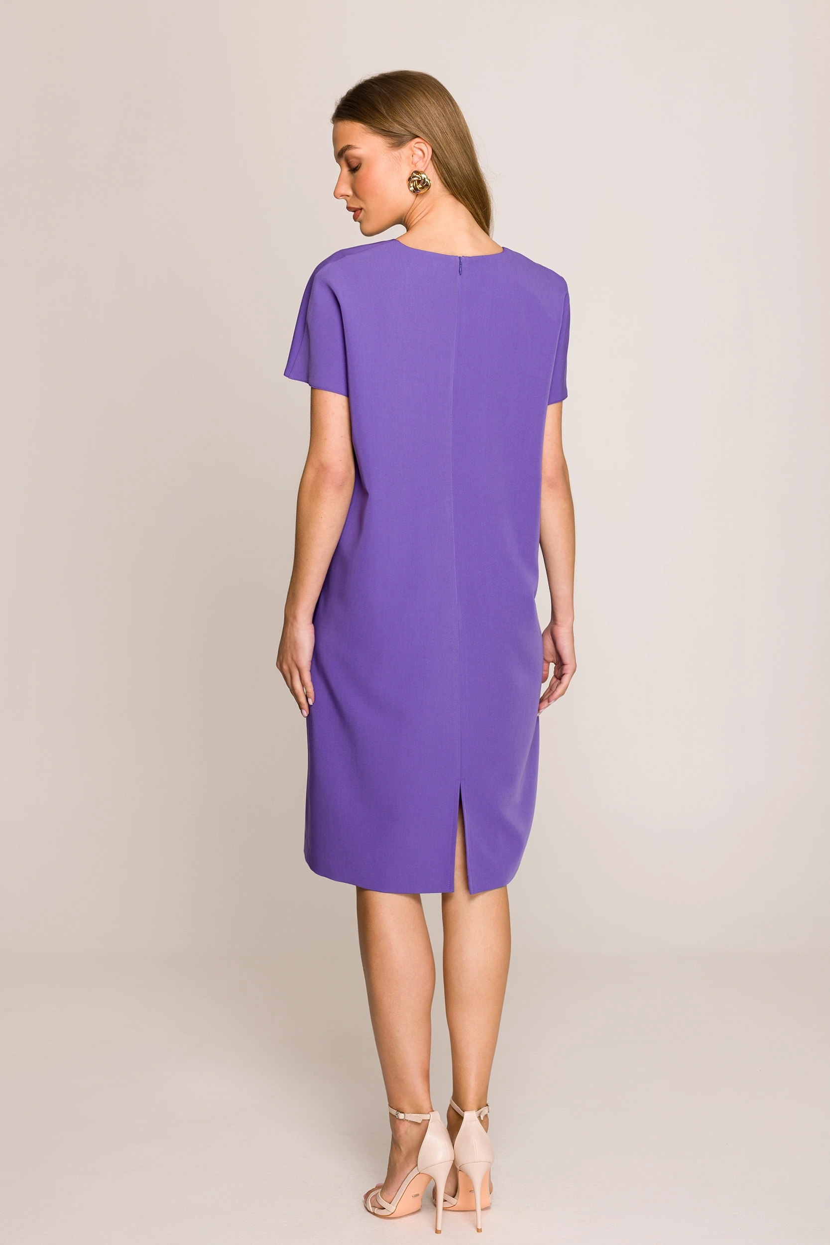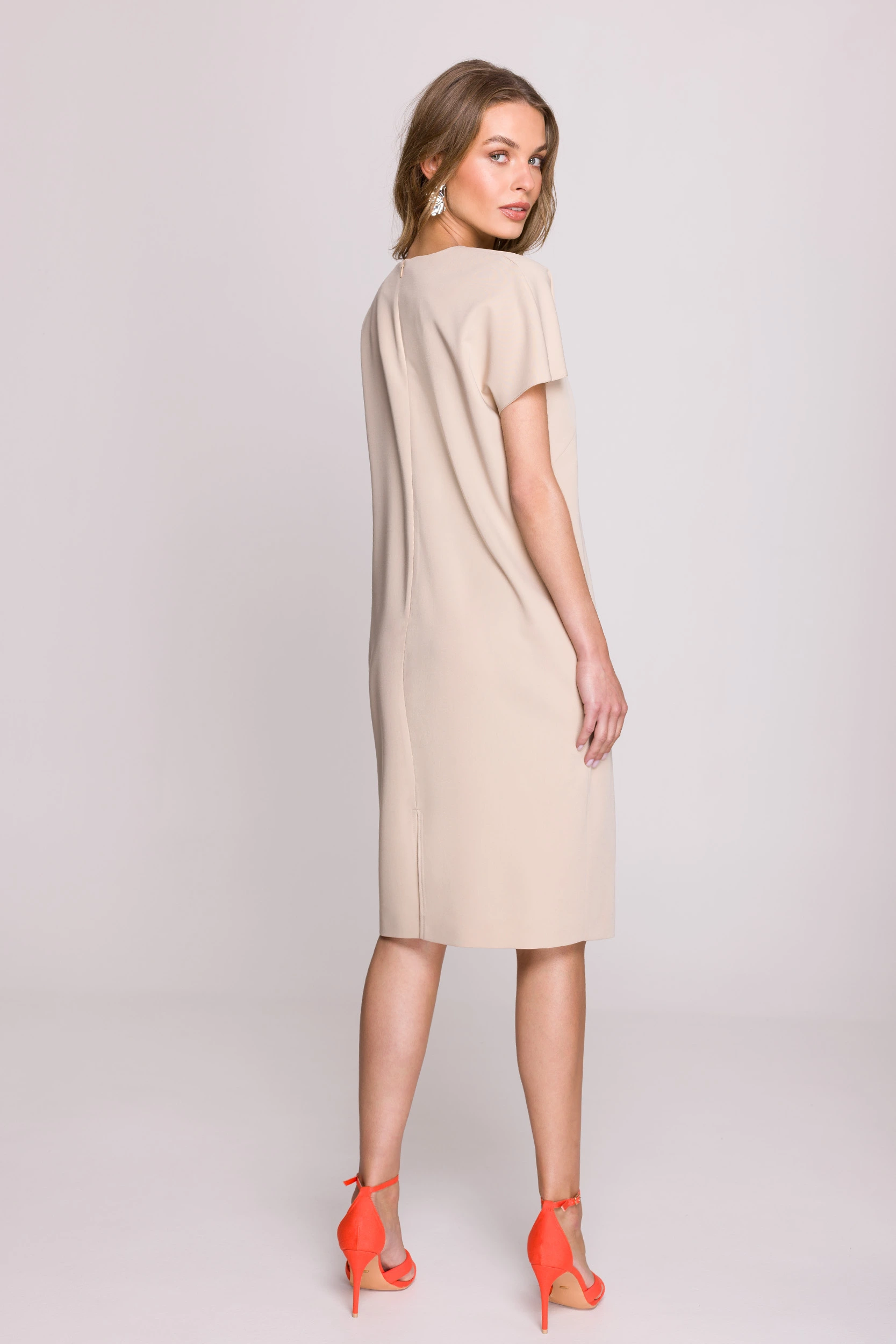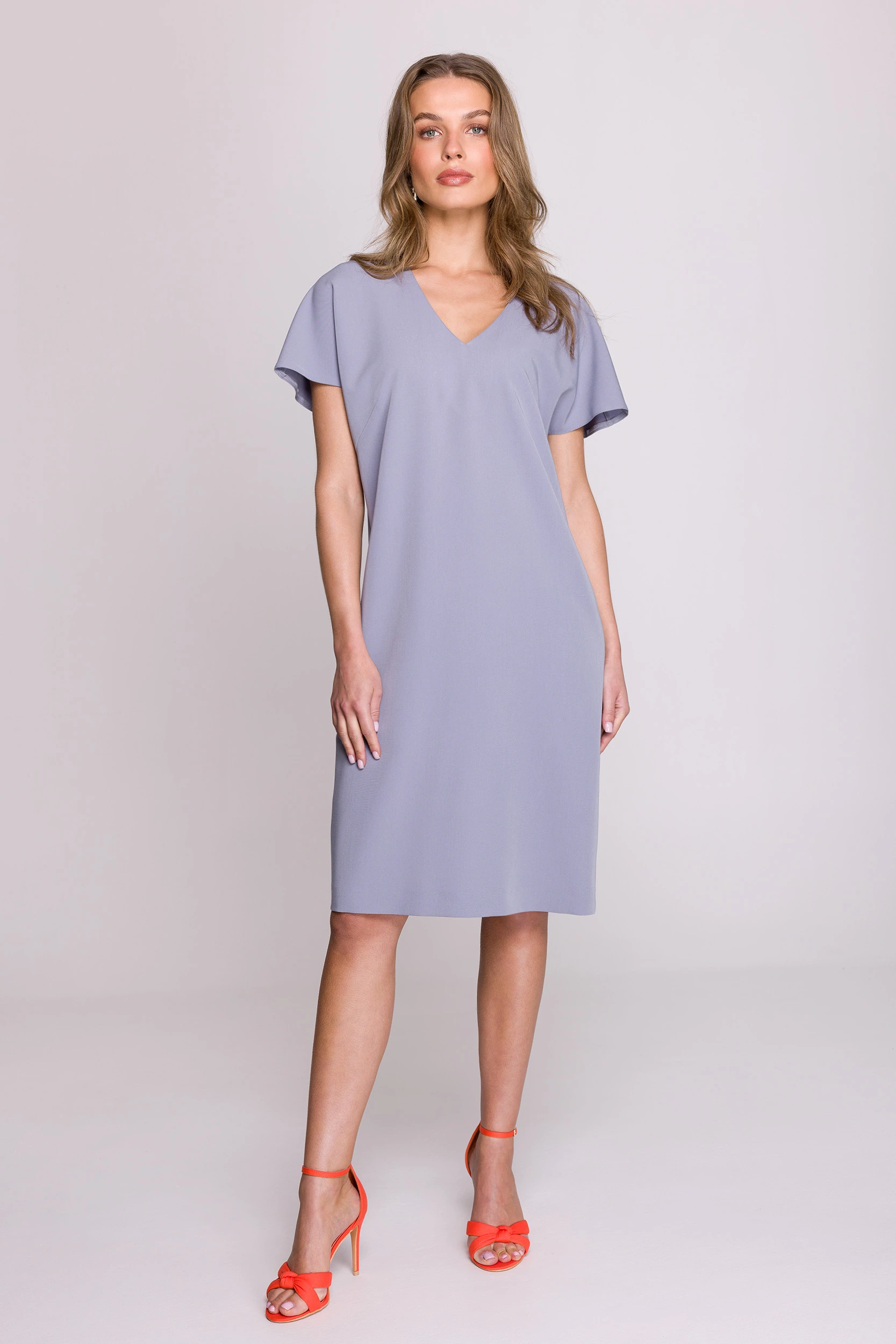 Luźna sukienka midi z dekoltem V i kieszeniami to elegancka propozycja dla kobiet, które cenią wygodę i ponadczasowy styl. Model ma swobodny, prosty fason, który miękko układa się na sylwetce i zapewnia komfort noszenia przez cały dzień. Krótkie, delikatnie opadające rękawy oraz długość do kolan sprawiają, że sukienka świetnie sprawdzi się zarówno na co dzień, jak i na bardziej eleganckie okazje. To uniwersalna sukienka damska, która łączy minimalistyczną formę z kobiecym wykończeniem i praktycznymi detalami.
