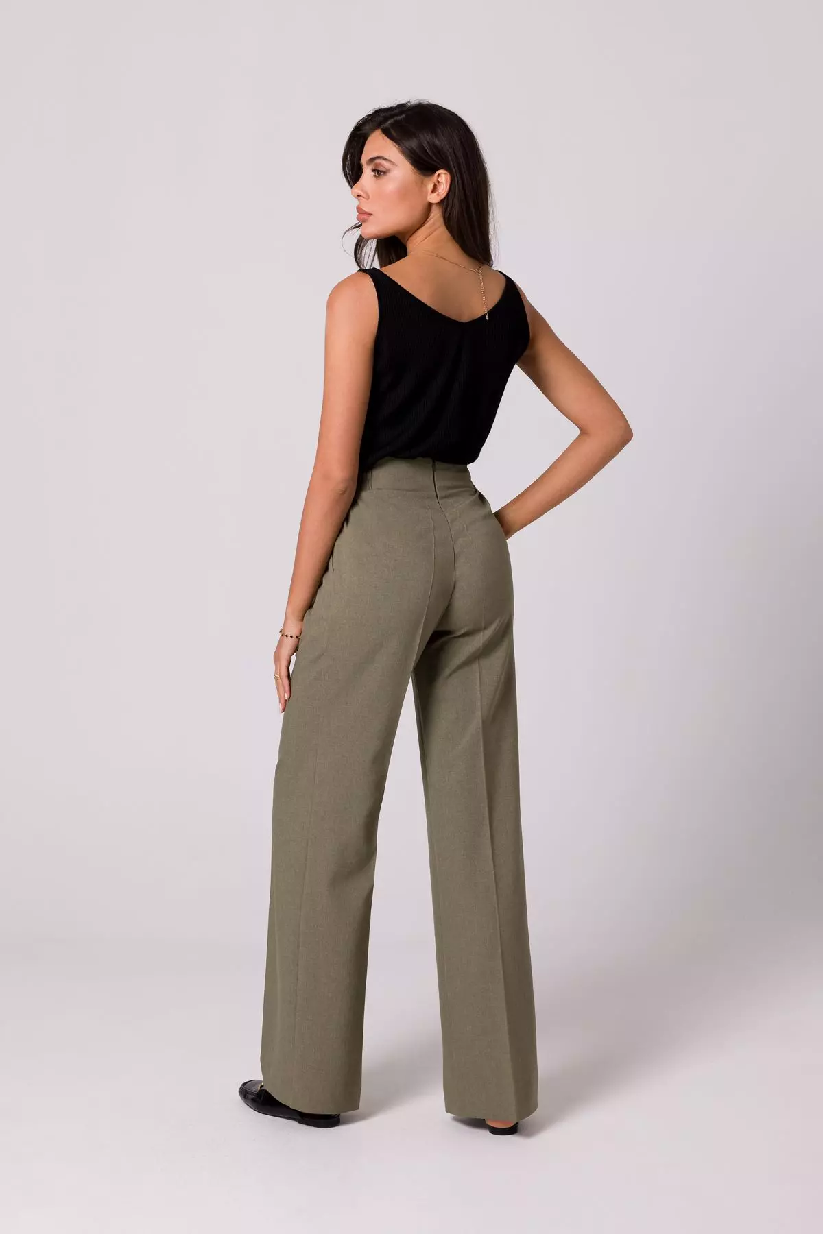 Luźne spodnie z wysokim stanem skutecznie ukryją niedoskonałości i podkreślą talię. To idealny model praktycznie dla każdego typu figury. Dodatkowo skomponowane z wysokim obcasem potrafią niesamowicie wydłużyć nogi. Casualowy materiał sprawdzi się zarówno do biura, jak i na codzienne wypady na miasto. W zależności od stylizacji, dzięki tym spodnią możesz osiągnąć niezwykle profesjonalny lub zmysłowy look. Ten model z tyłu posiada zaszewki, które optycznie modelują pośladki.