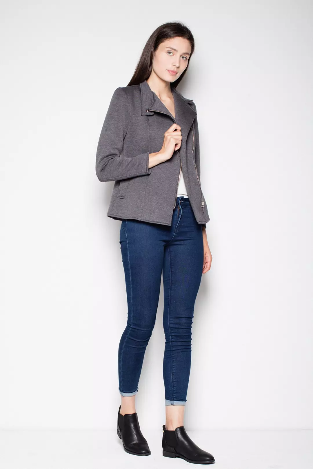 Materiałowa ramoneska damska ze stójką to model, który możesz nonszalancko rozpiąć na dekolcie. Ten trik optycznie wyszczupli górną partię ciała. Kurtka na długości zapinana na jest na zamek. Dopasowany krój podkreśli figurę, a długość do bioder pięknie wyeksponuje ich linię. Ta lekka kurtka świetnie sprawdzi się nie tylko wiosną jako podstawowe okrycie wierzchnie, ale także jesienią lub zimą pod lżejszy płaszcz.