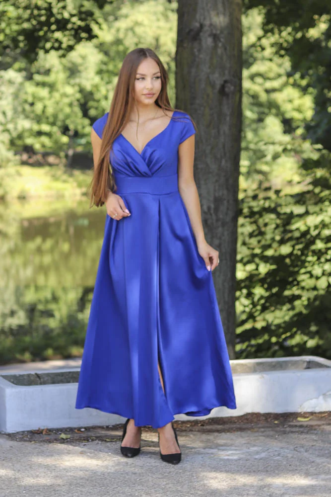 Niezwykła sukienka maxi z subtelnie zaznaczonym rozcięciem na nodze prezentuje się niezwykle elegancko i stylowo. Jej subtelną urodę podkreśla zamek ukryty w tkaninie, dodając jej wyjątkowego charakteru. Ta ponadczasowa kreacja, doskonała zarówno na wesela jak i inne duże uroczystości Emanuje klasycznym wdziękiem. Zmysłowy kopertowy dekolt nie tylko dodaje uroku, ale także podkreśla kobiece atuty, tworząc, wyjątkowy efekt. Sukienka ta jest kwintesencją wyjątkowej elegancji w któej poczujesz się wyjątkowo.