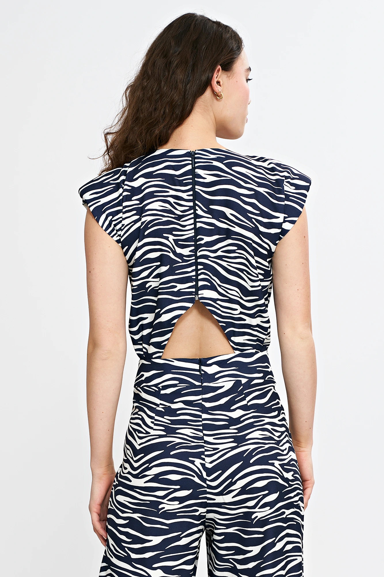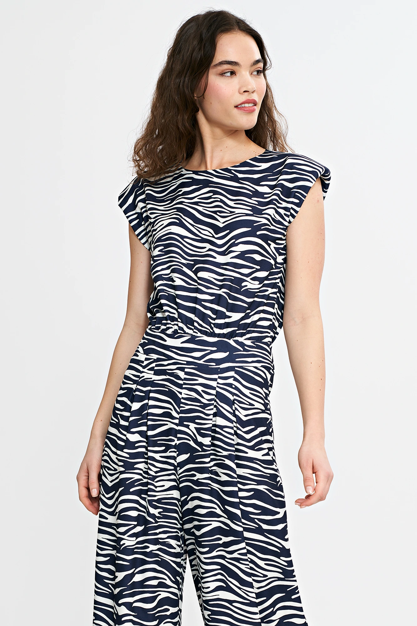 Ten wyjątkowy kombinezon to idealna propozycja dla kobiet, które cenią sobie odważny styl i komfort w jednym. Projekt wyróżnia się efektownym, graficznym wzorem oraz luźną, ale elegancką formą, która podkreśla sylwetkę bez nadmiernego opinania.