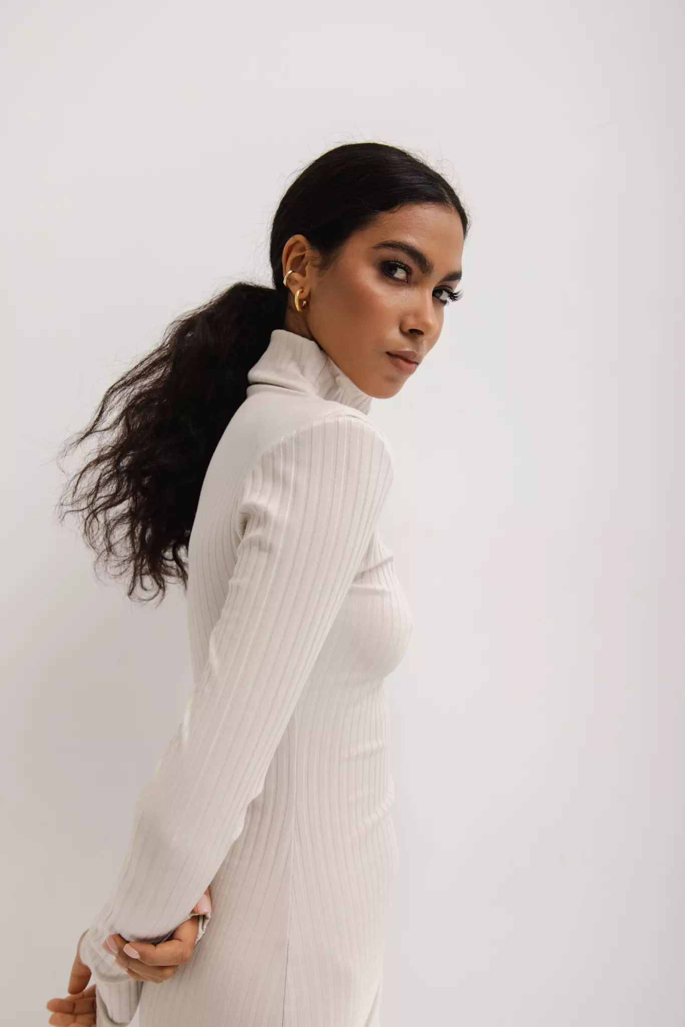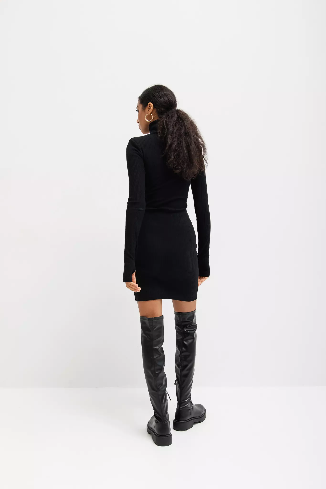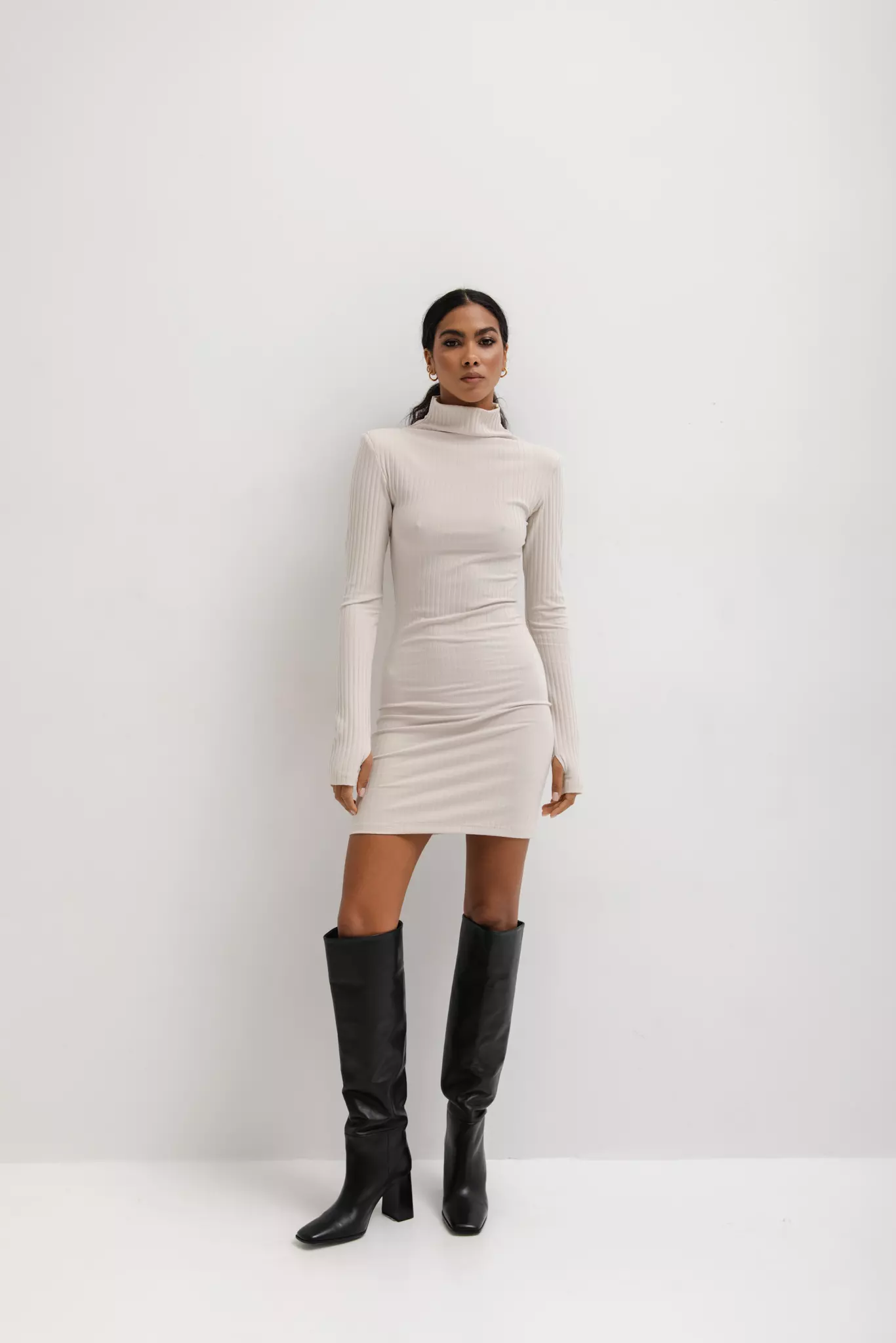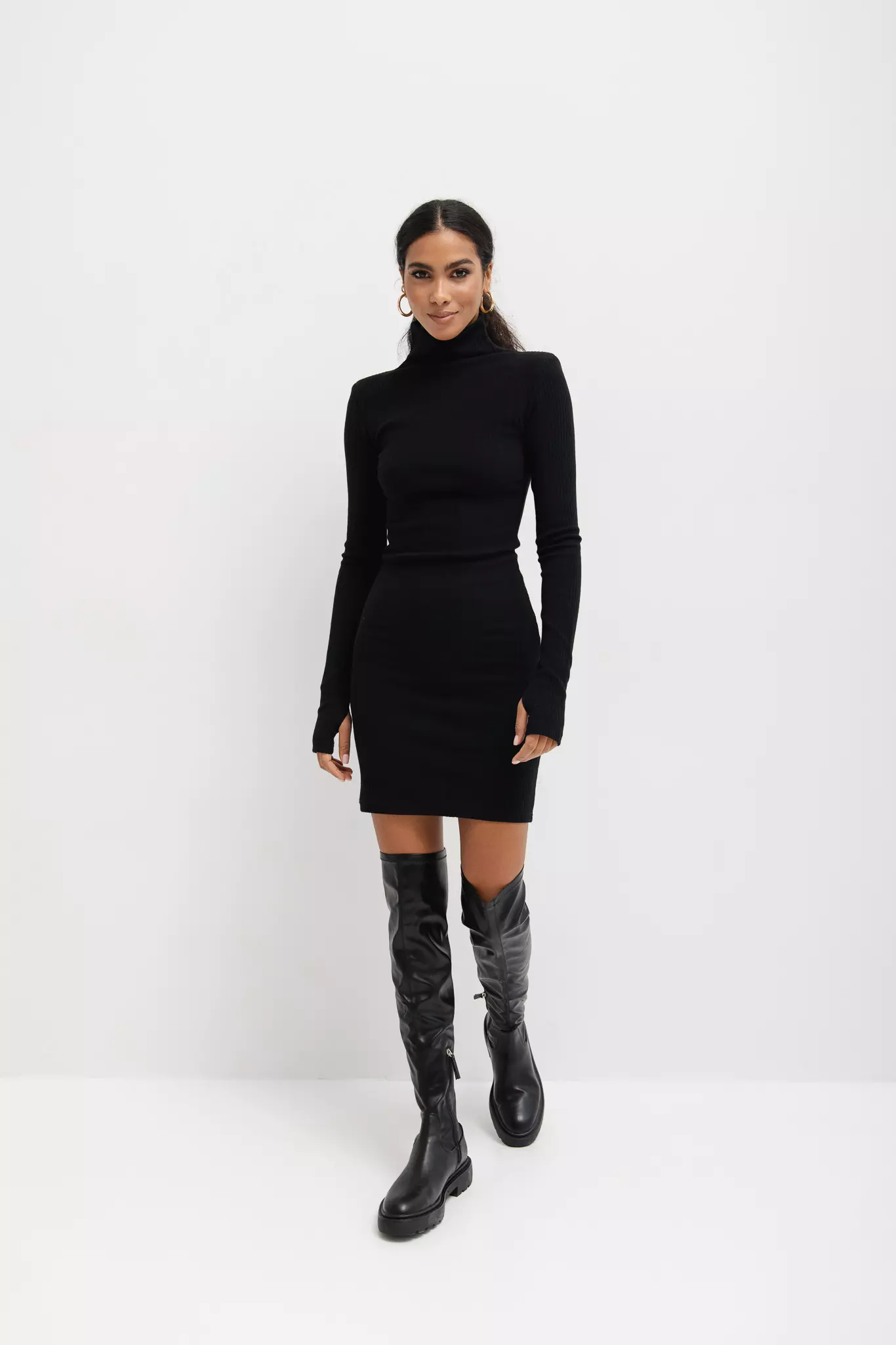 Obcisła sukienka z długim rękawem i golfem to uniwersalny i bardzo kobiecy model, który pięknie podkreśla walory sylwetki i będzie stanowił świetną bazę dla wielu udanych stylizacji na różne okazje. Prążkowana dzianina bawełniana przyjemnie się nosi i dopasowuje do figury. Na ramionach zostały wszyte poduszeczki, dzięki którym fason trzyma elegancką formę. Dekolt w formie golfa i długość przed kolano dają mnóstwo możliwości stylizacyjnych, a prostota kroju pozwala na bardzo swobodny wybór biżuterii i dodatków.