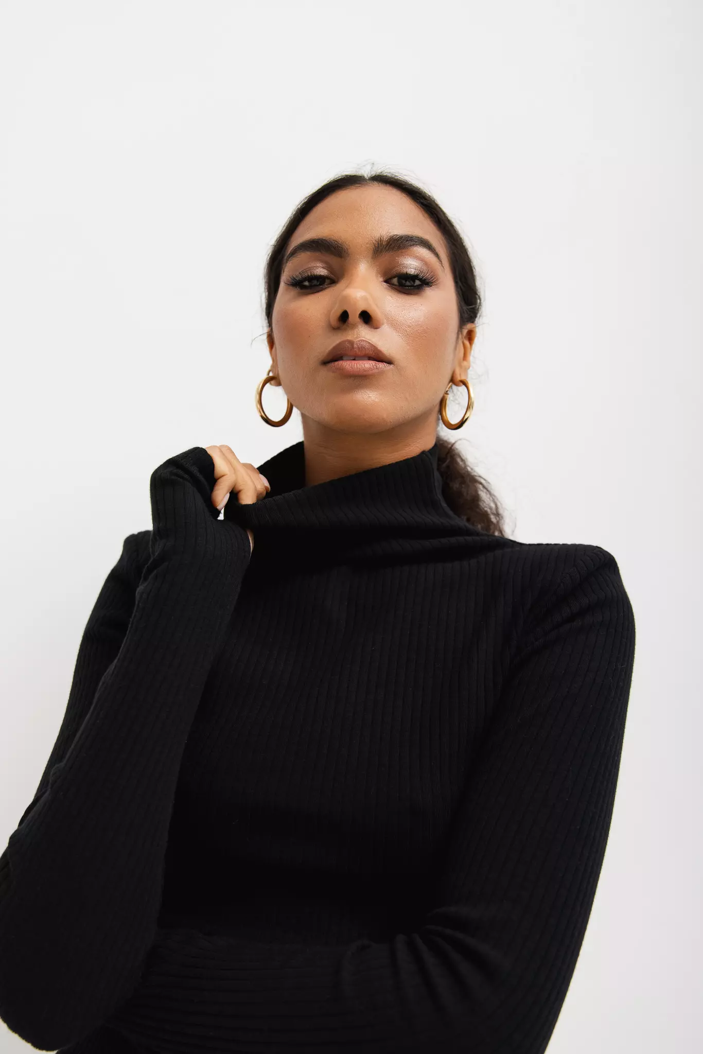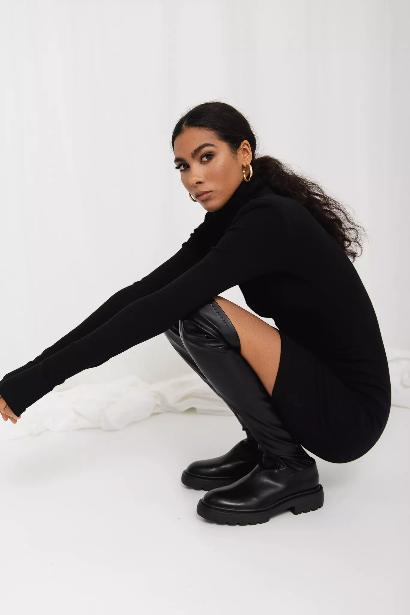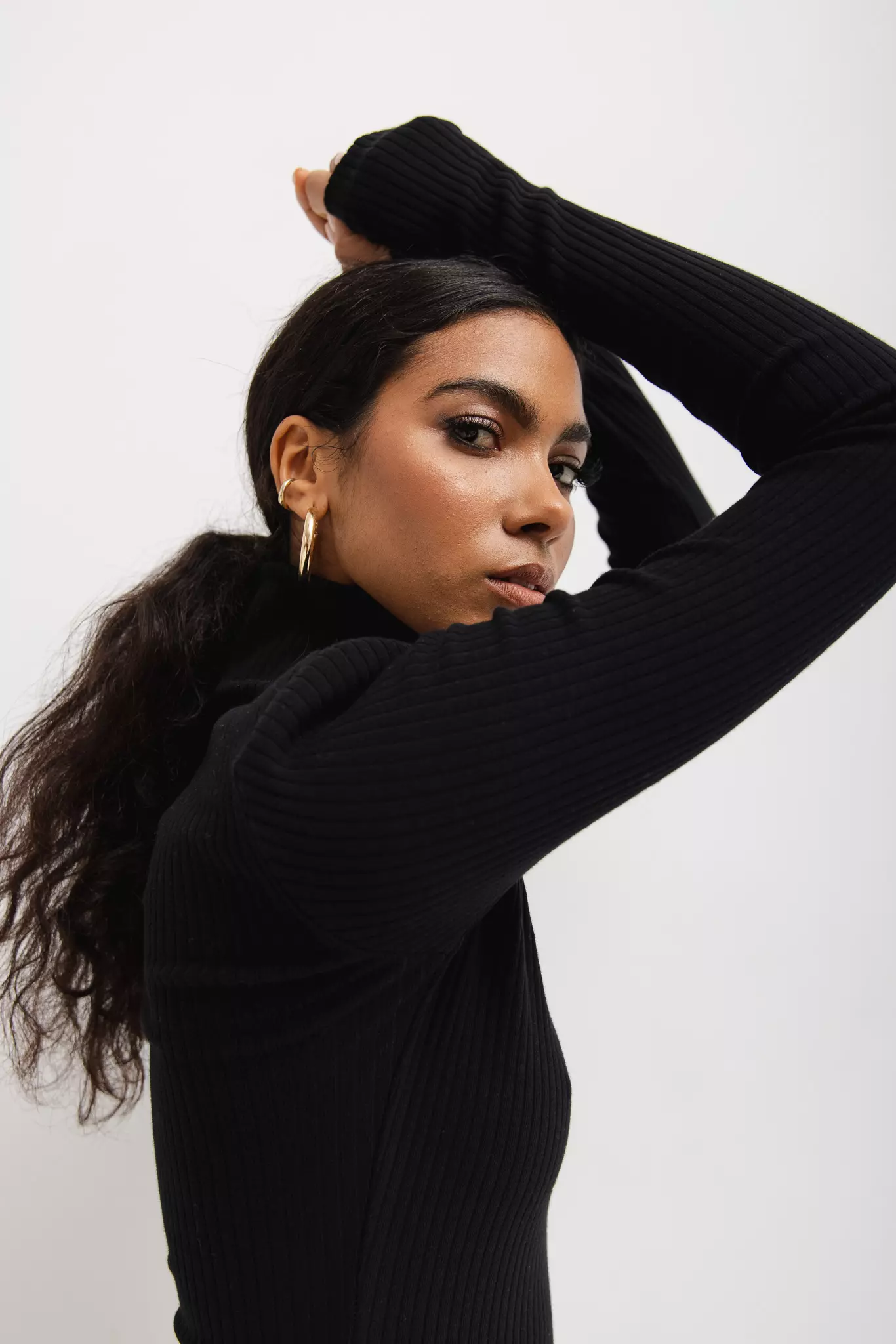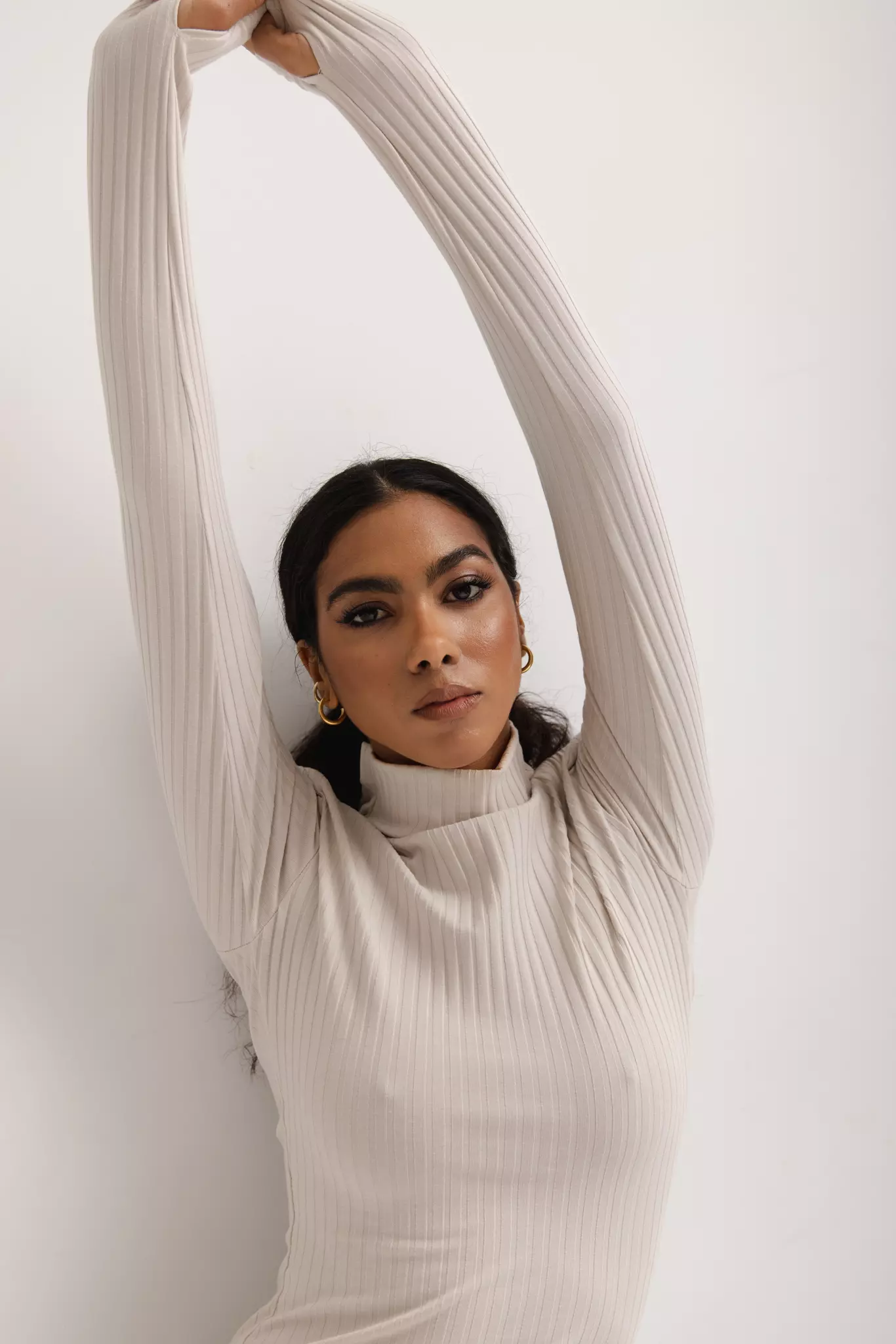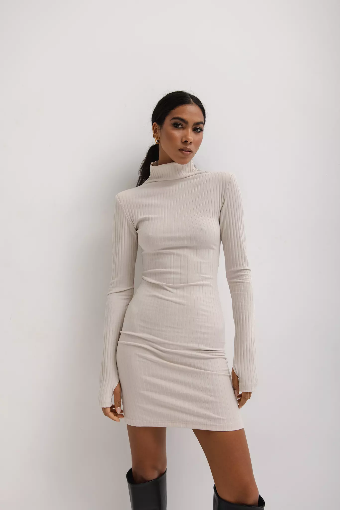 Obcisła sukienka z długim rękawem i golfem to uniwersalny i bardzo kobiecy model, który pięknie podkreśla walory sylwetki i będzie stanowił świetną bazę dla wielu udanych stylizacji na różne okazje. Prążkowana dzianina bawełniana przyjemnie się nosi i dopasowuje do figury. Na ramionach zostały wszyte poduszeczki, dzięki którym fason trzyma elegancką formę. Dekolt w formie golfa i długość przed kolano dają mnóstwo możliwości stylizacyjnych, a prostota kroju pozwala na bardzo swobodny wybór biżuterii i dodatków.