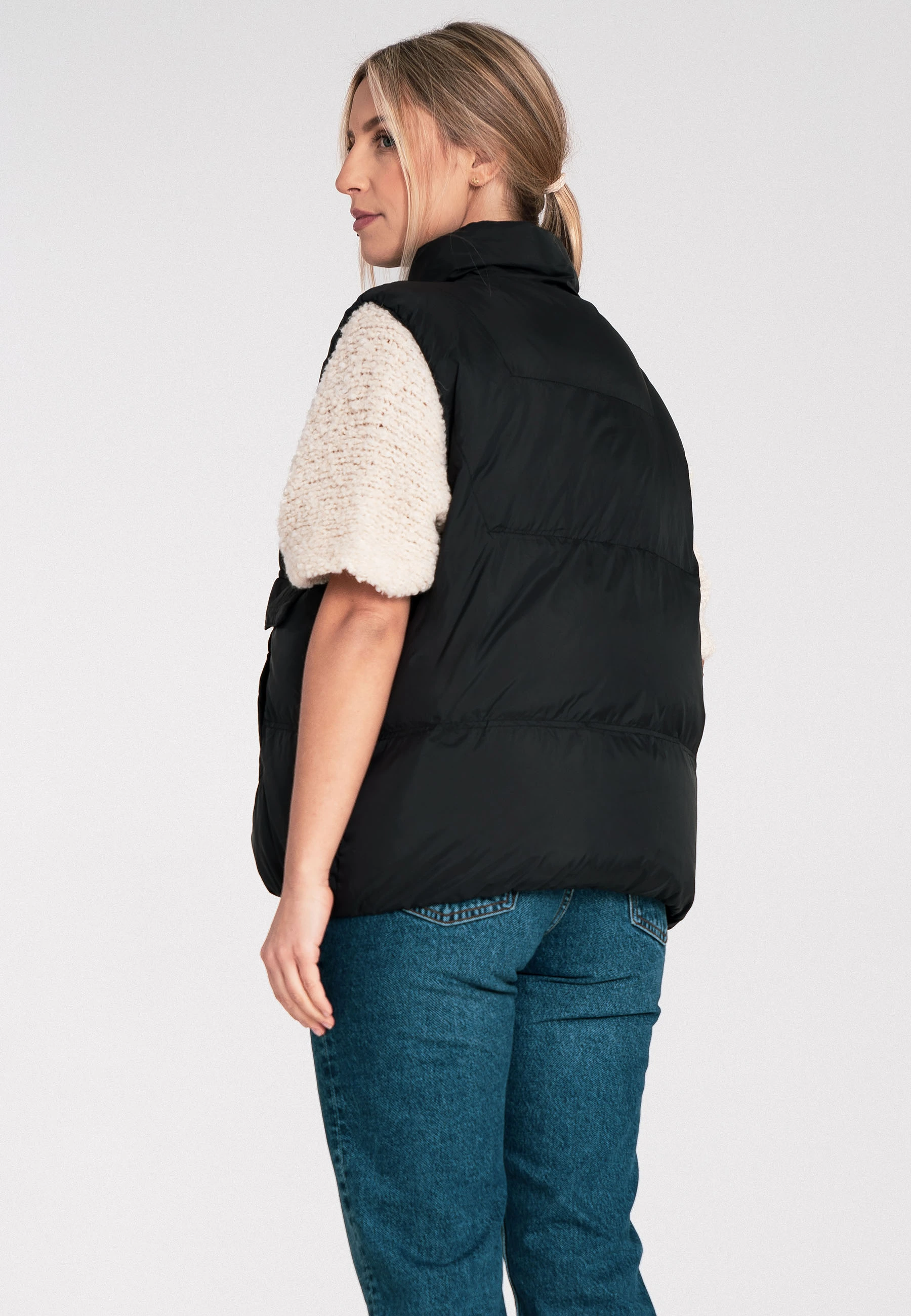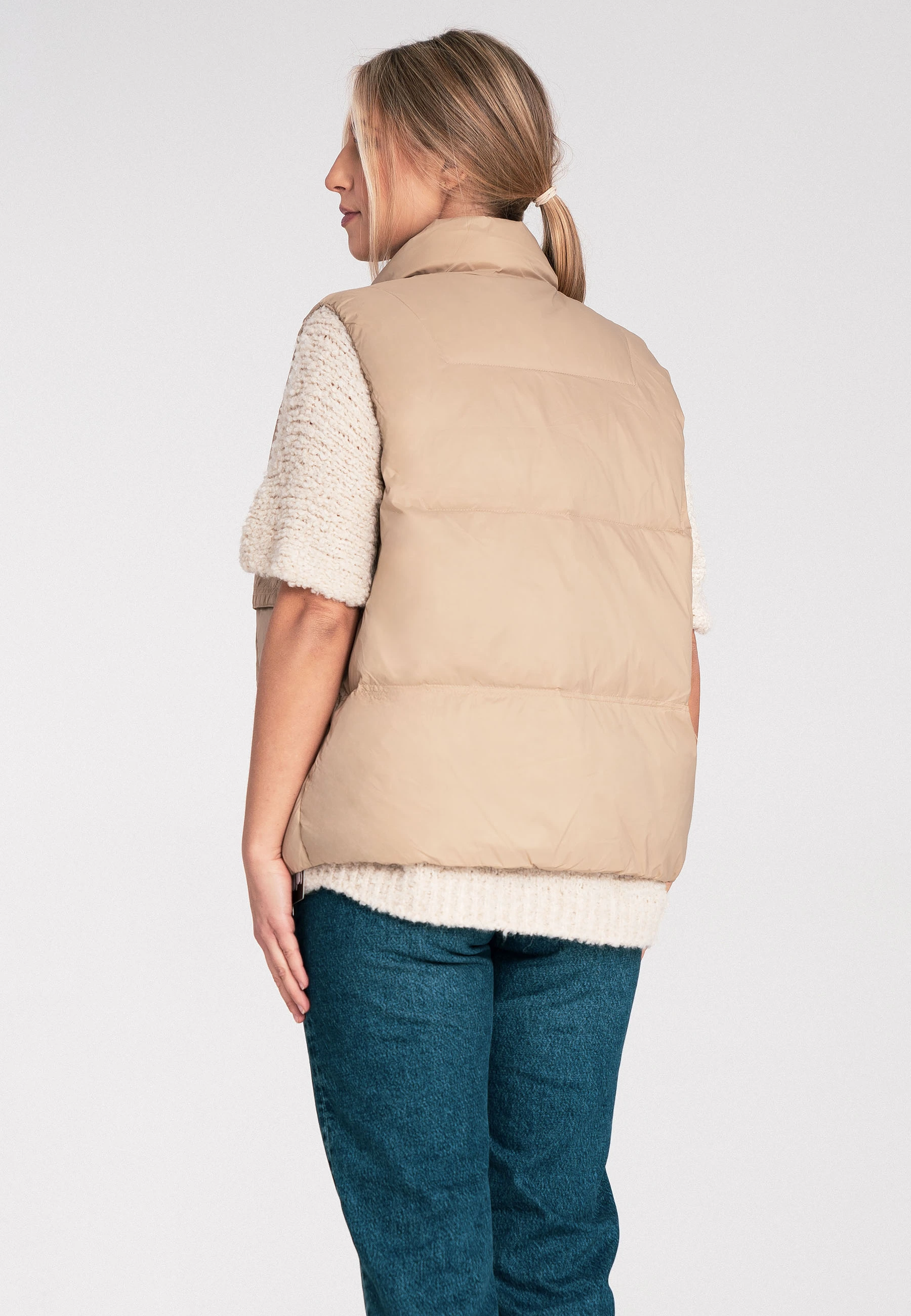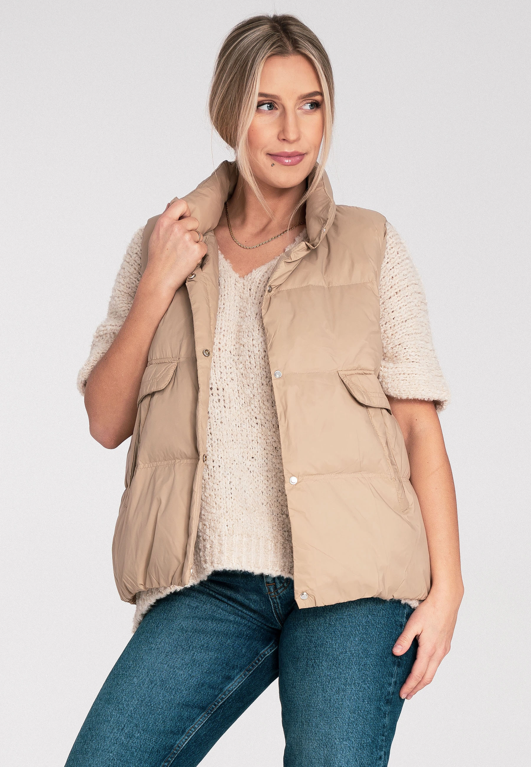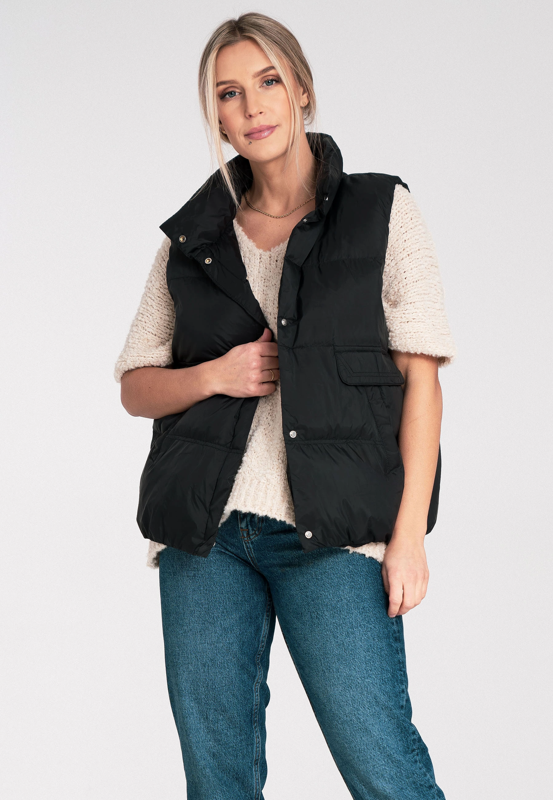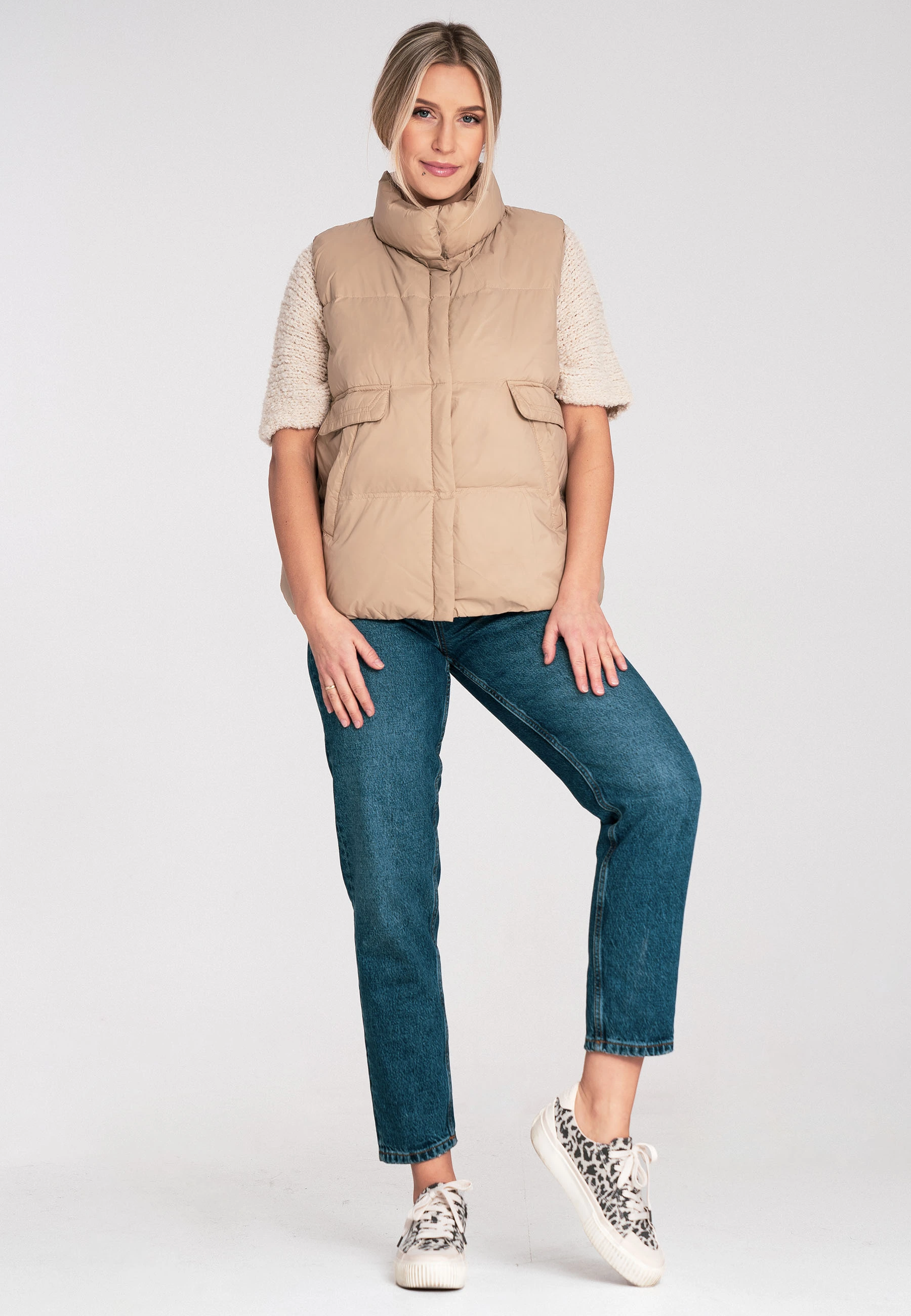 Pikowana kamizelka damska z kołnierzem stójką i kieszeniami