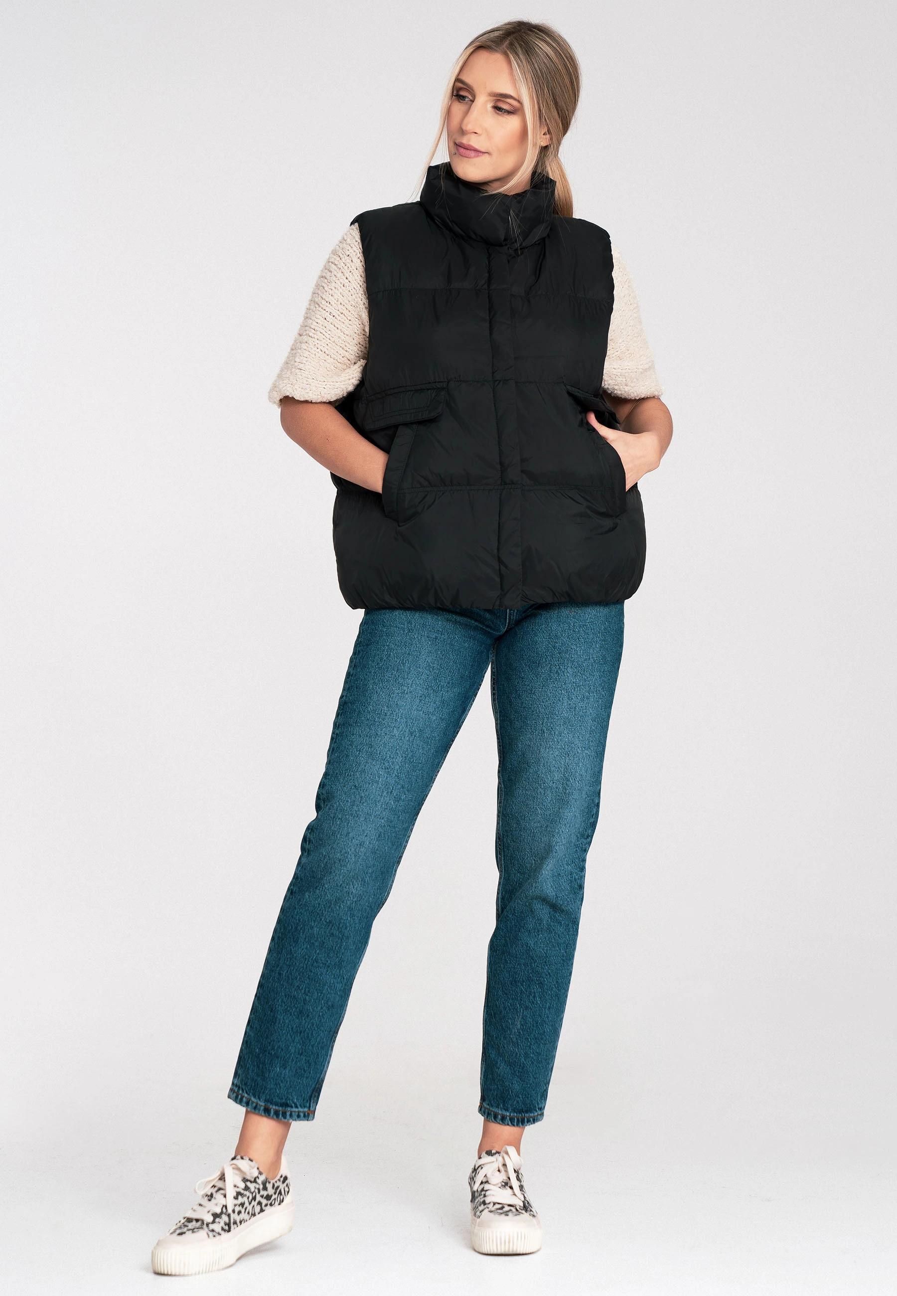 Pikowana kamizelka damska z kołnierzem stójką i kieszeniami to praktyczne okrycie wierzchnie na sezon przejściowy, idealne do stylizacji warstwowych. Pikowana konstrukcja zapewnia komfort termiczny, a jednocześnie pozostaje lekka i wygodna w noszeniu. Wysoka stójka osłania szyję i dodaje sportowo-miejskiego charakteru, dzięki czemu kamizelka pasuje zarówno do swetrów, jak i bluz. Zapięcie na napy ułatwia szybkie zakładanie oraz dopasowanie do temperatury. Funkcjonalne kieszenie zwiększają wygodę na co dzień i pozwalają mieć pod ręką drobiazgi. To model, który sprawdzi się w mieście, na spacerze i w podróży.