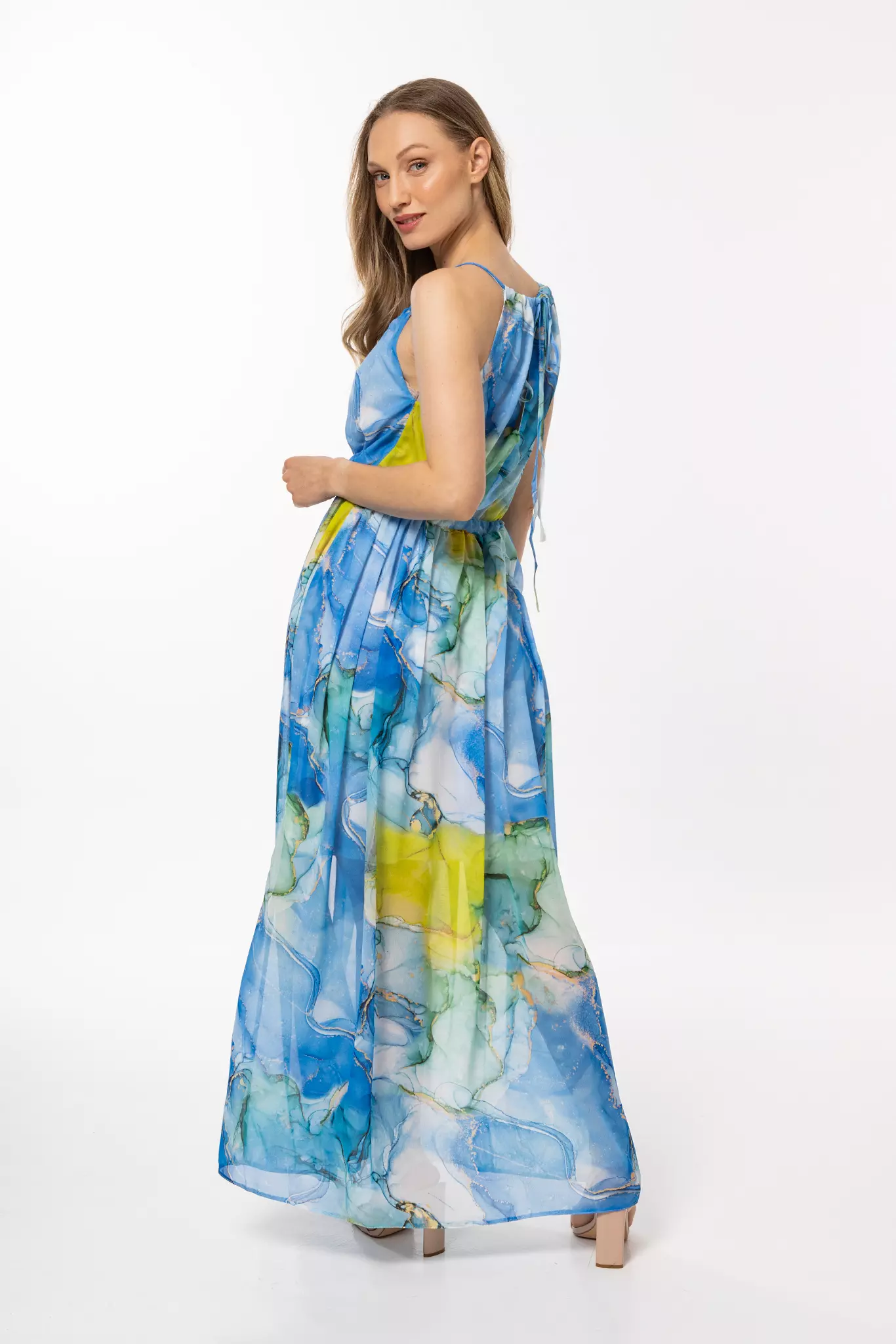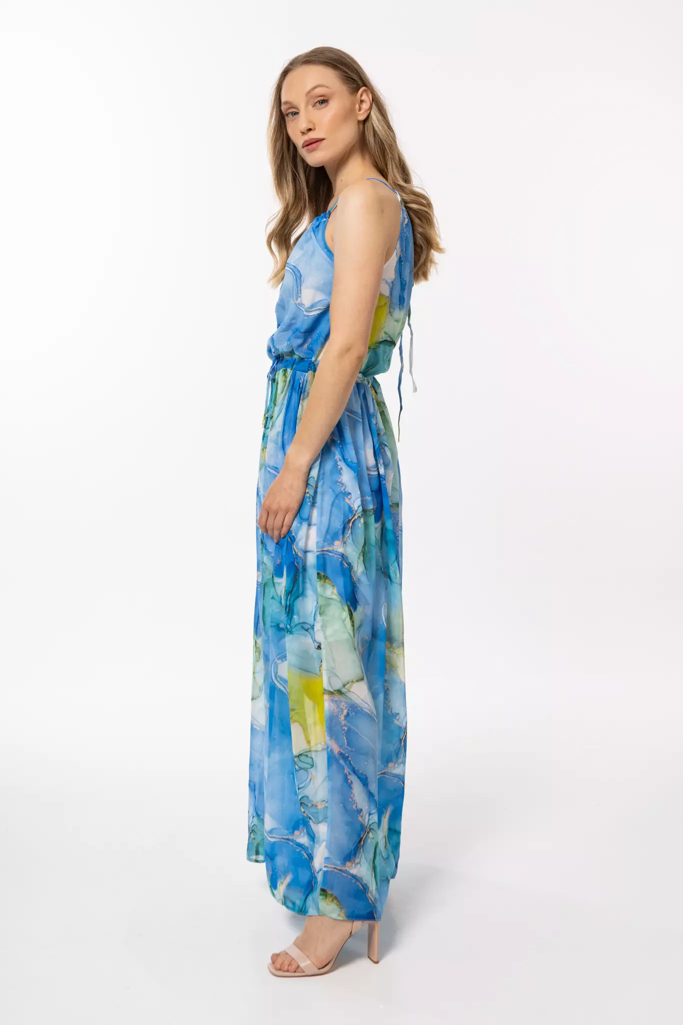 Długa sukienka z dekoltem halter na wesele to uroczy model podkreślający walory sylwetki. Wykonana z lekkiego, przewiewnego materiału, sukienka zapewnia wygodę noszenia nawet w najbardziej upalne dni. Fason sukienki jest luźny, z delikatnie zwężaną talią, co podkreśla sylwetkę, a jednocześnie pozostaje wygodny. Dół sukienki jest rozkloszowany, z efektownym rozcięciem, które dodaje lekkości i dynamiki całej stylizacji. Dekolt sukienki jest okrągły, a cienkie ramiączka zapewniają dodatkową przewiewność i komfort.